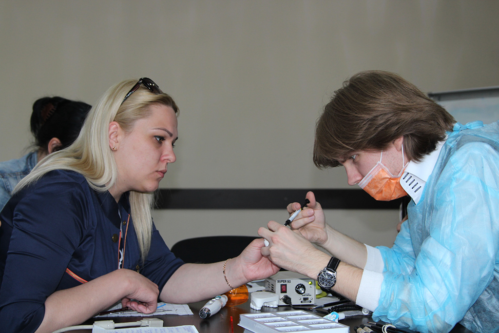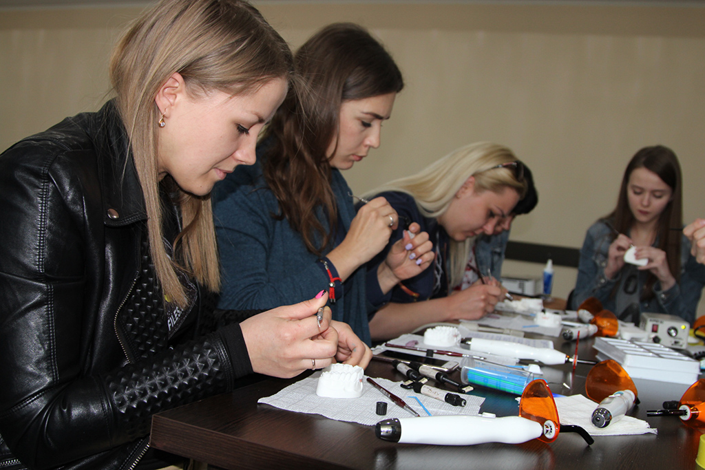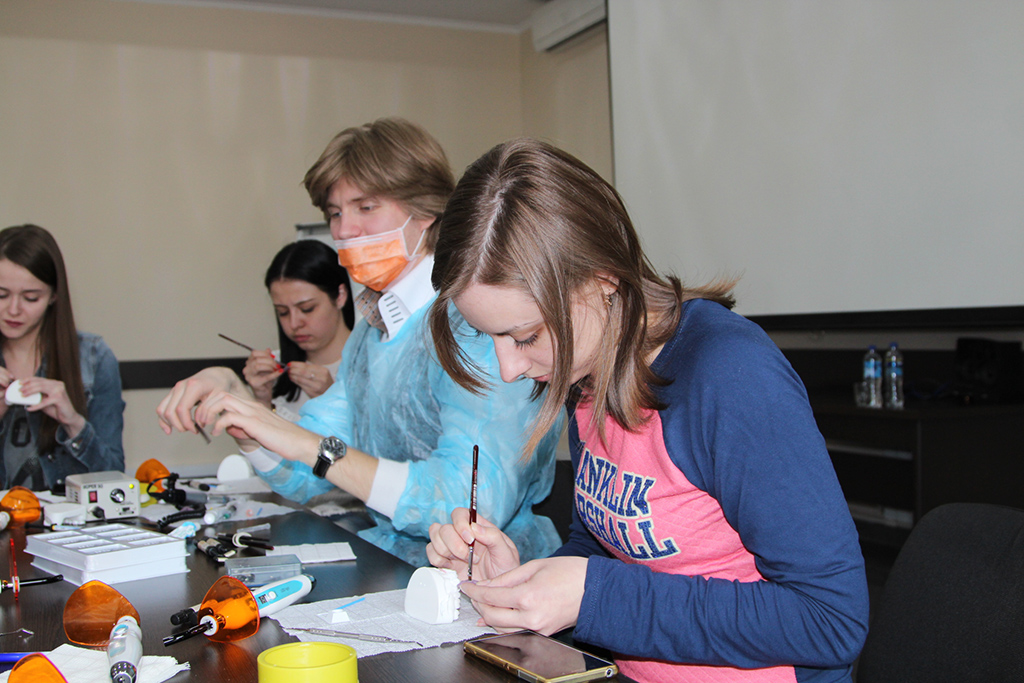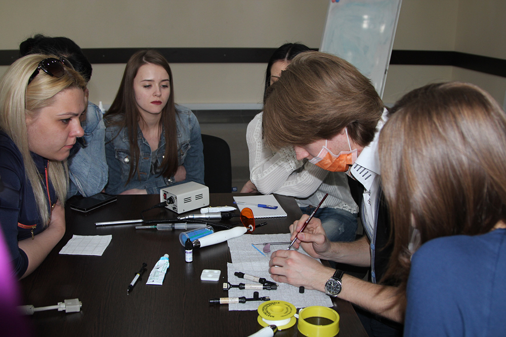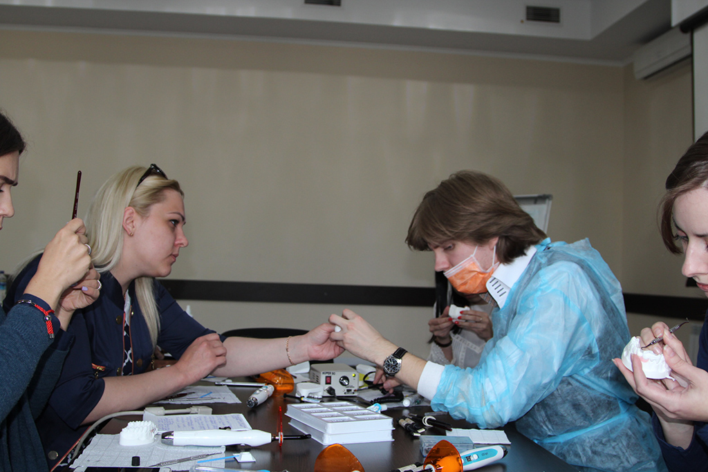 Теория была закреплена практическими занятиями. Дмитрий Петрович сначала личным примером продемонстрировал разные техники пломбирования, затем под чутким руководством лектора каждый участник закрепил свои навыки.
