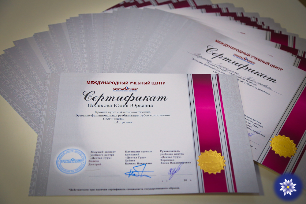 Практические знания были насыщенными. Дмитрий Петрович наблюдал за работой каждого учащегося. При необходимости подсказывал либо личным примером демонстрировал технику наложения слоев композитов. Затем в торжественной атмосфере вручил сертификаты об окончании курсов