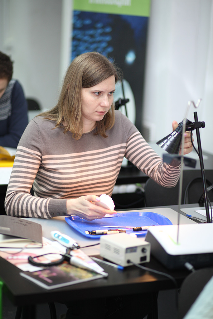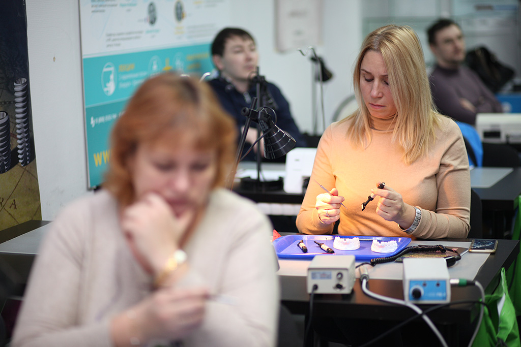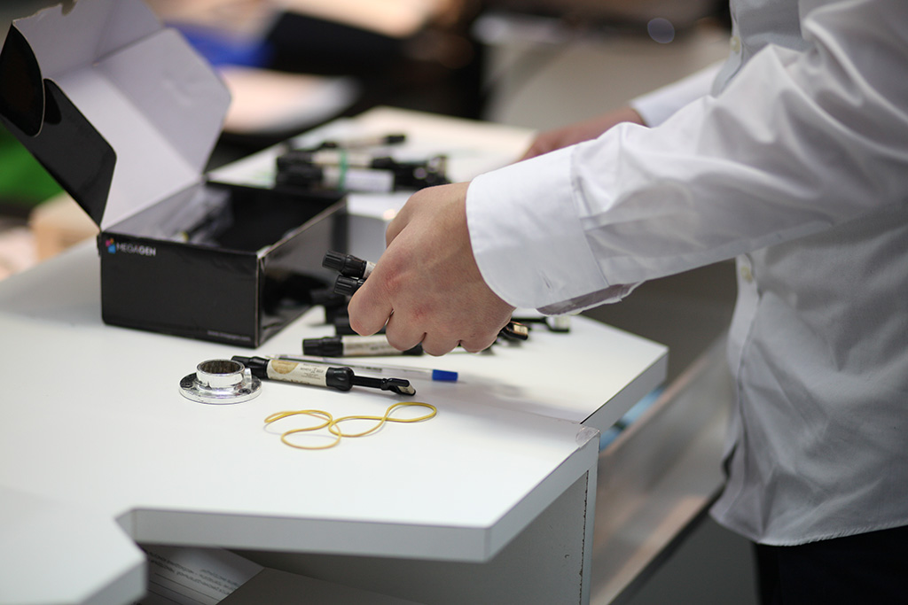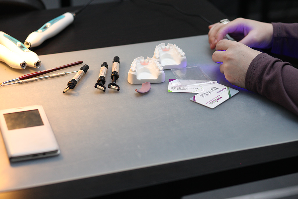 Завершился курс практическим занятием, на котором участники смогли освоить следующие техники: изоляция рабочего поля, техника наложения раббердама, изготовление силиконового ключа, реставрация полости 4 класса с применением нанокомпозитного материала, восстановление контактного пункта, финишная обработка реставрации, полирование зубов.