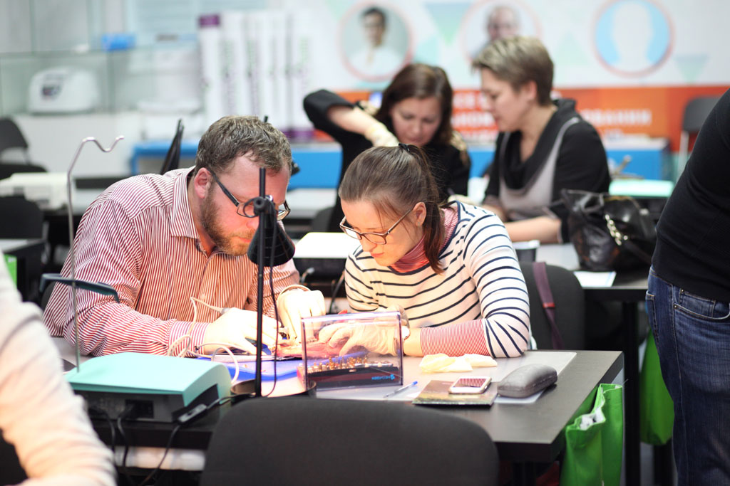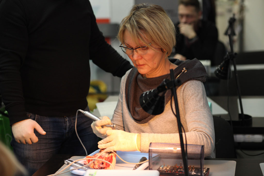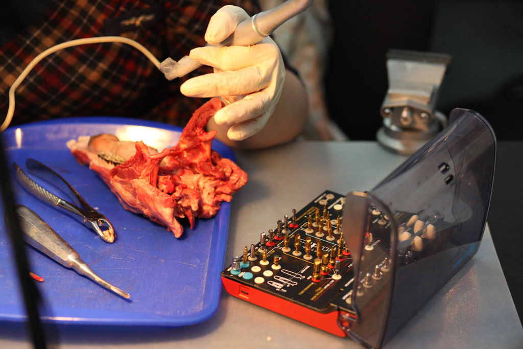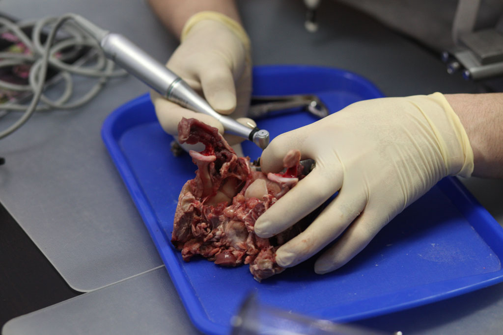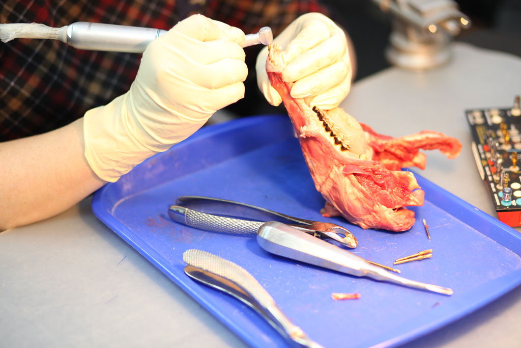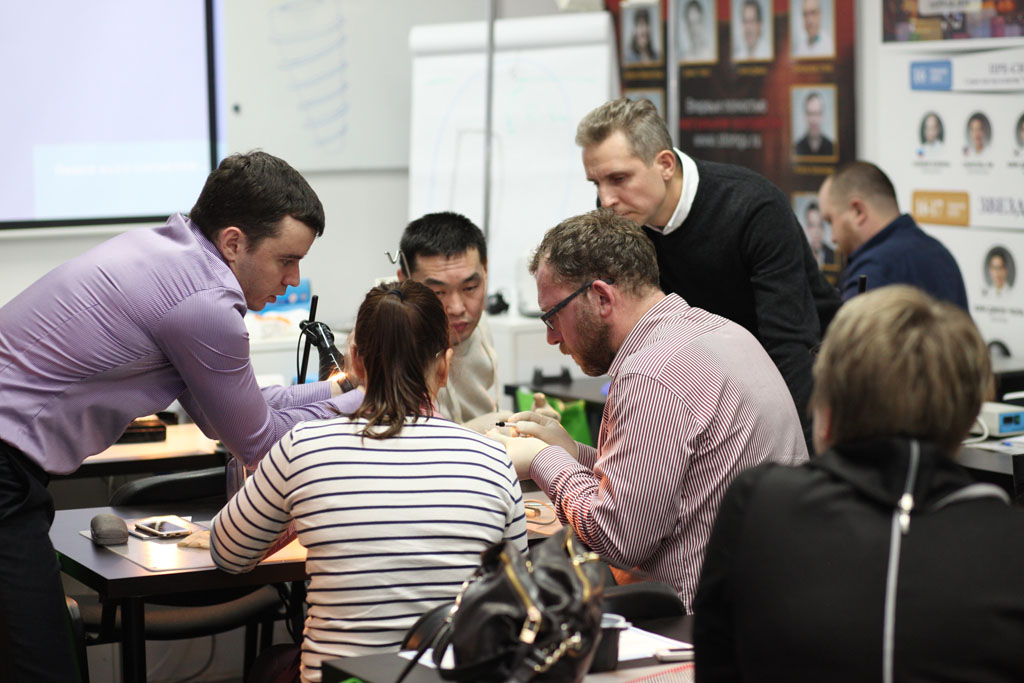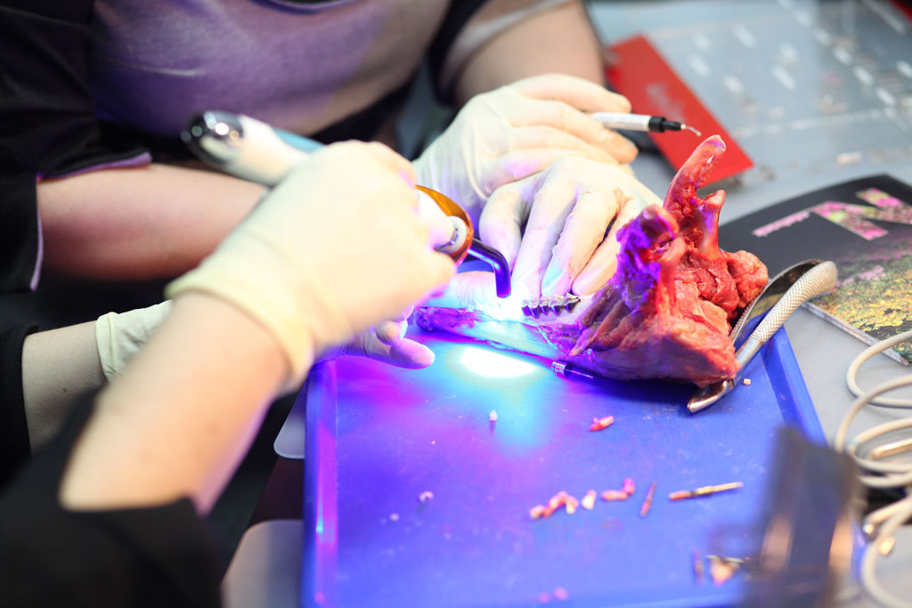 На практическом занятии участники отрабатывали техники удаления зуба на бараньей челюсти, устанавливали имплантат с помощью шаблона, фиксировали постоянный абатмент, изготавливали временную коронку для провизионализации на модели. По итогам курса все участники получили именные сертификаты.