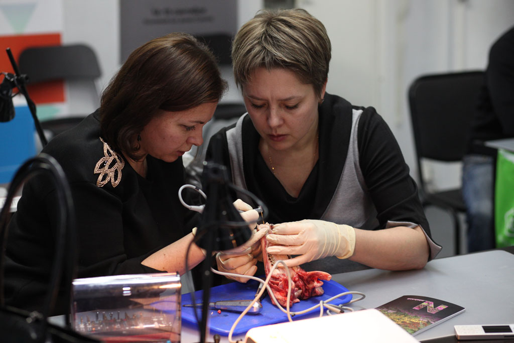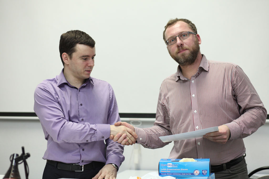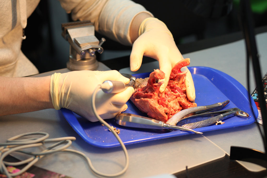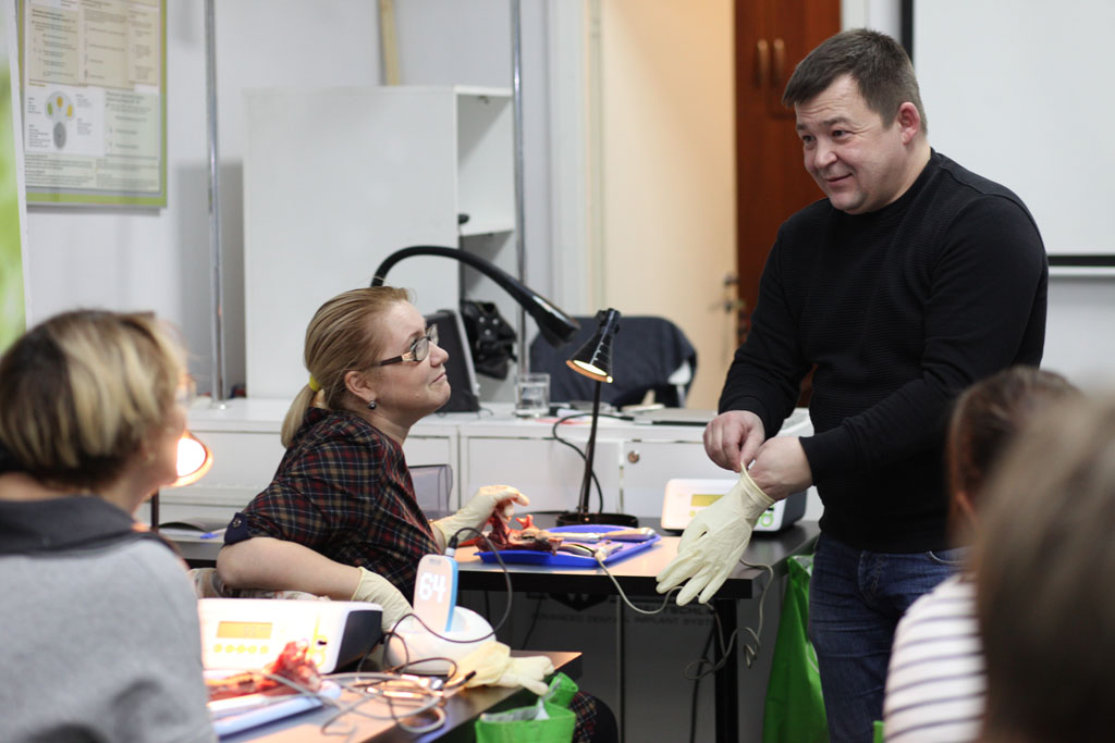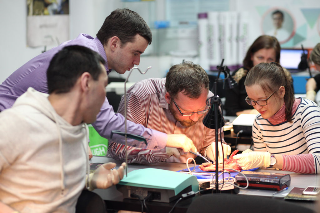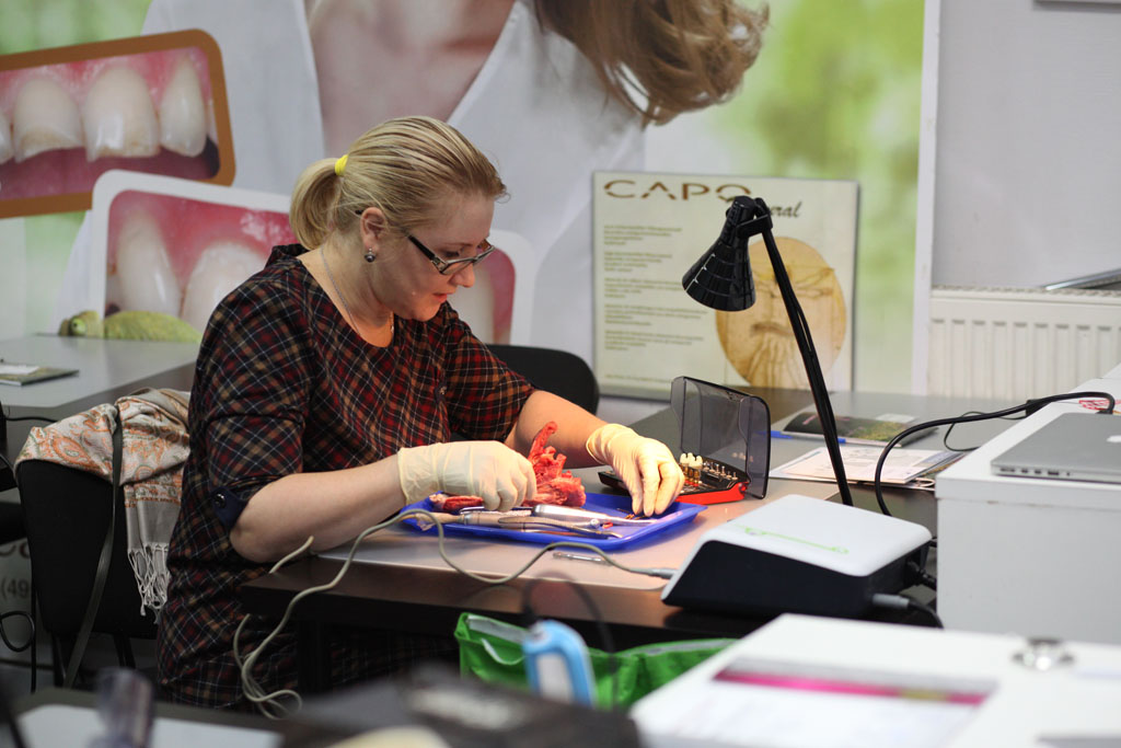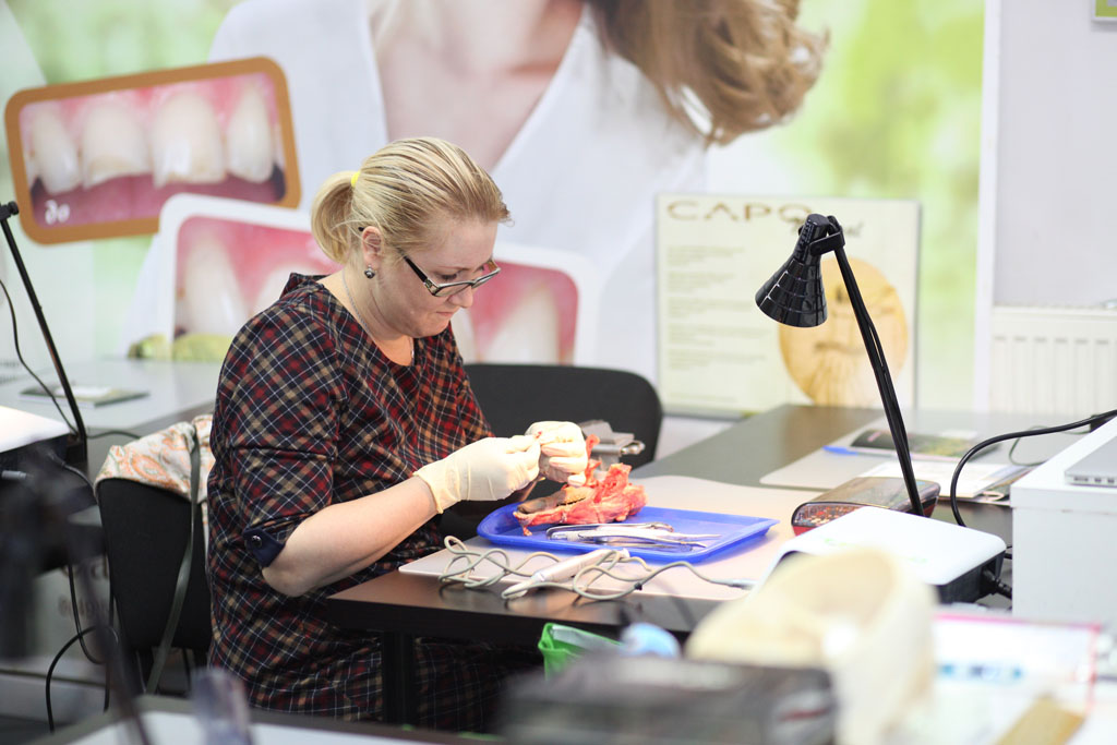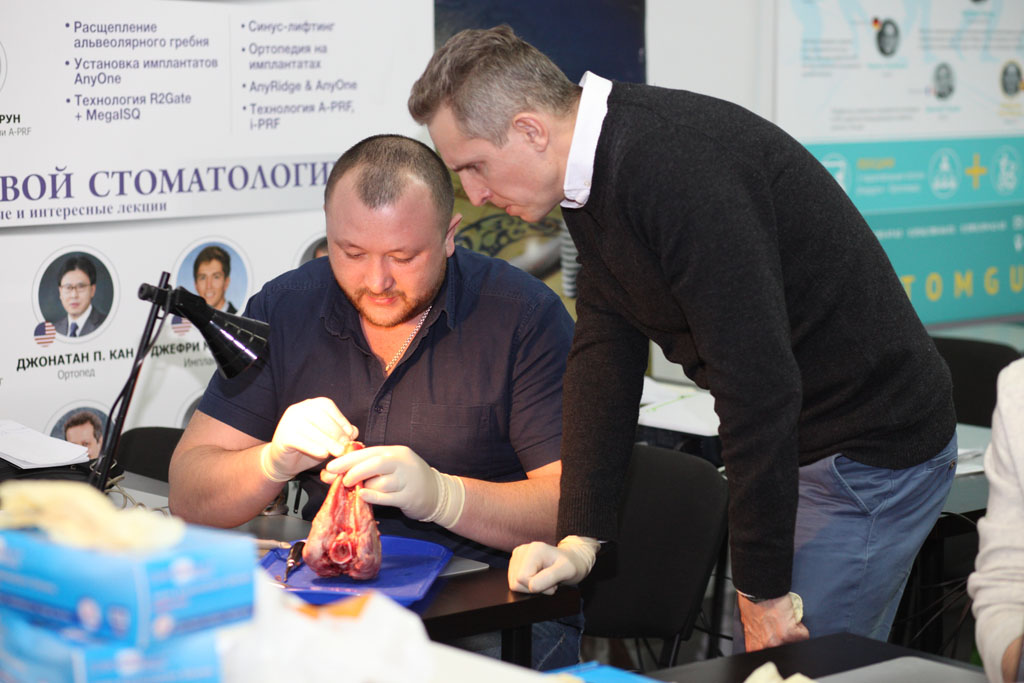 На практическом занятии участники отрабатывали техники удаления зуба на бараньей челюсти, устанавливали имплантат с помощью шаблона, фиксировали постоянный абатмент, изготавливали временную коронку для провизионализации на модели. По итогам курса все участники получили именные сертификаты.