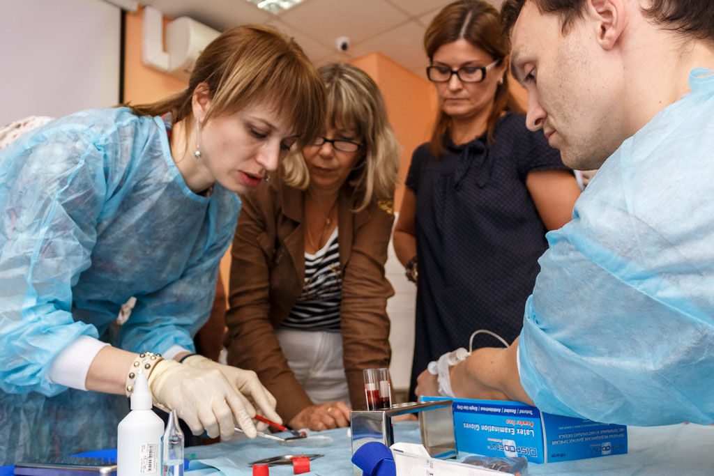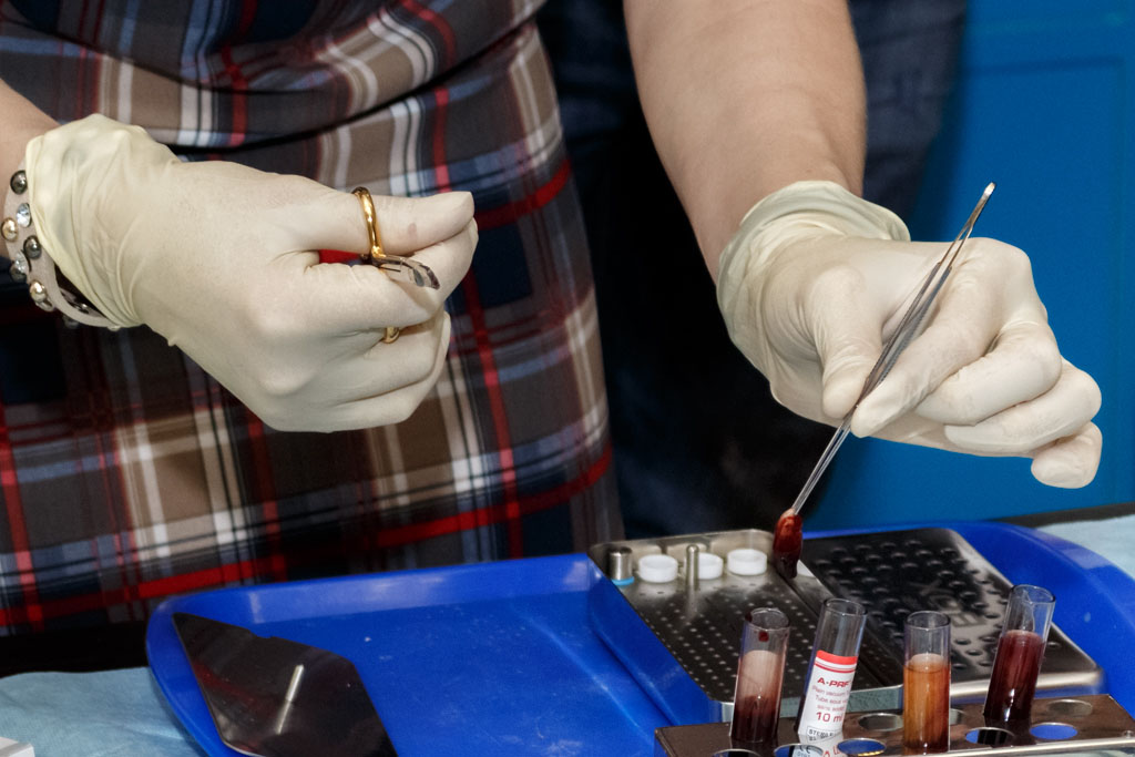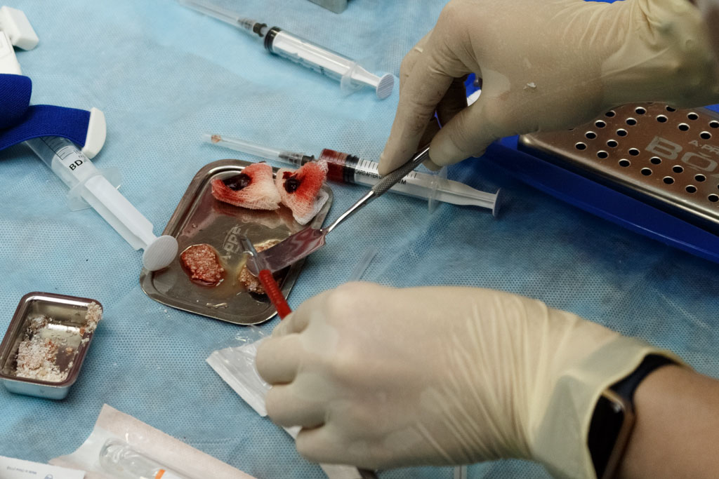 На практической части мастер-класса у доноров брали кровь, следуя строгому порядку действий при одновременном заборе IPRF и APRF; совершали центрифугирование взятой крови для получения правильного фибринового сгустка и его дальнейшего применения при парадонтитах, парадонтологических лечениях, применения технологии IPRF в косметологии и в других областях.