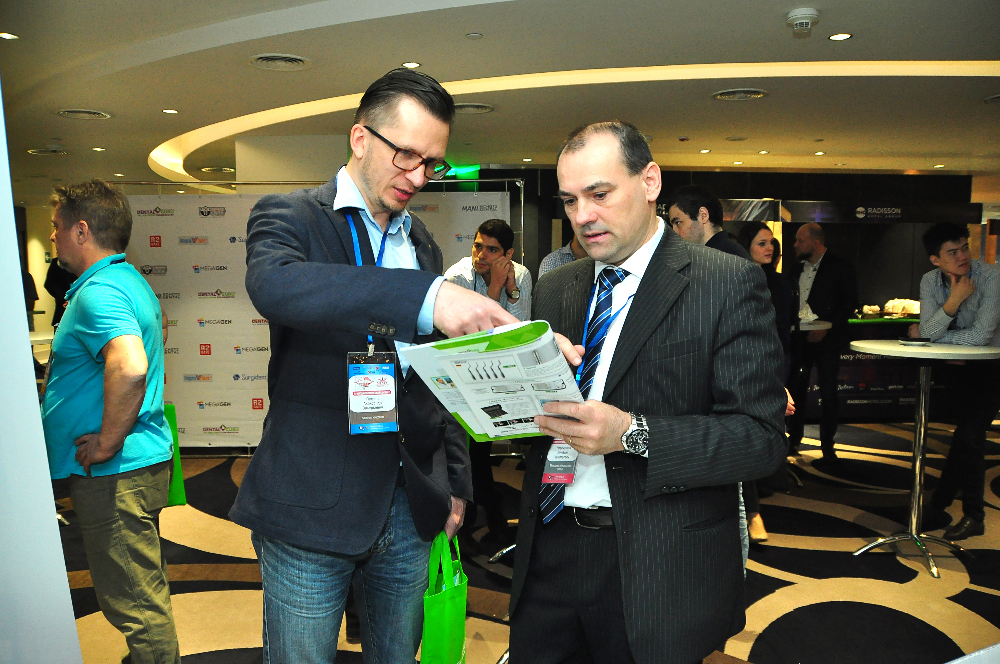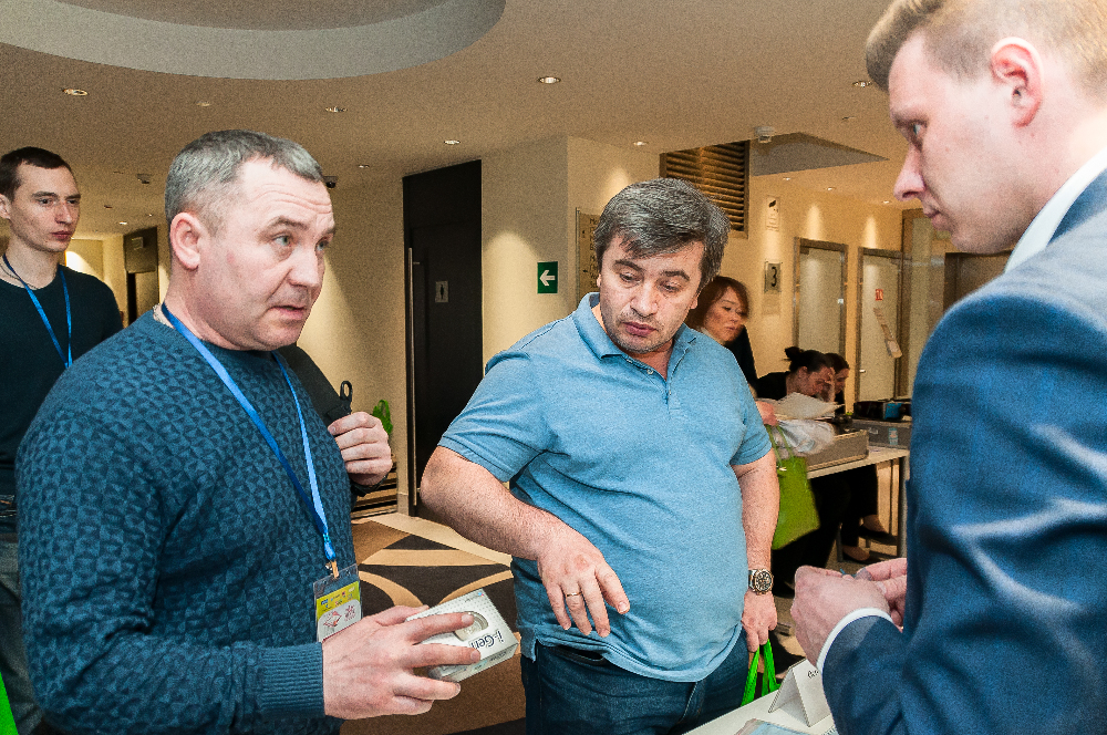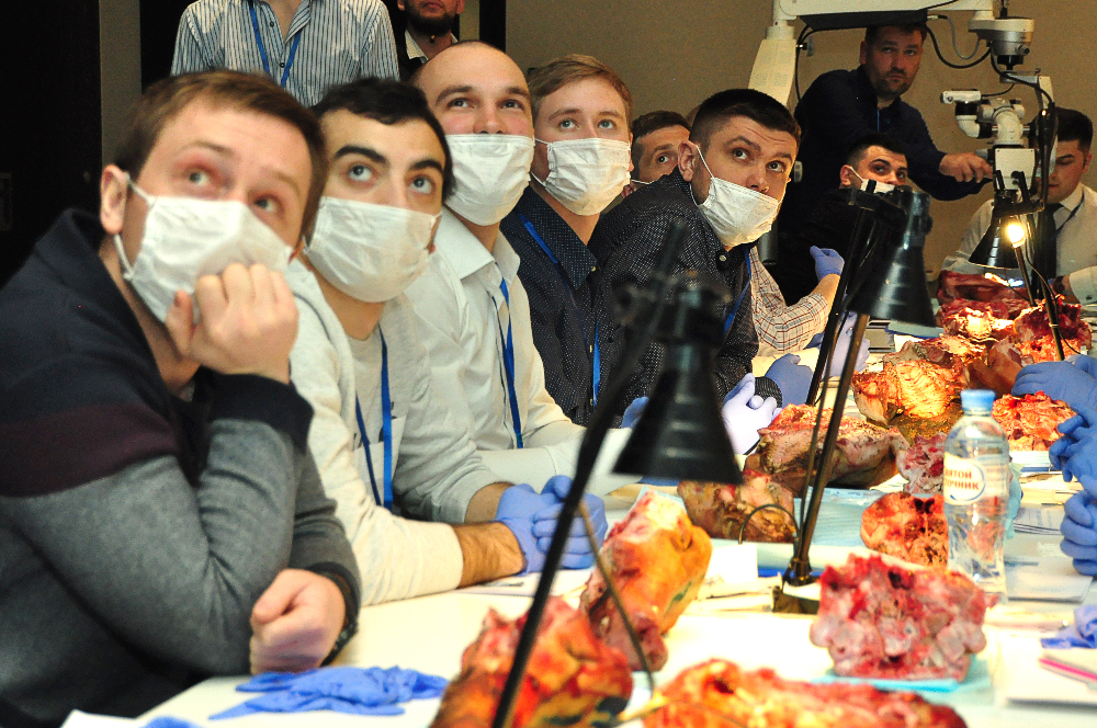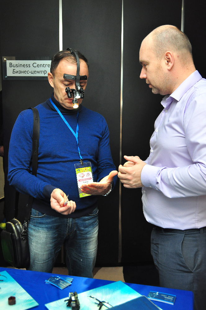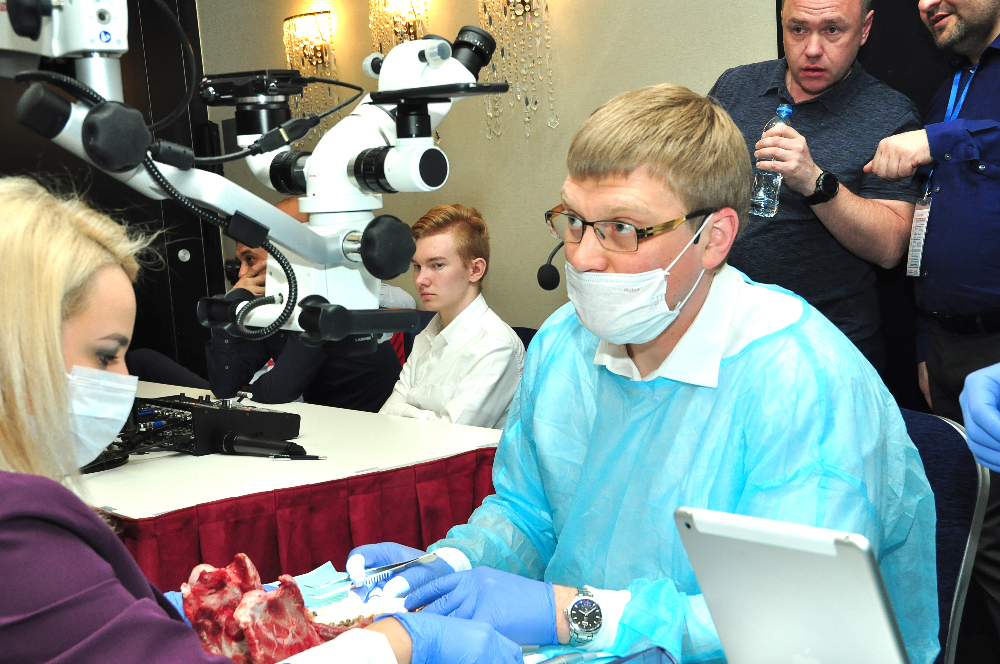 После перерыва главный конференц-зал Radisson Blu Belorusskaya был трансформирован и превратился в три отдельных помещения, в которых были расставлены столы со специальным оборудованием (микроскопами, необходимыми наборами инструментов, новинками-моделями с имитацией зуба и кости).
