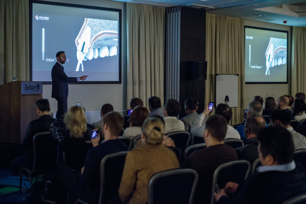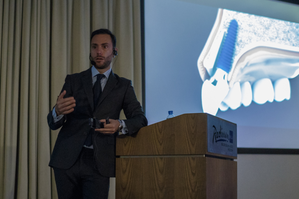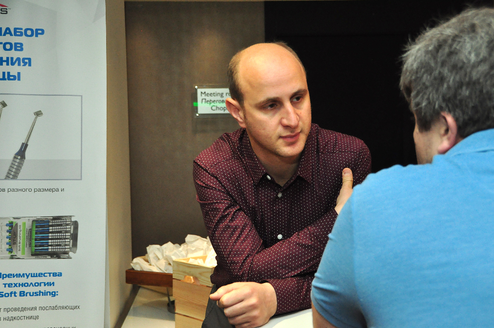Параллельно в соседнем зале проходил второй мастер-класс на тему: «Освоение методики «корневого щита» на специальных моделях с имитацией зуба и кости». Его проводил Митсиас Мильтиадис. Зарубежный врач-имплантолог подробно рассказал обо всех деталях и особенностях техники. Интерактивным способом шаг за шагом провел участников по всему пути сложной операции, наглядно продемонстрировав с помощью микроскопа, транслируемого видео на общий экран установку имплантатов по методике «корневого щита» с использованием набора инструментов «Rootmembranekit».