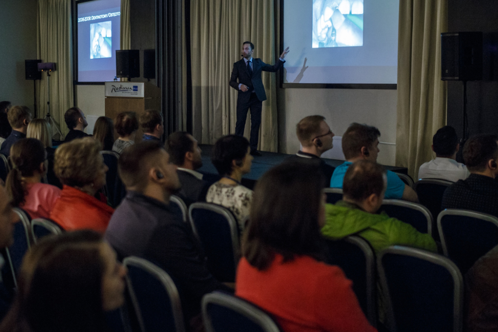 В третьем зале с базовым курсом на тему: «Мягкотканнаяаугументация. Способы получения свободного соединительно-тканного аутотрансплантата» выступал Софронов Матвей Витальевич. Доктор передавал личный опыт и материал об основных донорских зонах для забора соединительно-тканных аутотрансплантатов, продемонстрировал успешный забор свободного соединительно-тканного аутотрансплантата: с бура верхней челюсти, с неба.Учил имплантологовбезошибочно изготавливать шаблон для забора свободного десневогоаутотрансплантата. А также быстро и правильно ушивать донорские зоны: простым узловым швом, швом обвивным и непрерывным, делать надкостничные швы и не только.