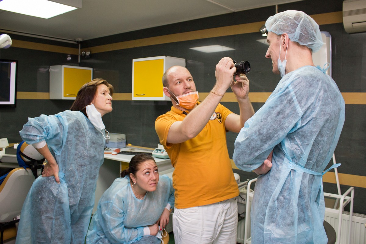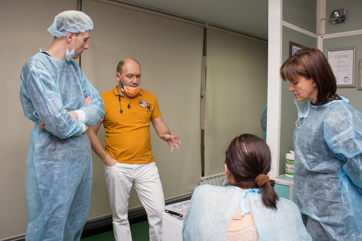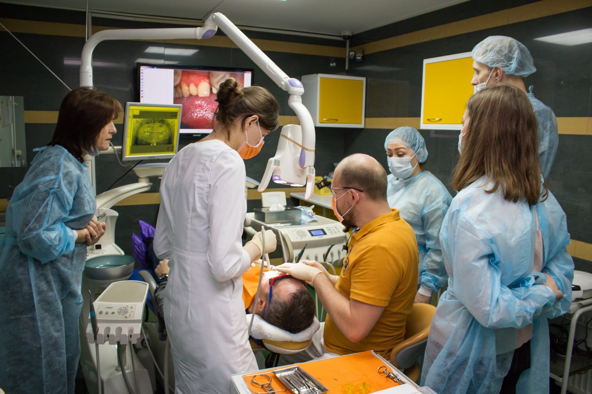 Операции демонстрировались как на экране, расположенном в кабинете, так и в непосредственной близости у пациента. Упор был сделан на наиболее интересные и сложные случаи, среди которых можно выделить костную пластику и одномоментную имплантацию. В перерывах между операциями Камиль Наильевич отвечал на все поступающие от участников курса вопросы и делился тонкостями и секретами работы. Участники курса также смогли оценить в работе различную стоматологическую продукцию, инструменты и приборы, представленные торговым домом "Дентал Гуру". Помимо прочего всем присутствующим довелось ознакомиться с организацией приема в клинике.