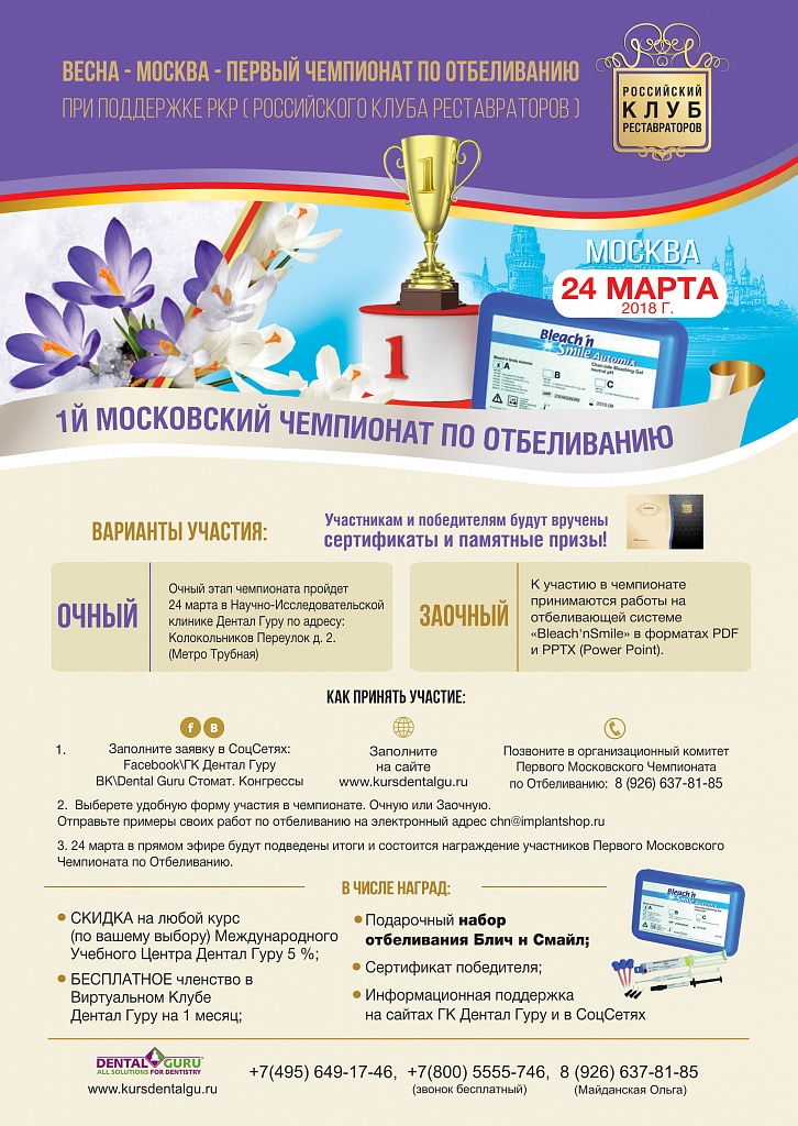 Информируем Вас, о том что 1-й Московский Чемпионат по отбеливанию перенесен с 3 марта на 24 марта 2018 года