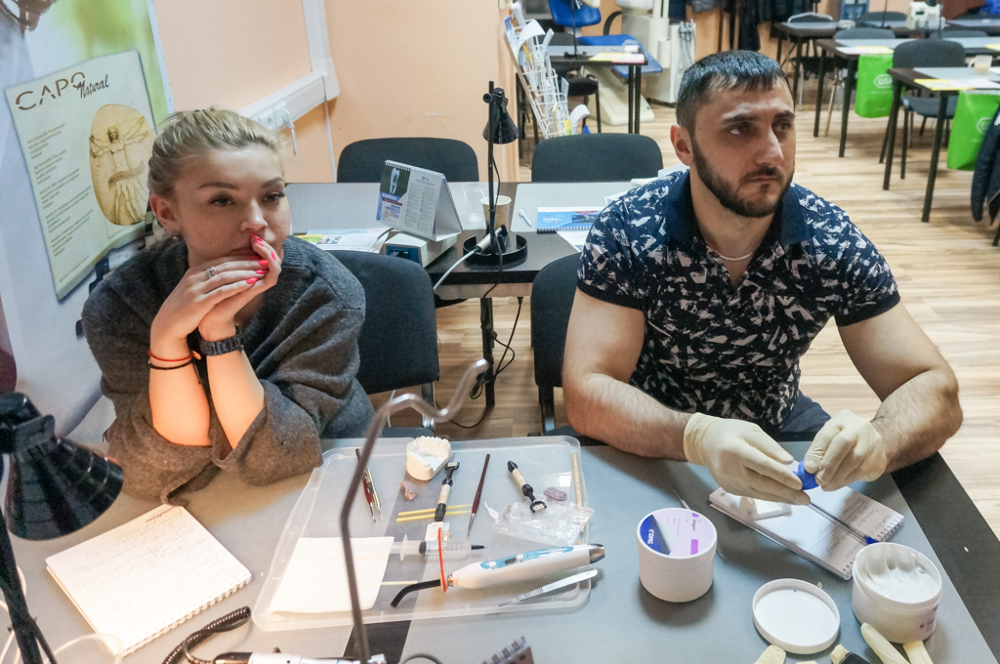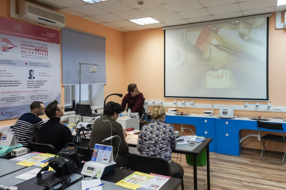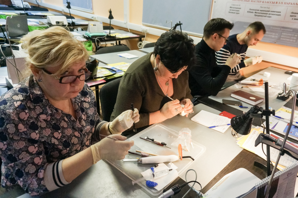 На практической части доктора изучали методы изоляции рабочего поля, технику наложения раббердама. Изготовление силиконового ключа. Подробно рассматривались этапы реставрации полости 4 класса с применением материала «Capo». А еще Дмитрий Юрьевич делился большим опытом по вопросам: восстановление контактного пункта. Финишная обработка реставрации. Полирование зубов. Препарирование зубов под вкладку, накладку, винир. Получение силиконового оттиска. Изготовление временной конструкции.