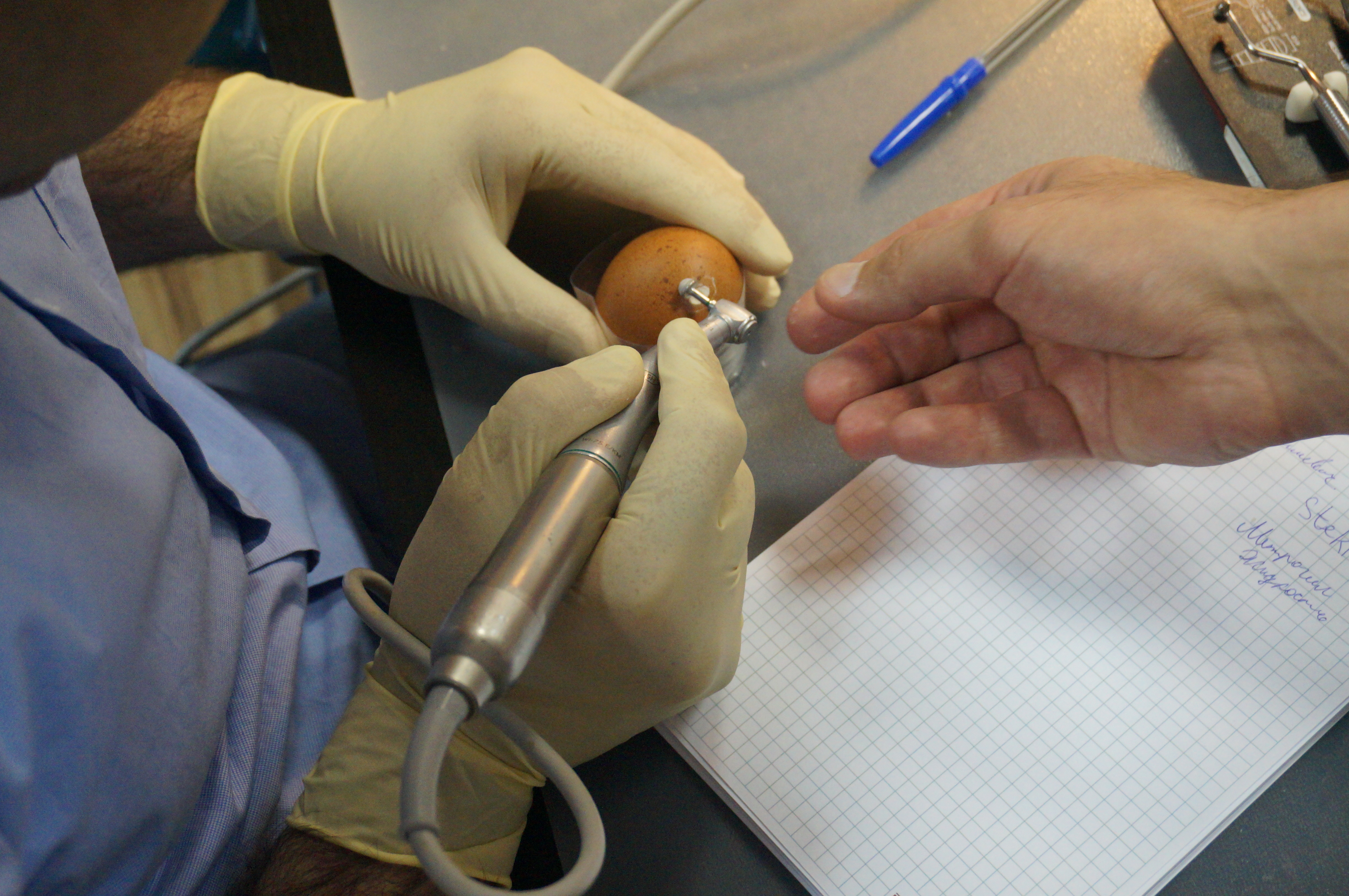 Оба дня курса завершались обширными практическими занятиями, на которых участники курса отрабатывали мануальные навыки под руководством нашего эксперта. В практическом блоке первого дня доктора сравнивали традиционную методику расщепления гребня и революционную методику Anyridge (на говяжьем ребре с помощью пьезохирургического инструмента).