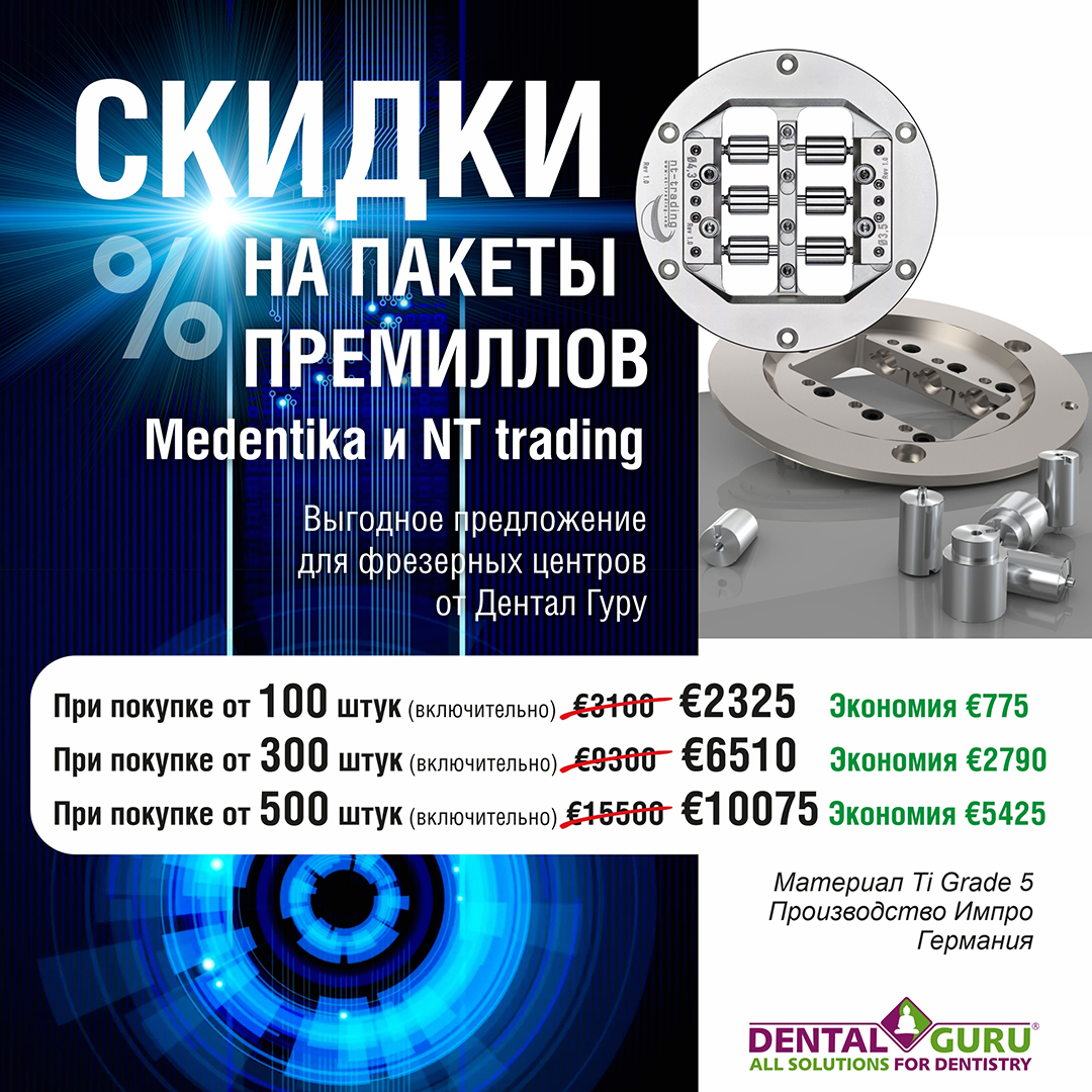 Выгодное предложение ТД Дентал Гуру для фрезерных центров: скидки на пакеты титановых премиллов Medentica и NT trading. Теперь при покупке пакетов 100, 300 или 500 шт. вы можете приобрести немецкие премиллы производства Impro с выгодой свыше 30%!