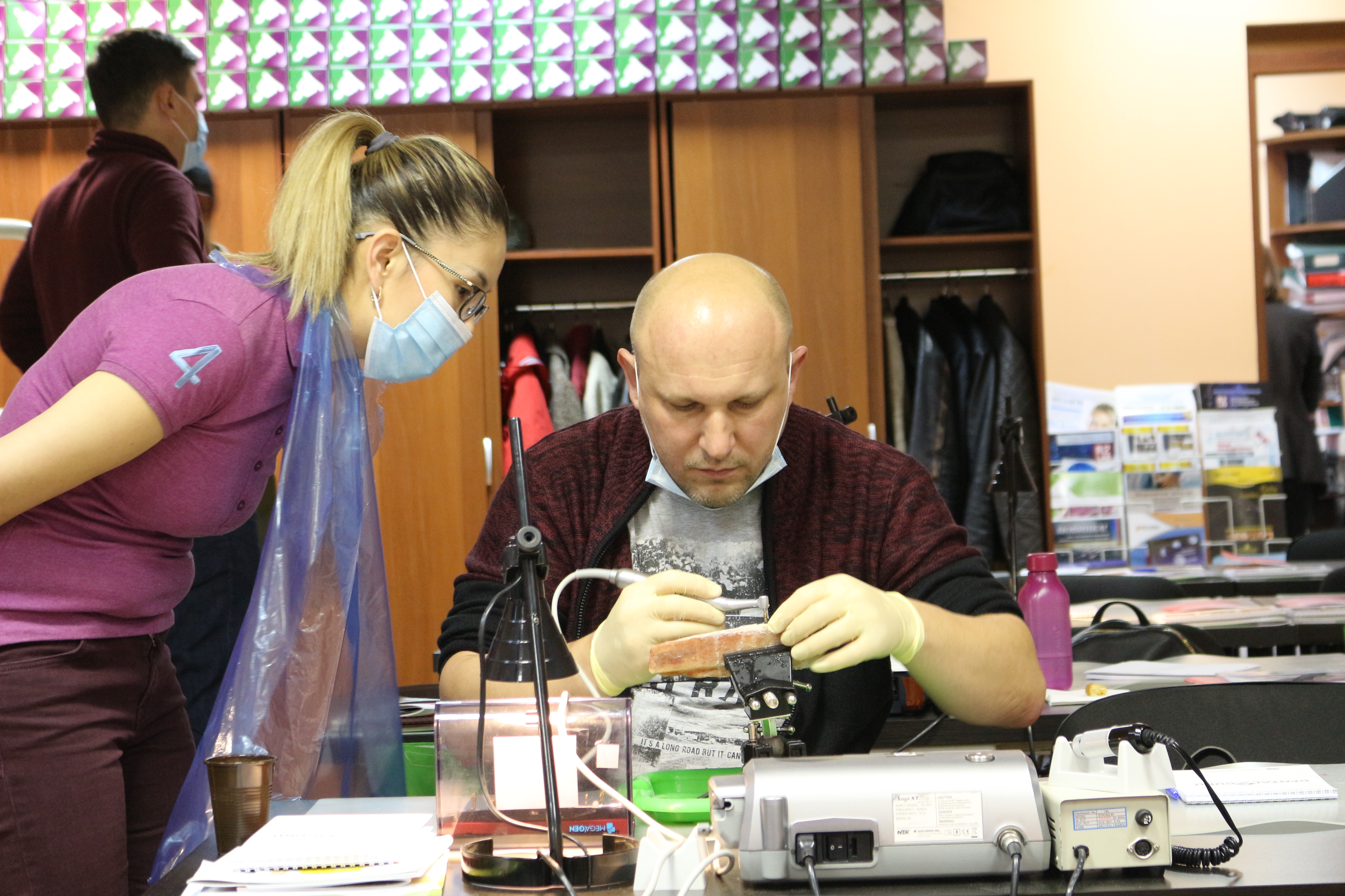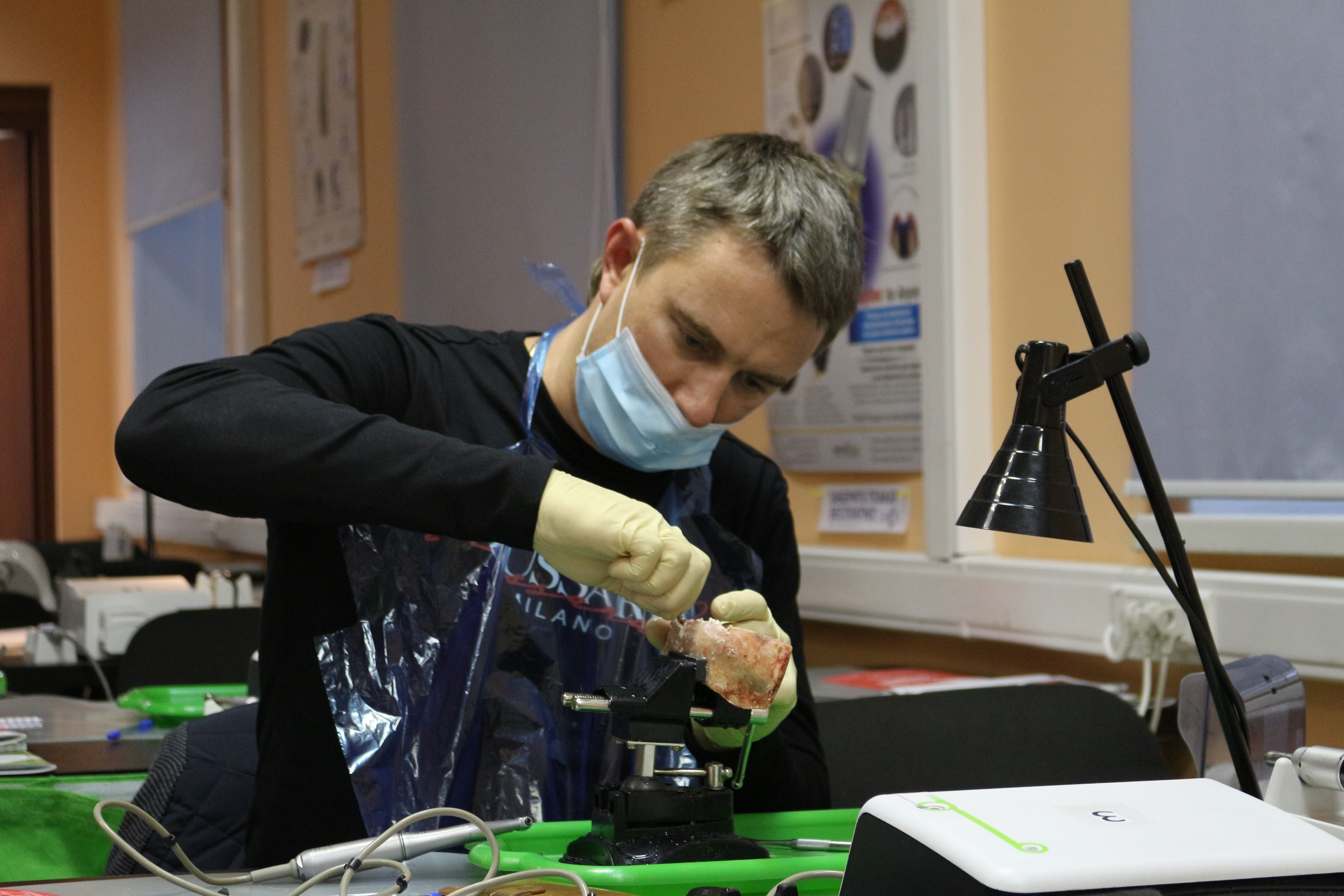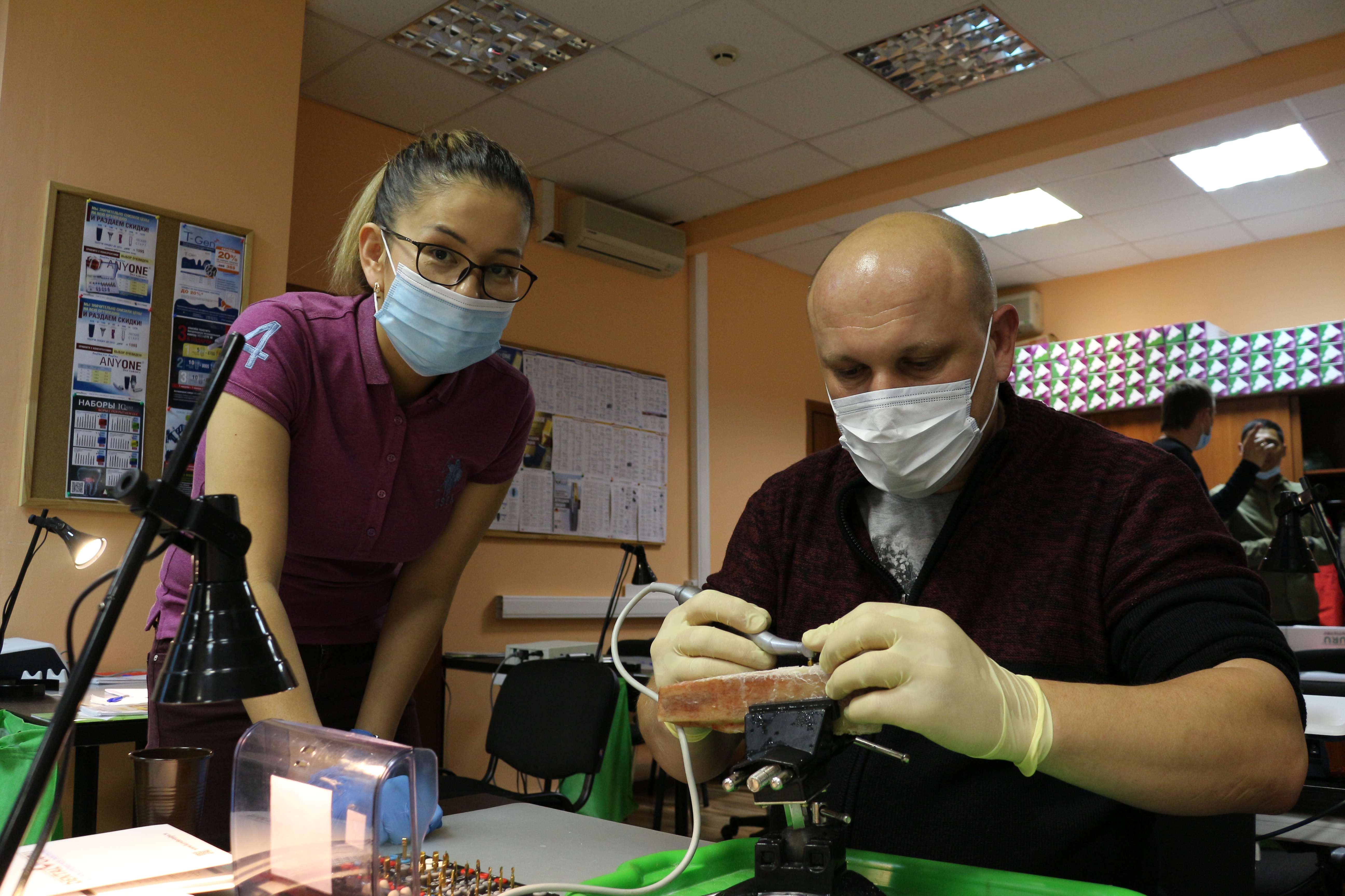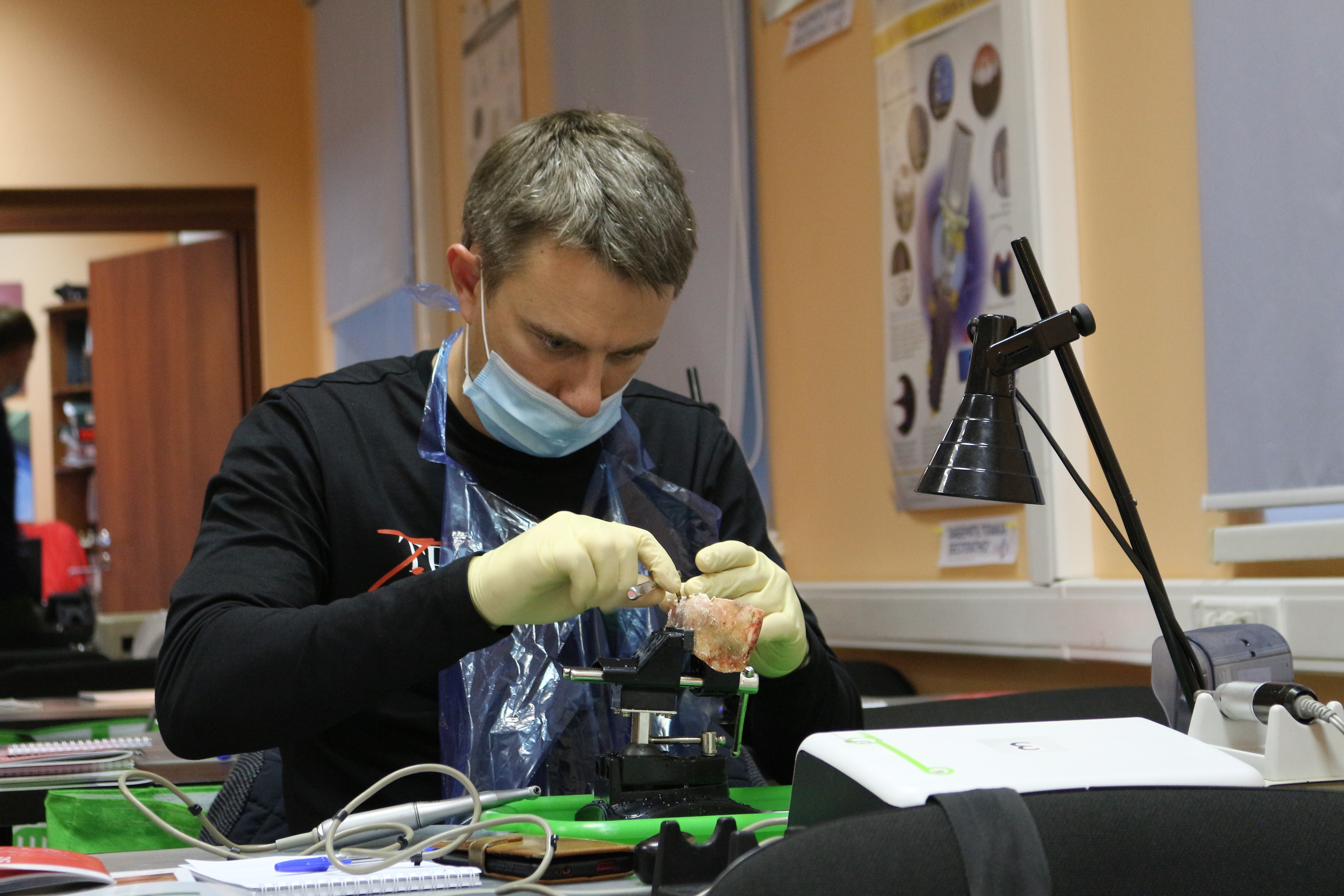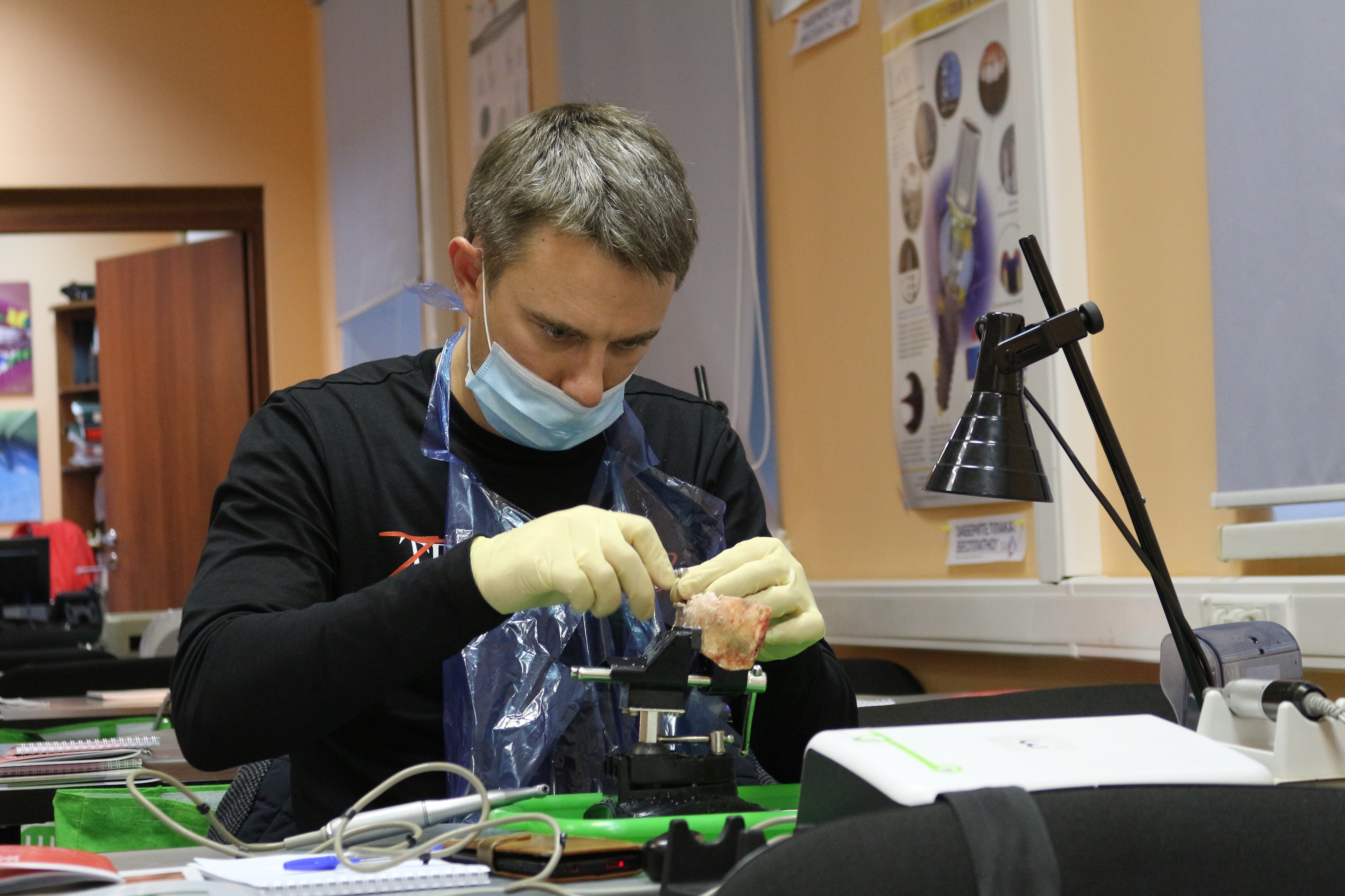 Для практических занятий использовались говяжьи ребра, куриные яйца, фантомы верхней челюсти и уникальные модели гайморовой пазухи.