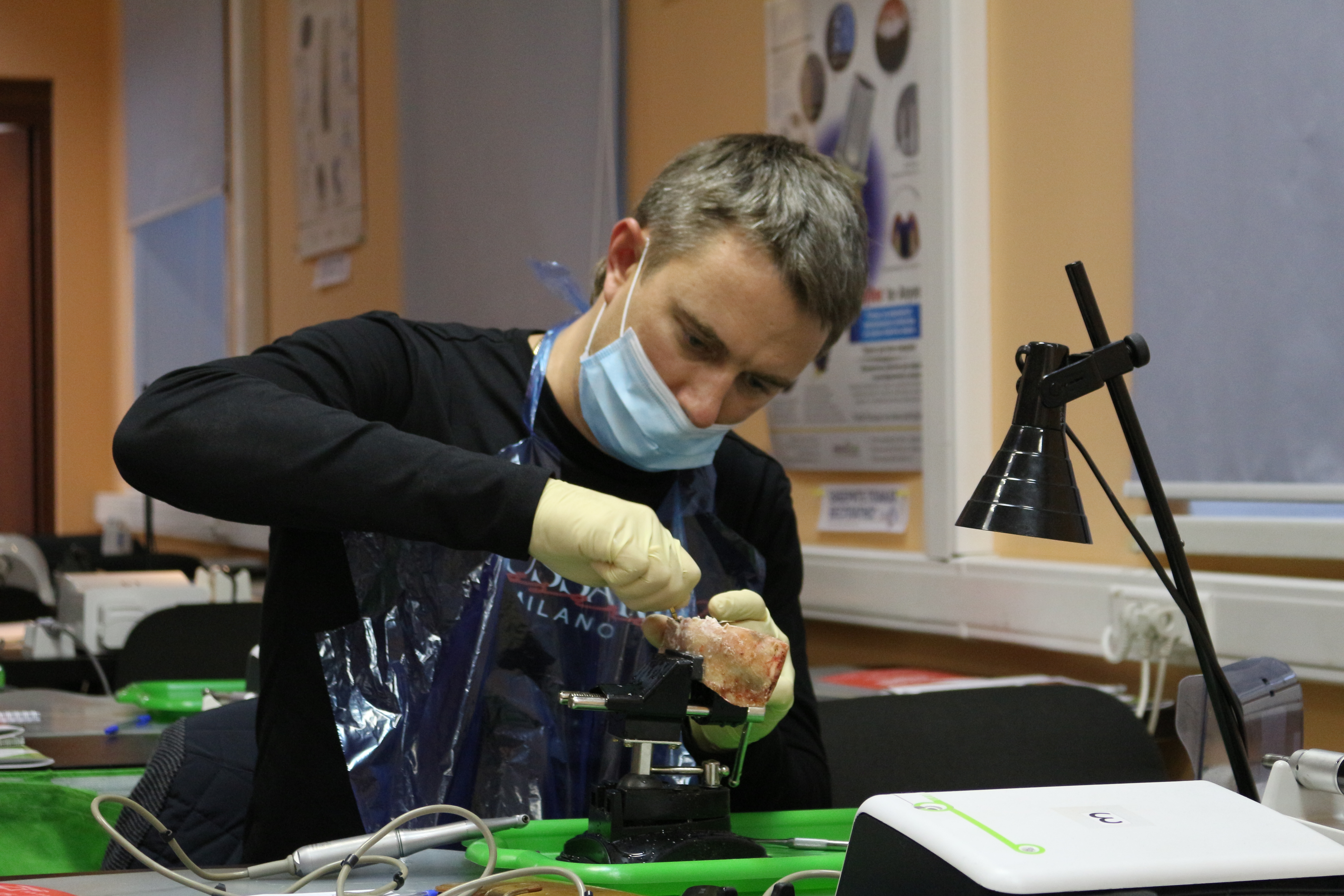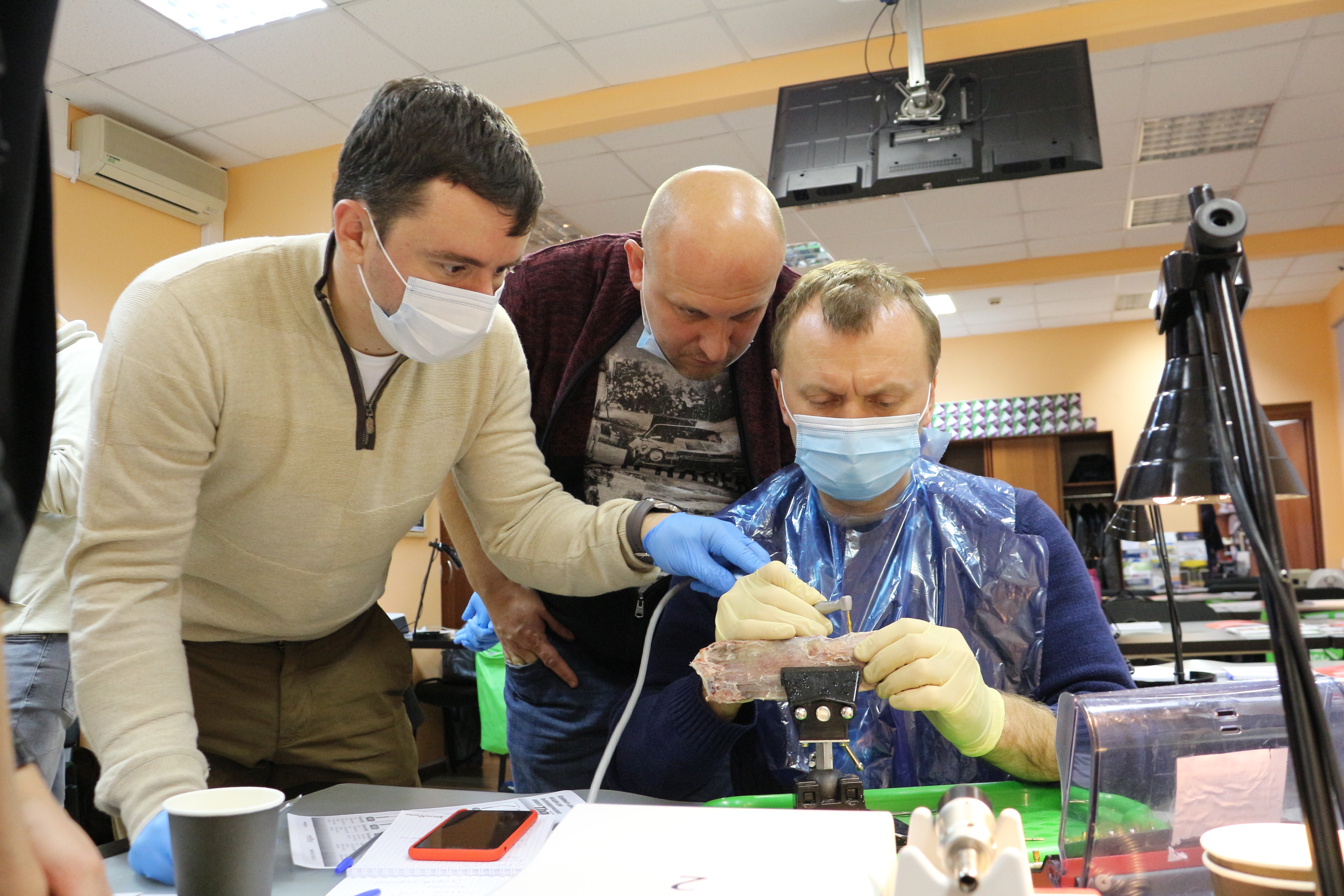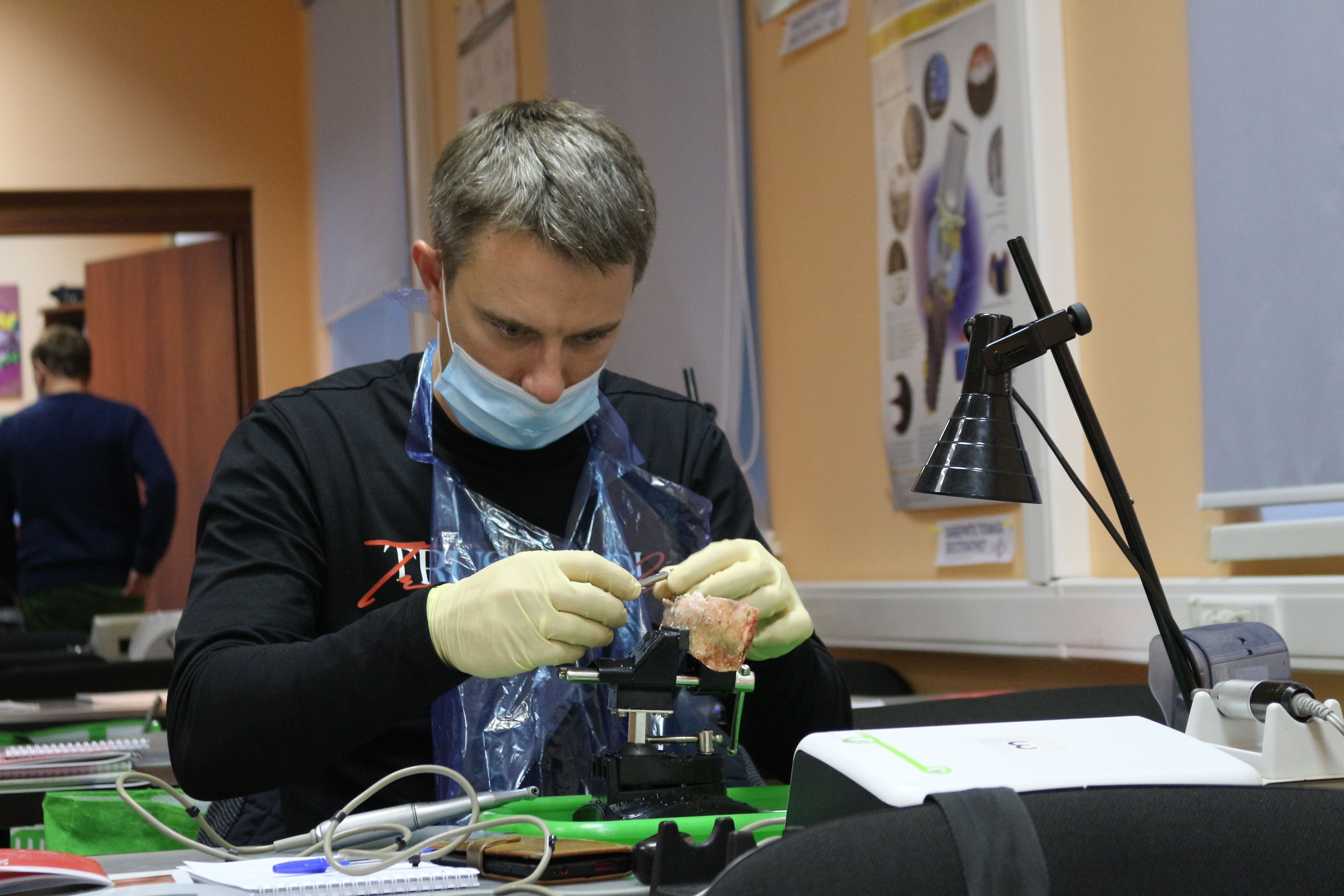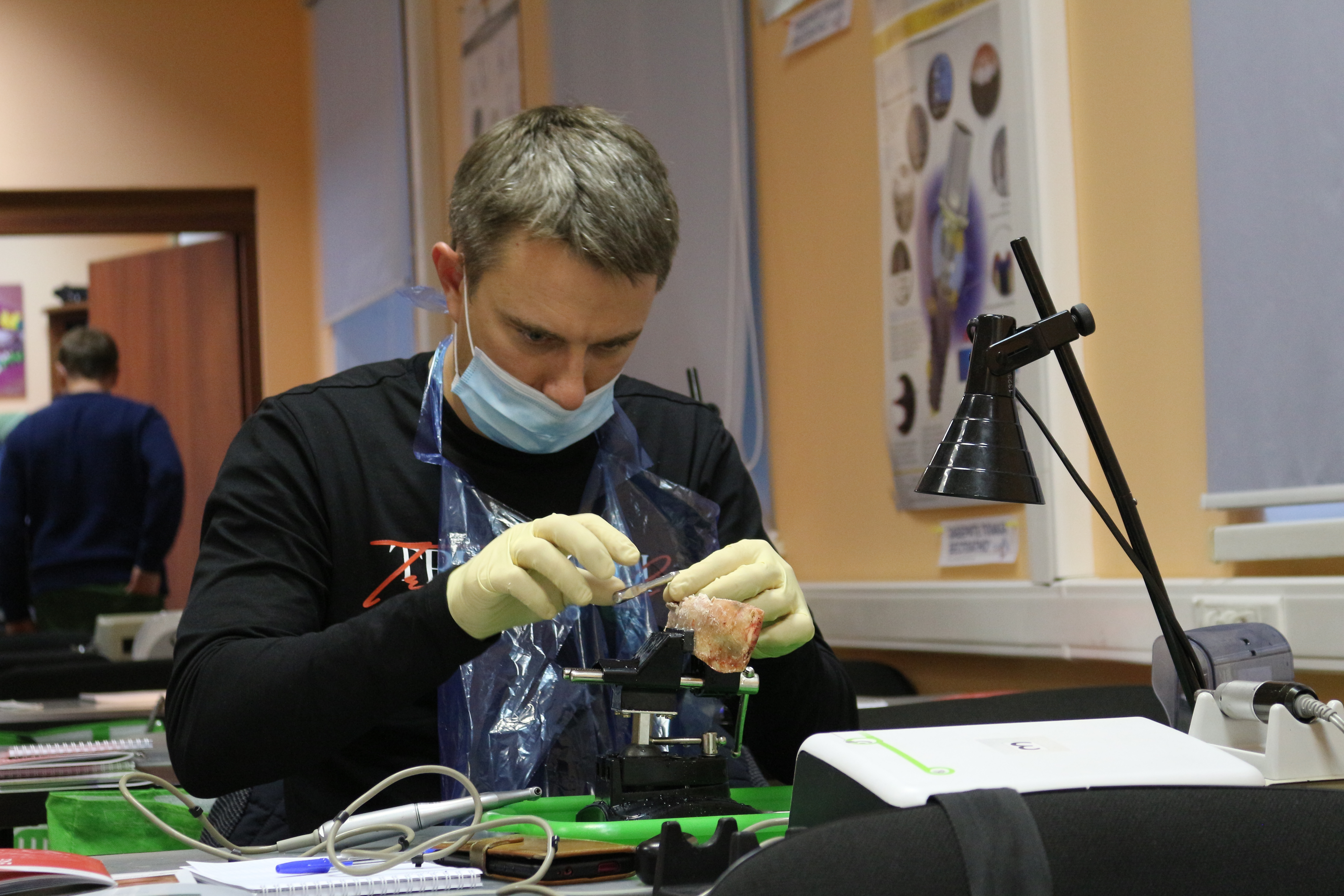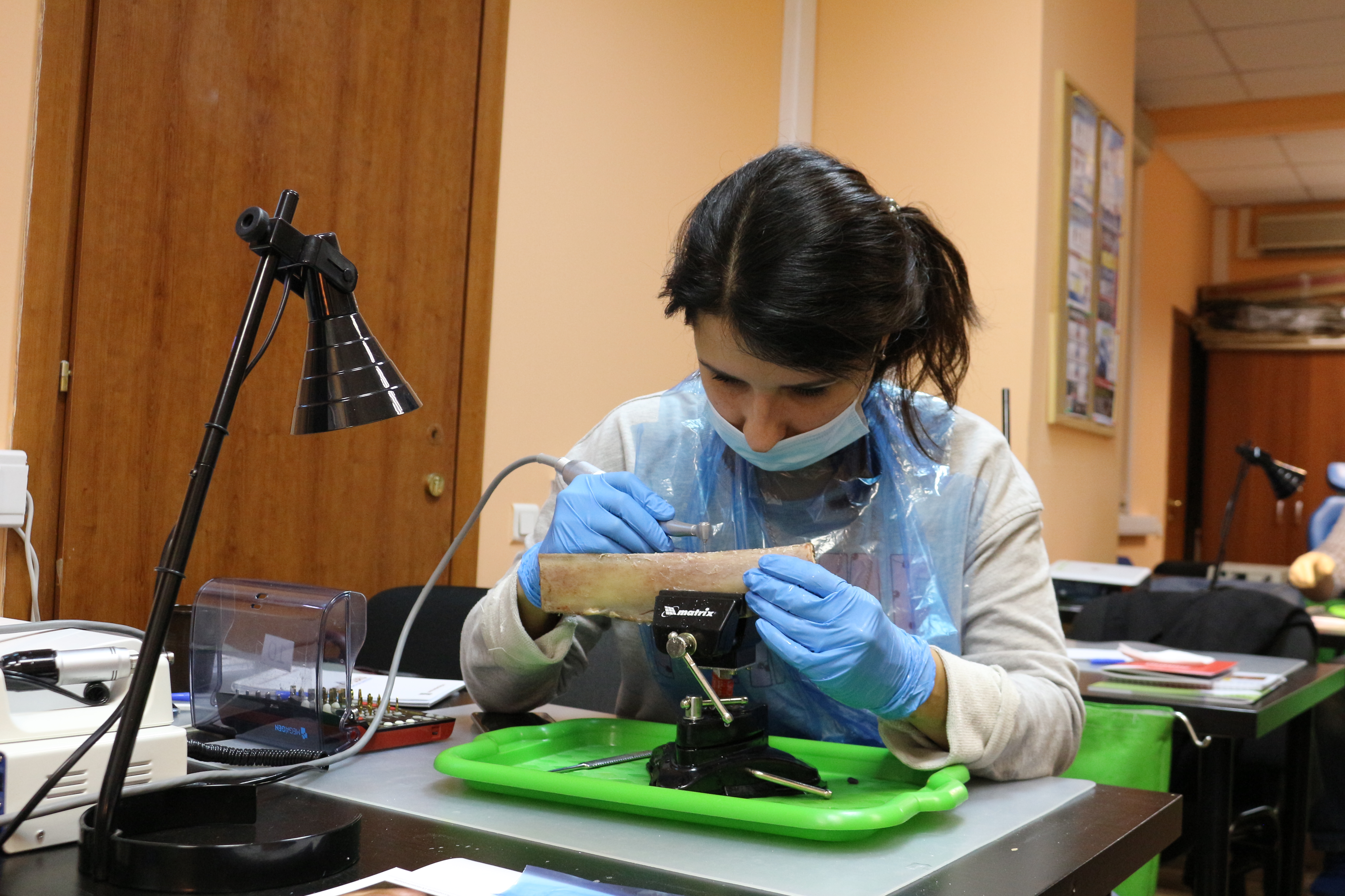 Для практических занятий использовались говяжьи ребра, куриные яйца, фантомы верхней челюсти и уникальные модели гайморовой пазухи.