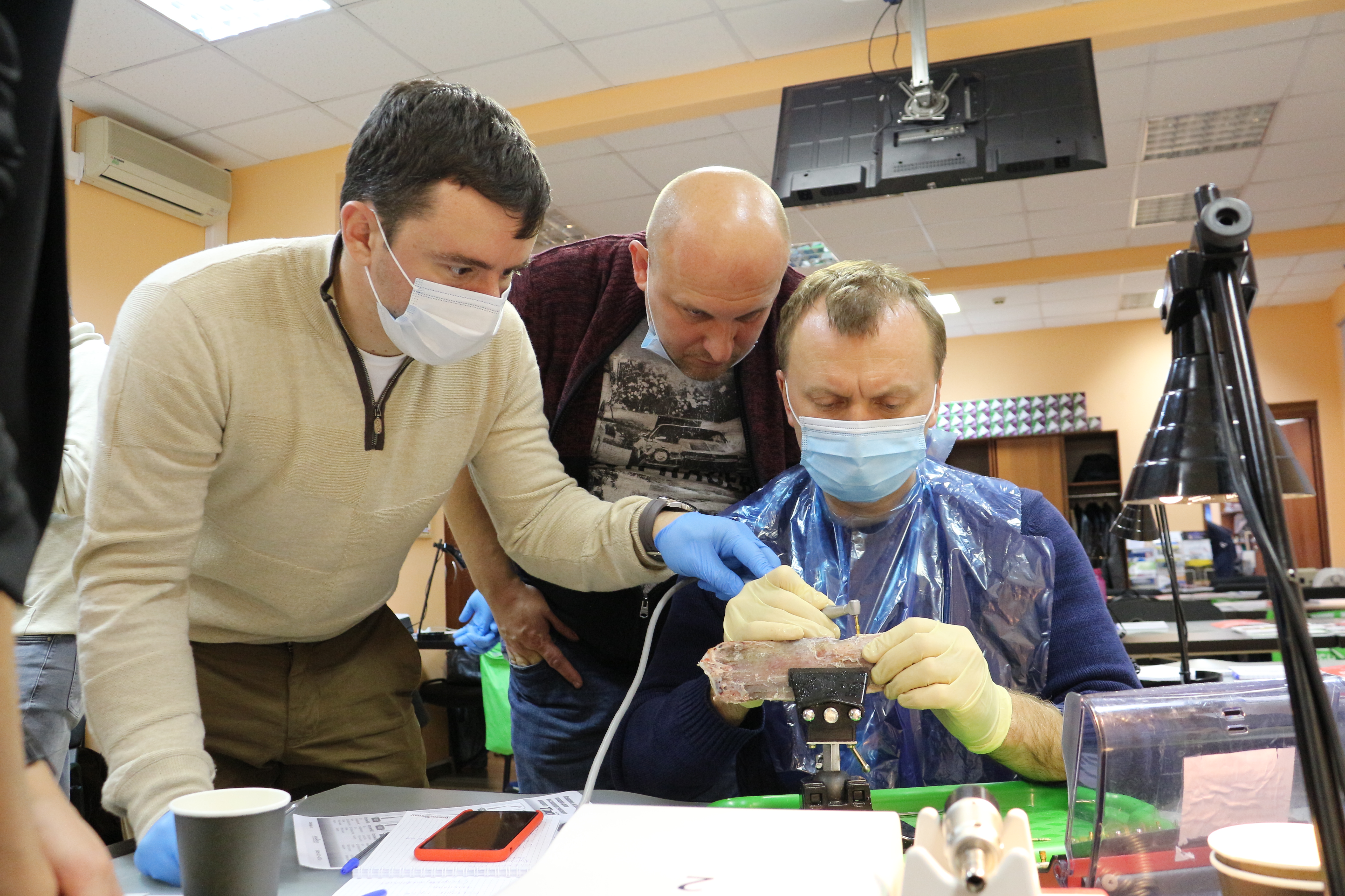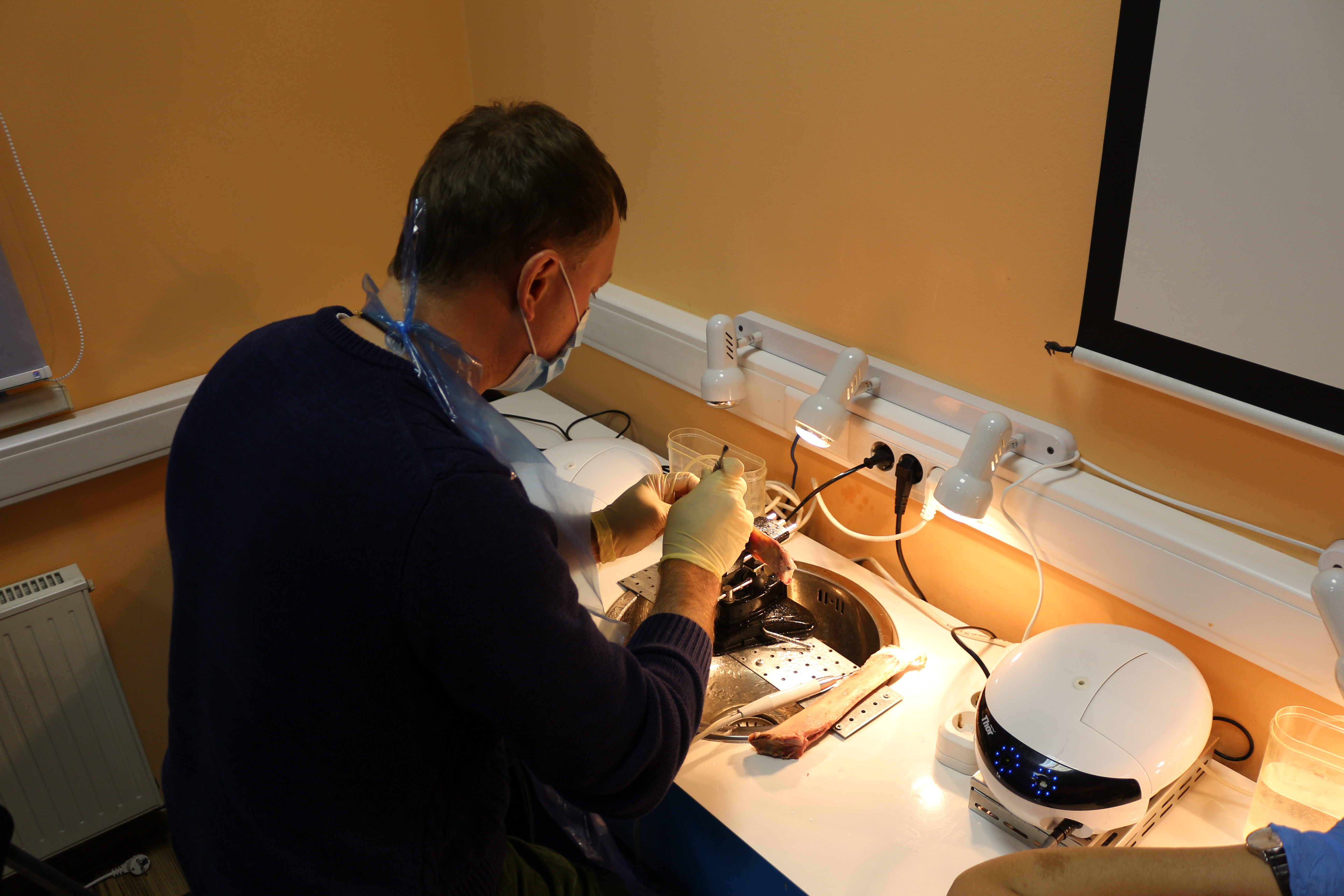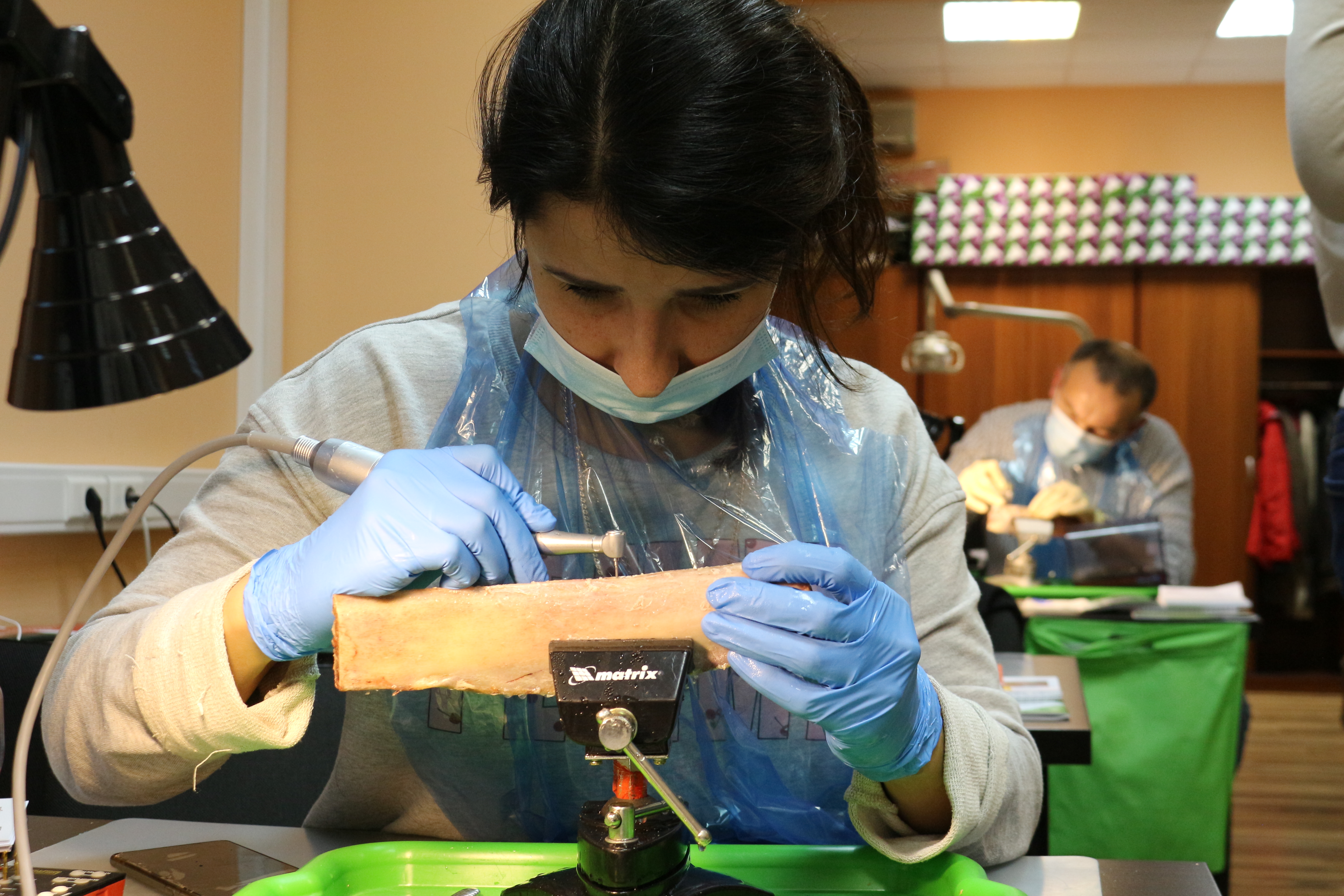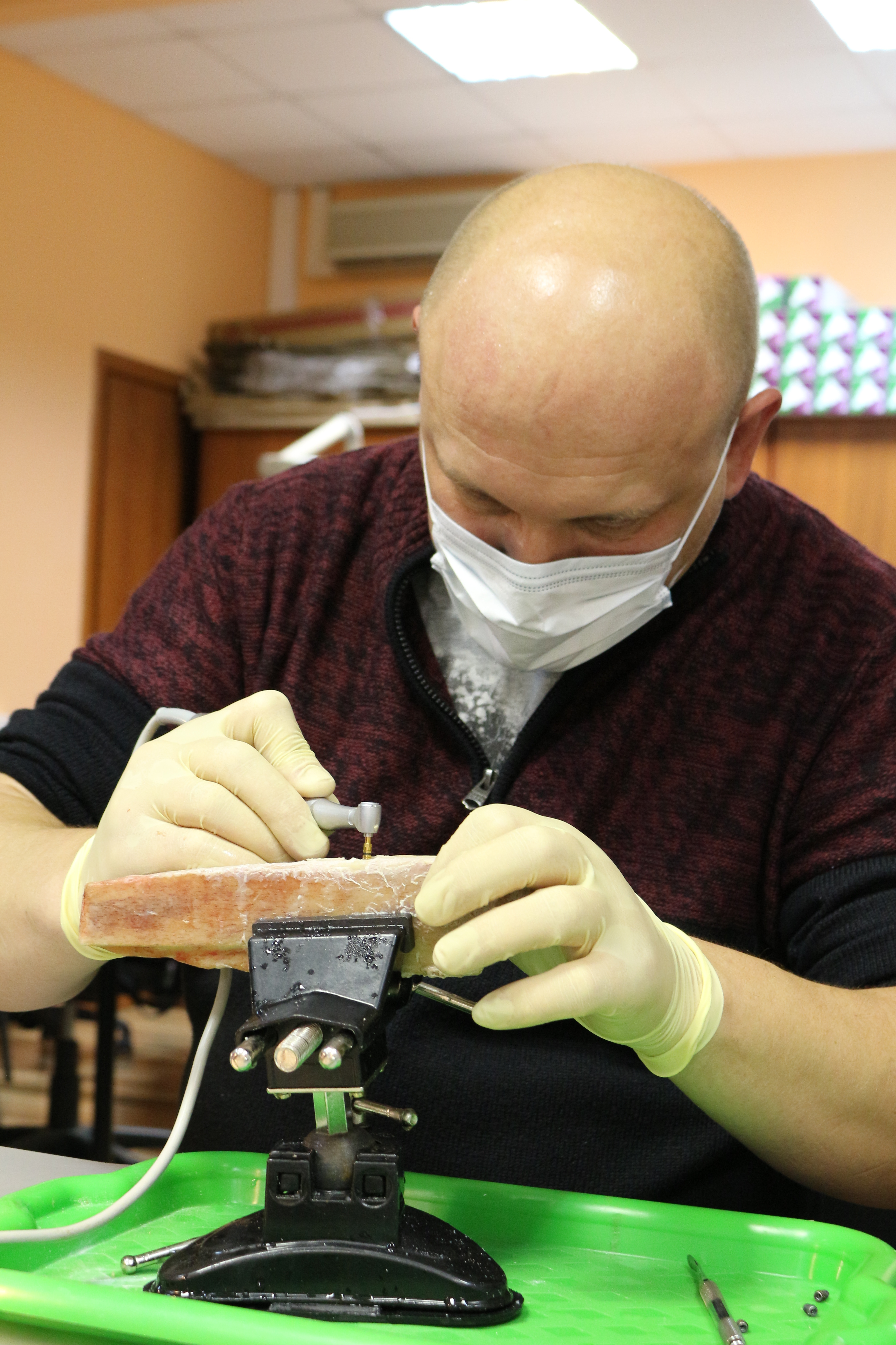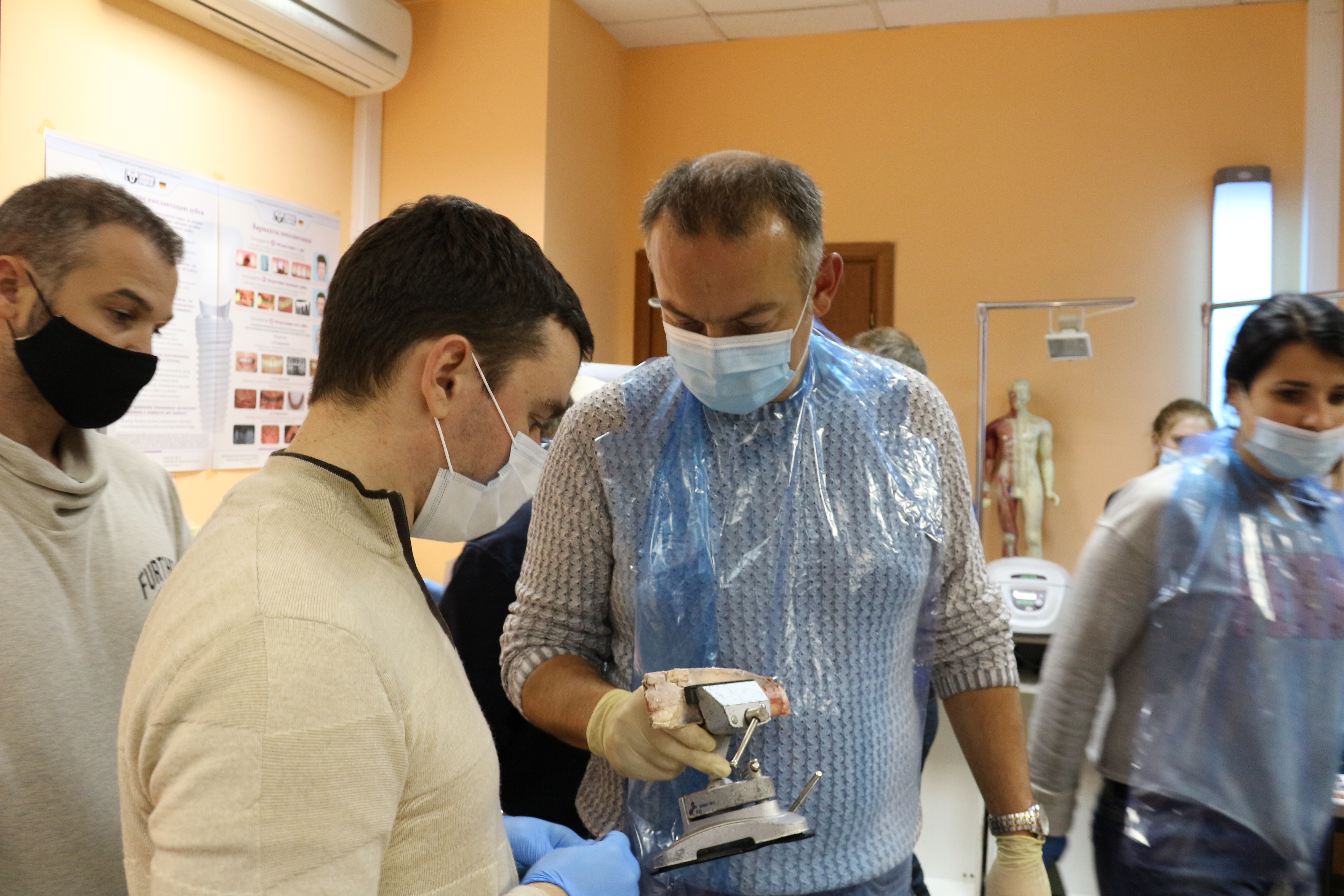 Для практических занятий использовались говяжьи ребра, куриные яйца, фантомы верхней челюсти и уникальные модели гайморовой пазухи.