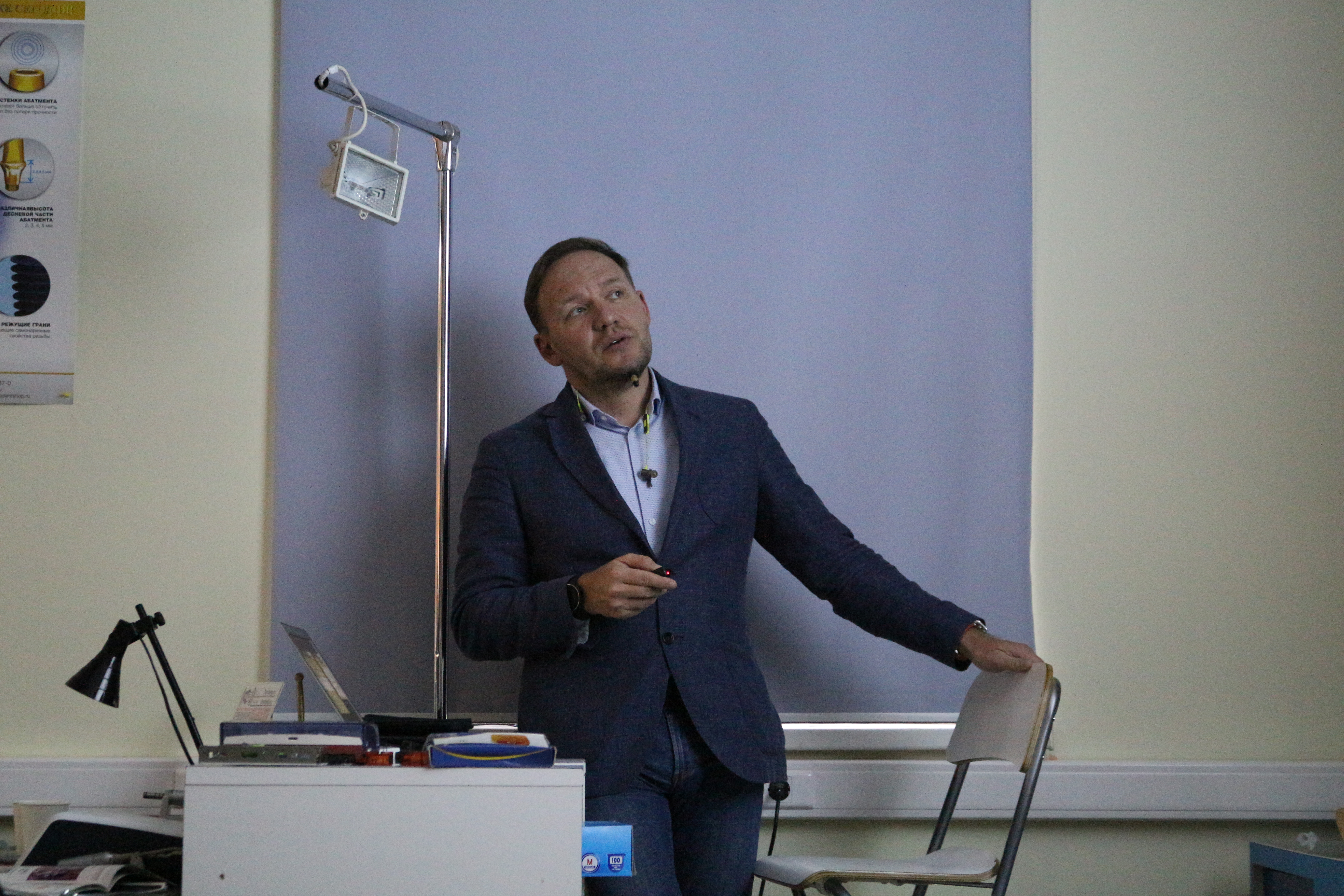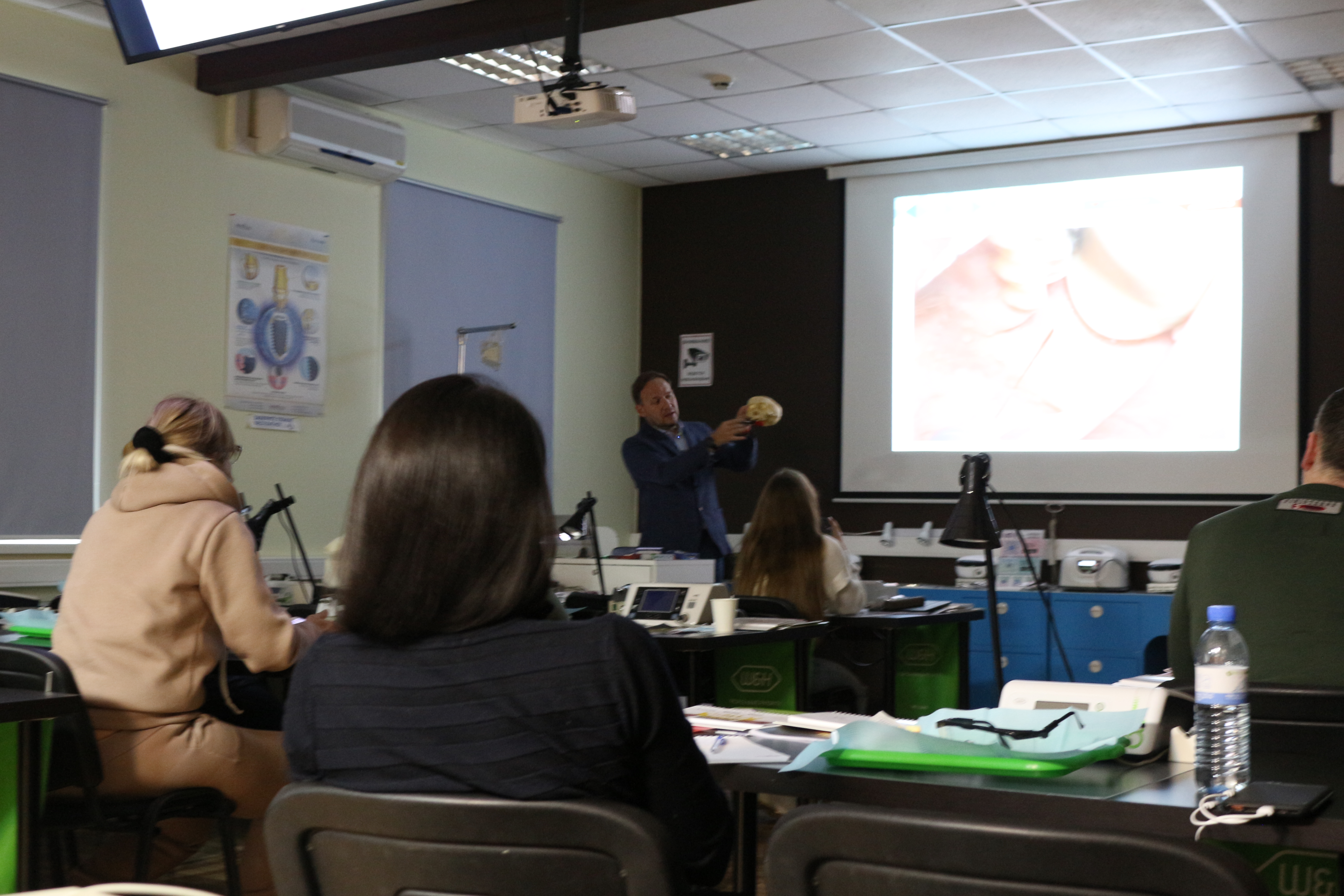 На практическом занятии курсанты отработали технику безопасного удаления зубов на бараньей челюсти, научились проводить растяжение надкостницы по методике Soft Brashing. Камиль Наильевич провел мастер-класс по получению APRF для заполнения лунки зуба, продемонстрировал удаление имплантата по методике Root Shield и удаление с помощью специальных наборов и инструментов.