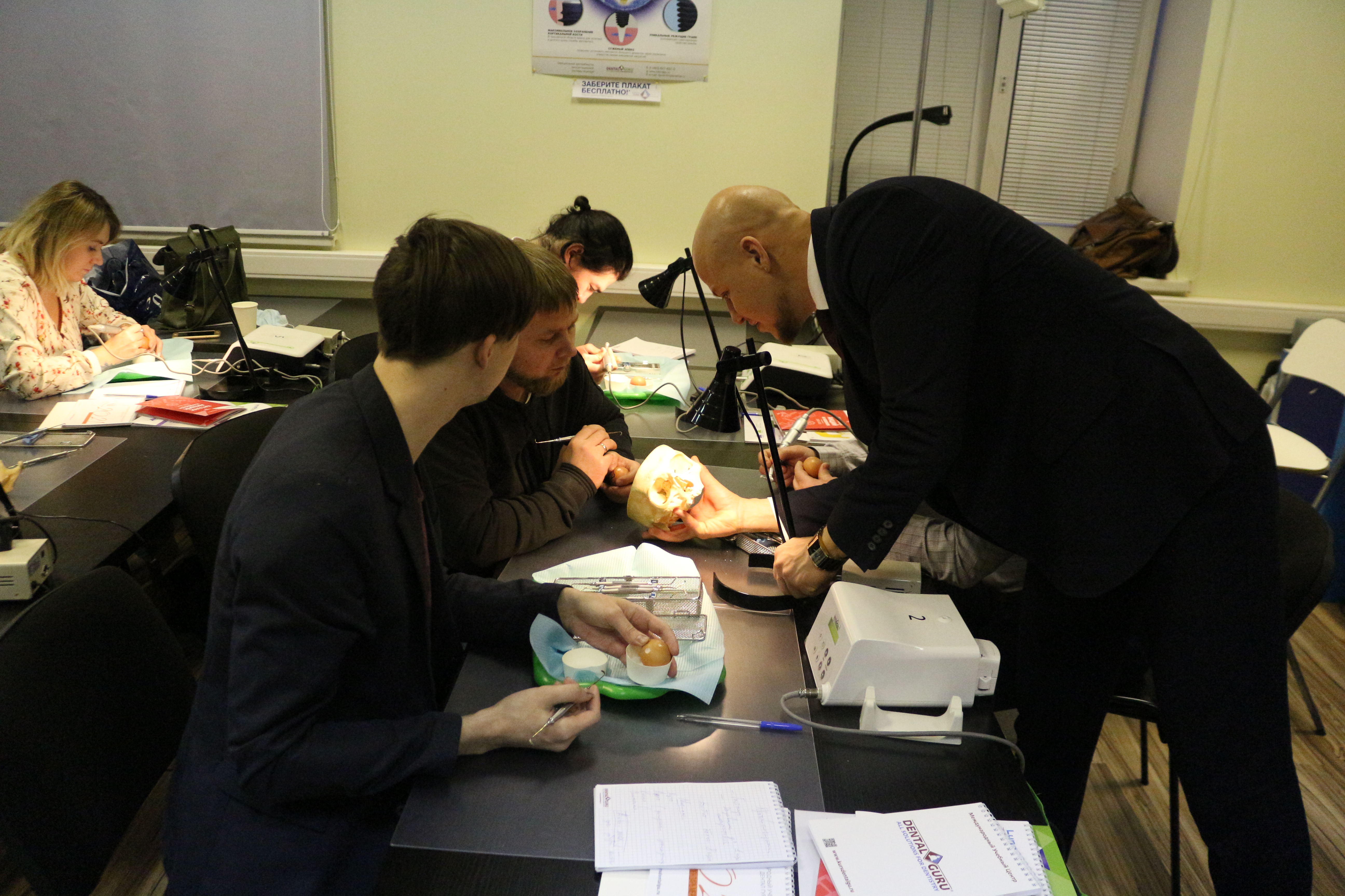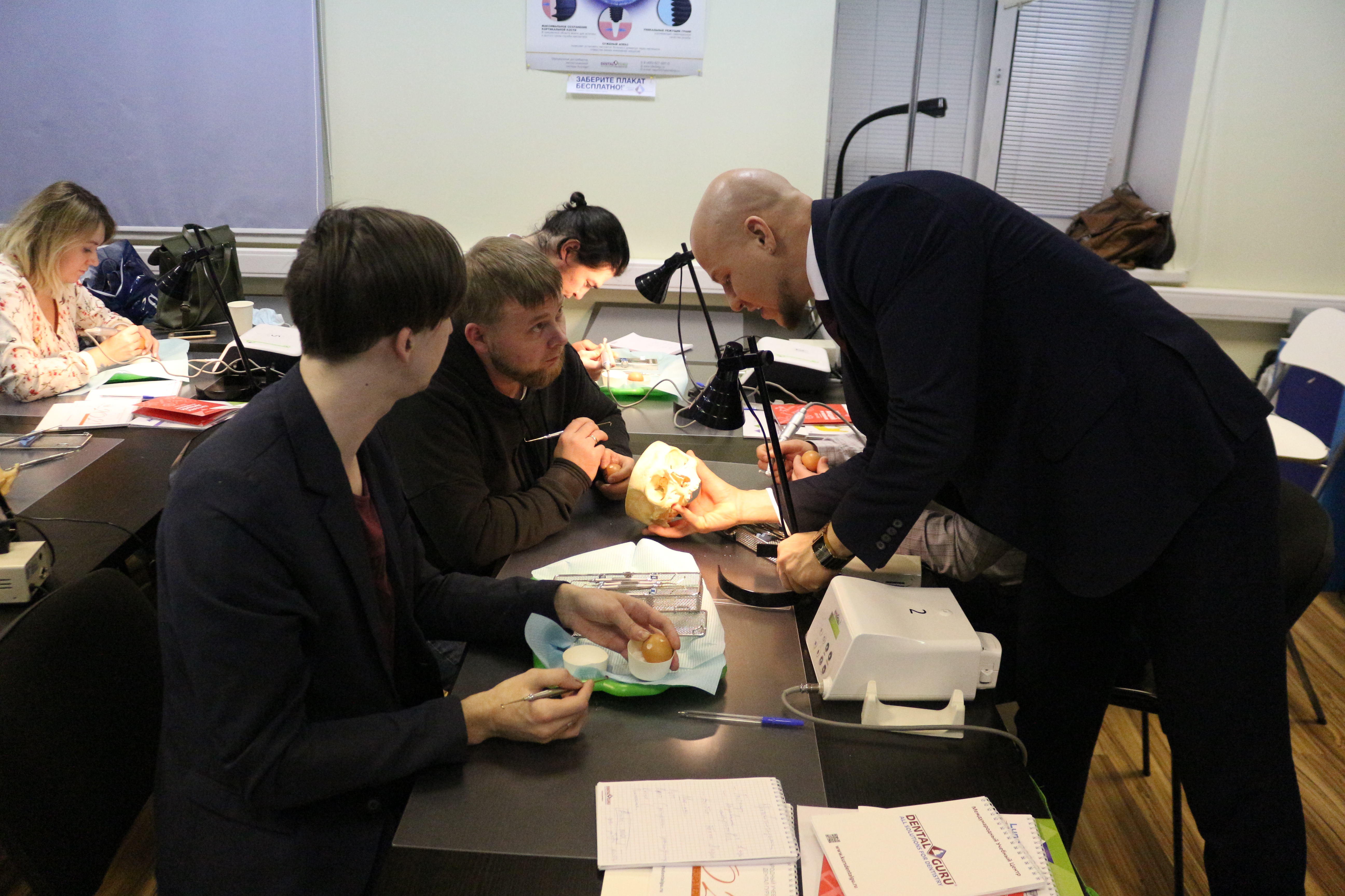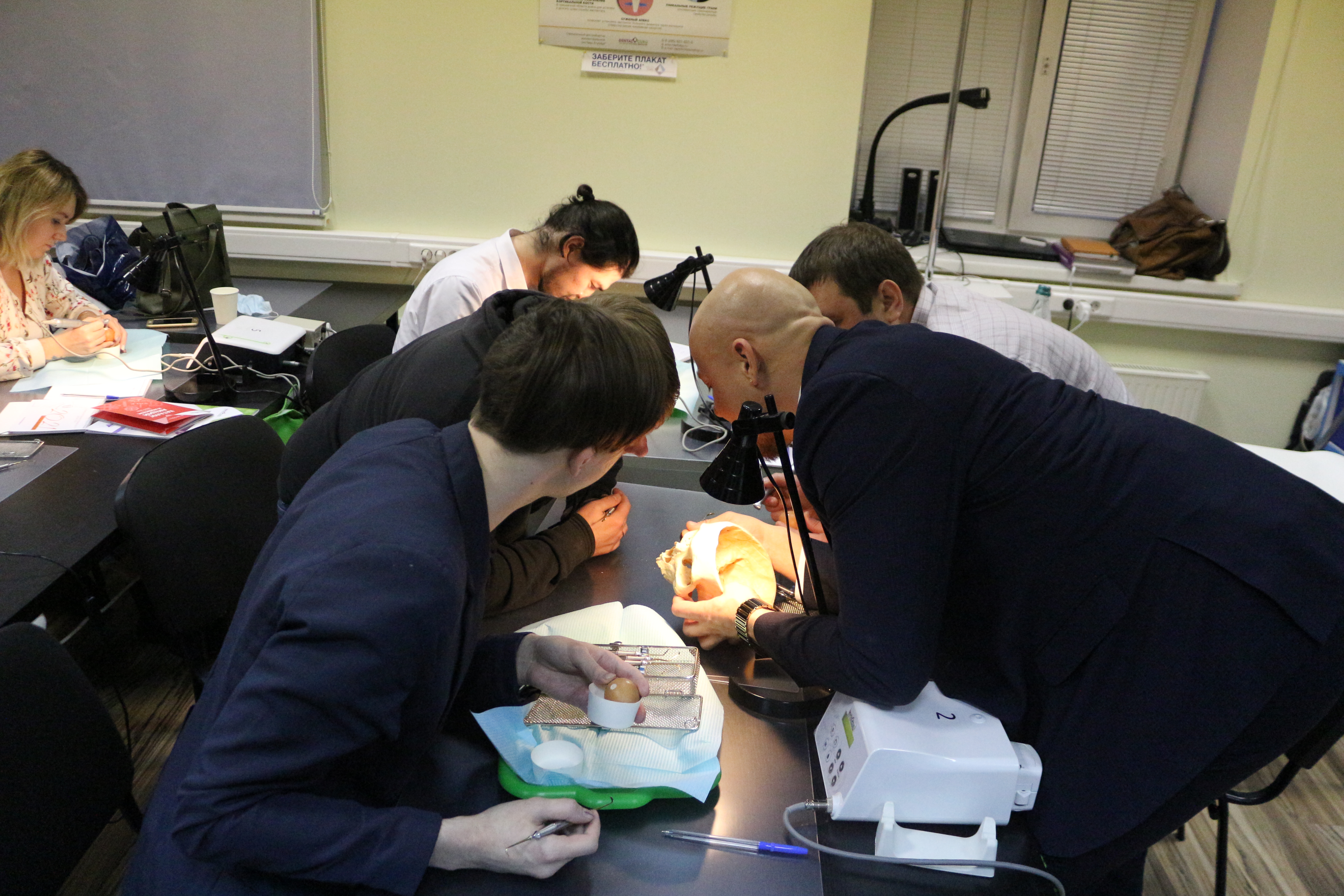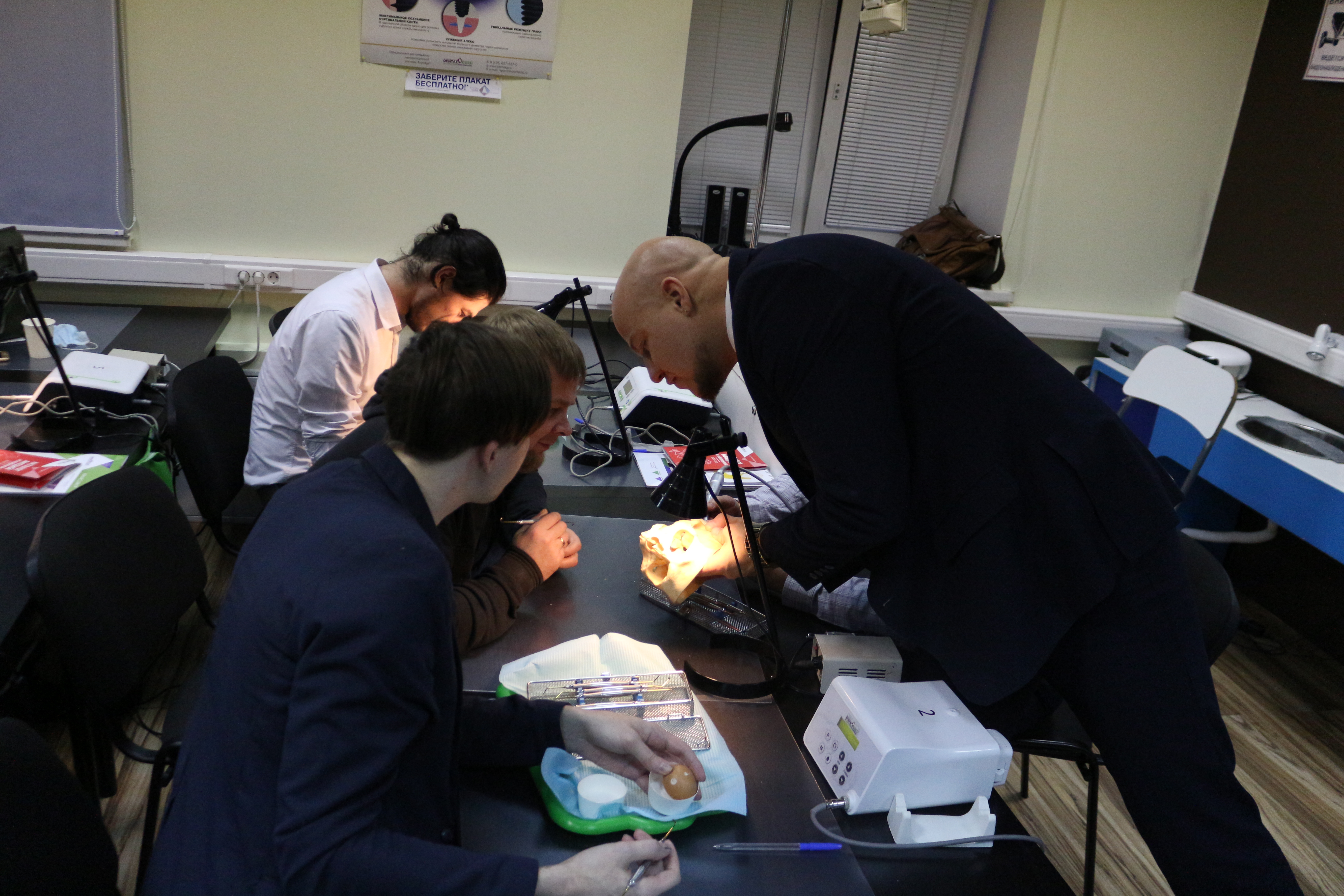 В ходе практических занятий курсанты под руководством эксперта научились проводить расщепление гребня по классической методике, формировать латеральное окно и проводить открытый и закрытый синус-лифтинг. Практические занятия проводились с использованием пластиковых моделей челюсти, говяжьих ребер и куриных яиц.