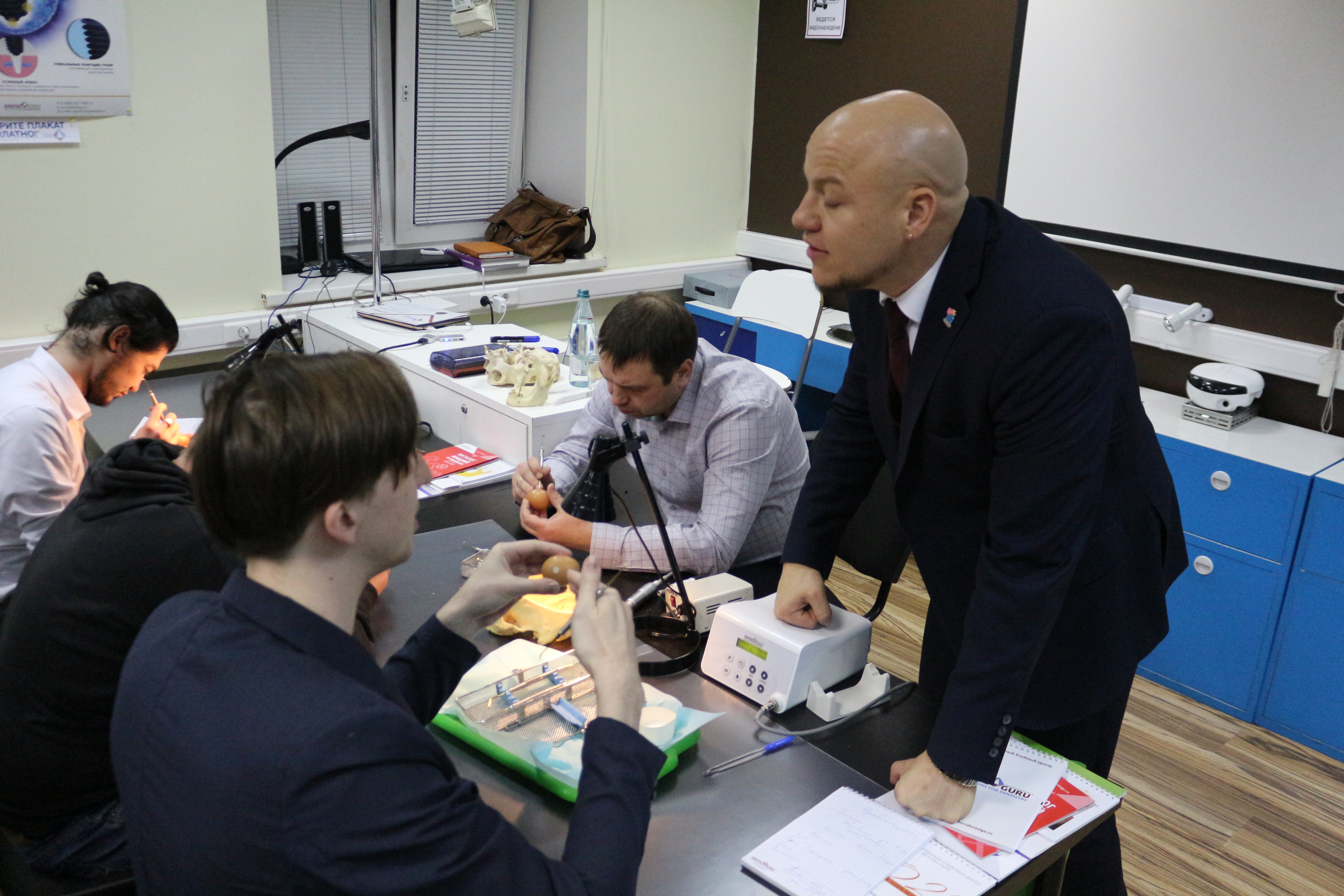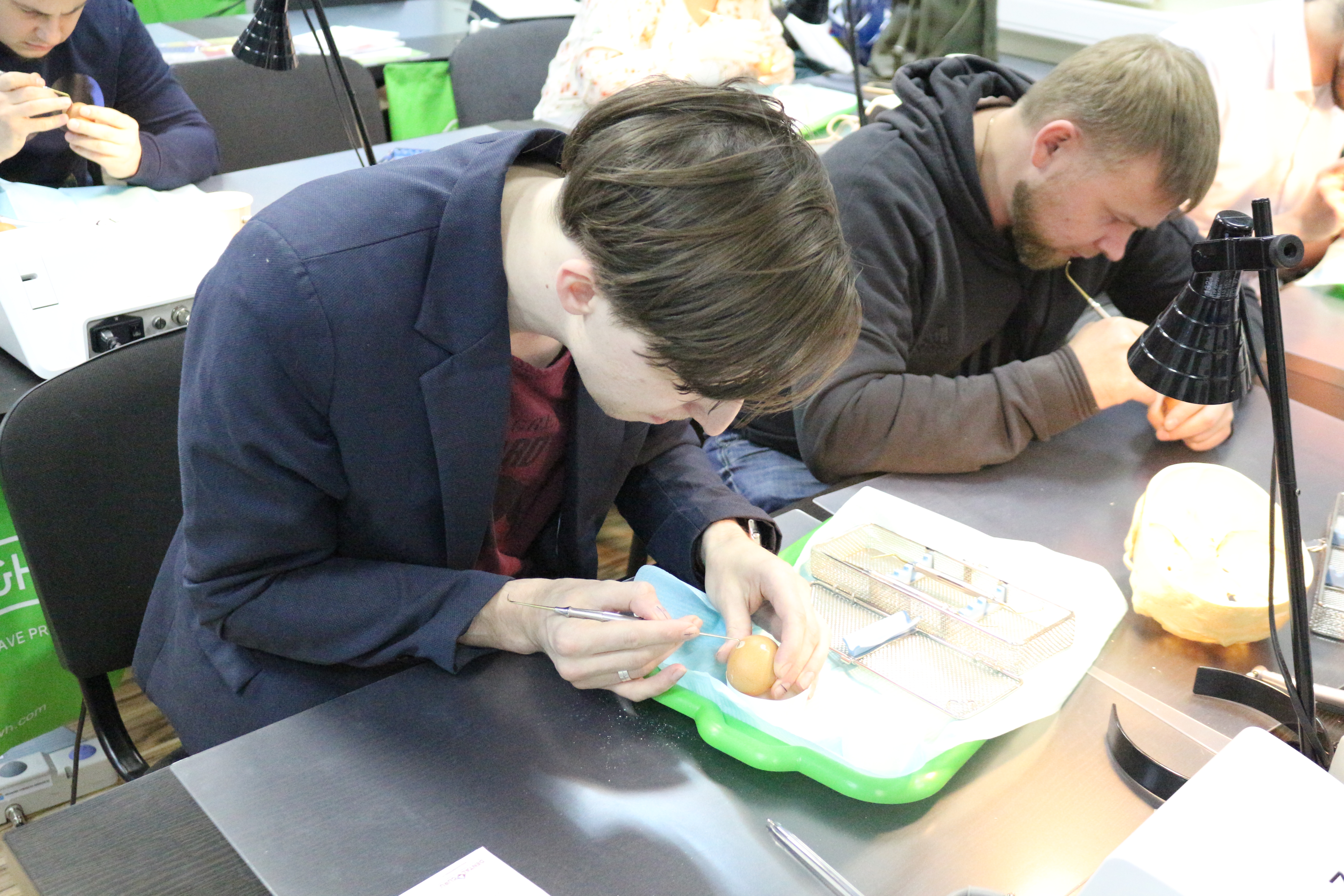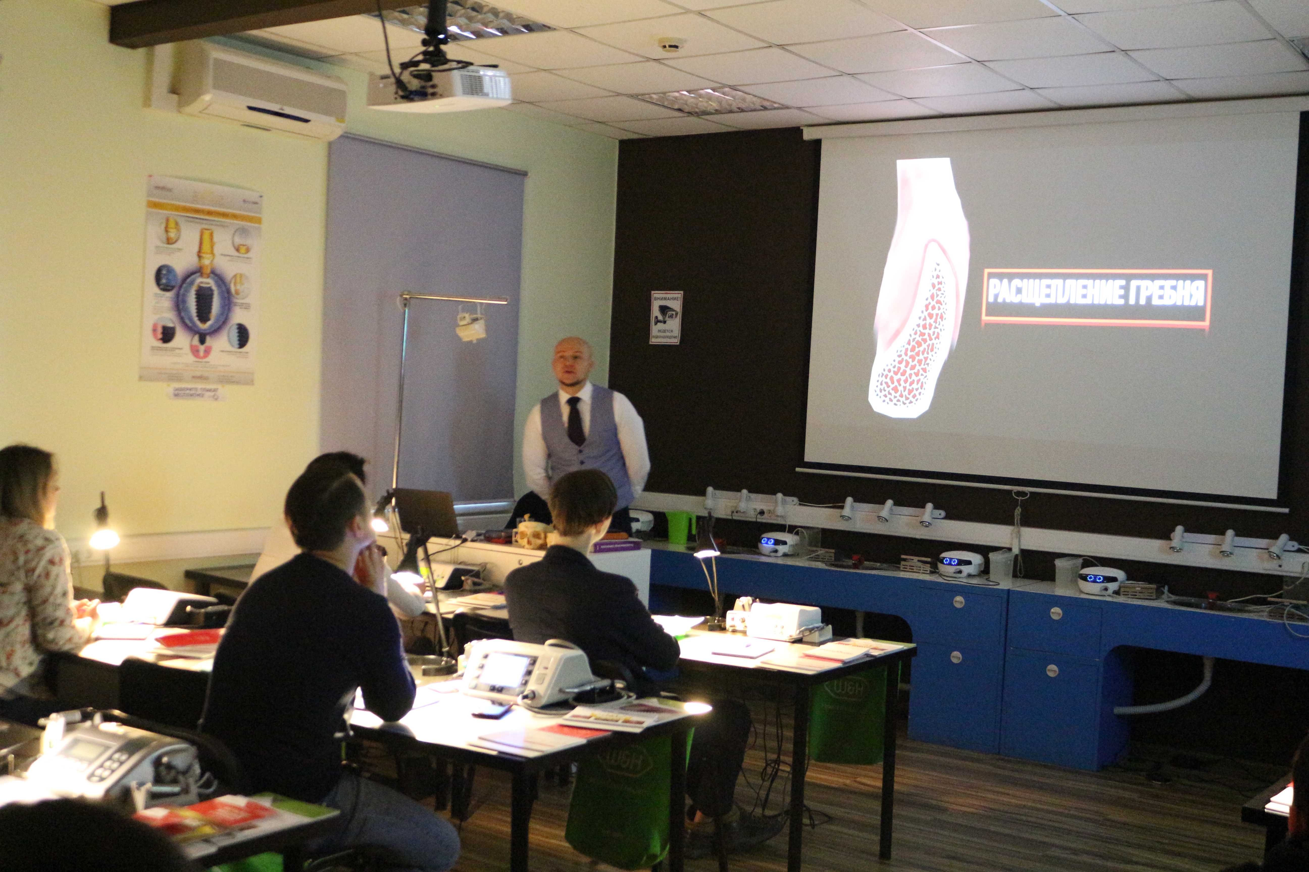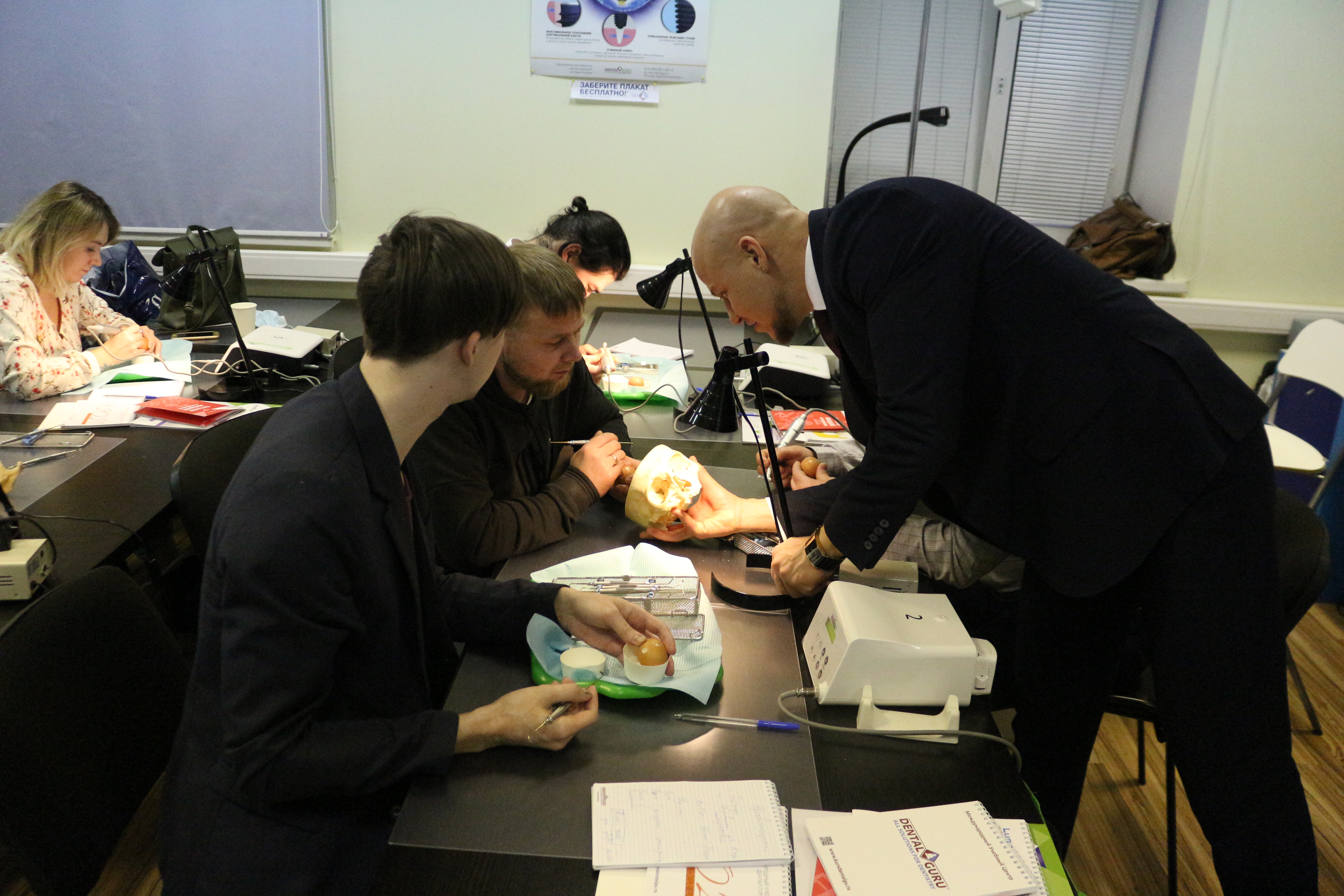 В ходе практических занятий курсанты под руководством эксперта научились проводить расщепление гребня по классической методике, формировать латеральное окно и проводить открытый и закрытый синус-лифтинг. Практические занятия проводились с использованием пластиковых моделей челюсти, говяжьих ребер и куриных яиц.