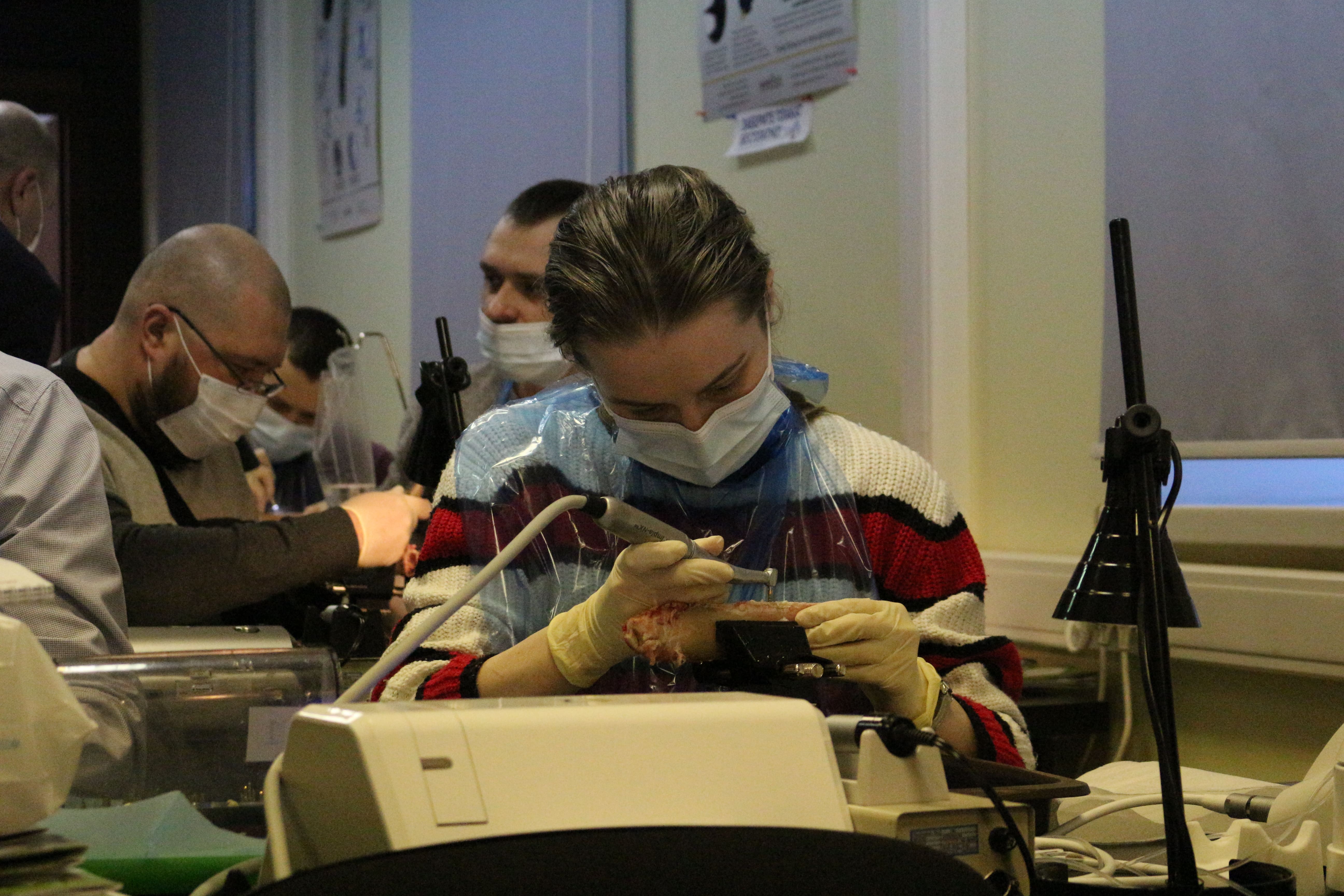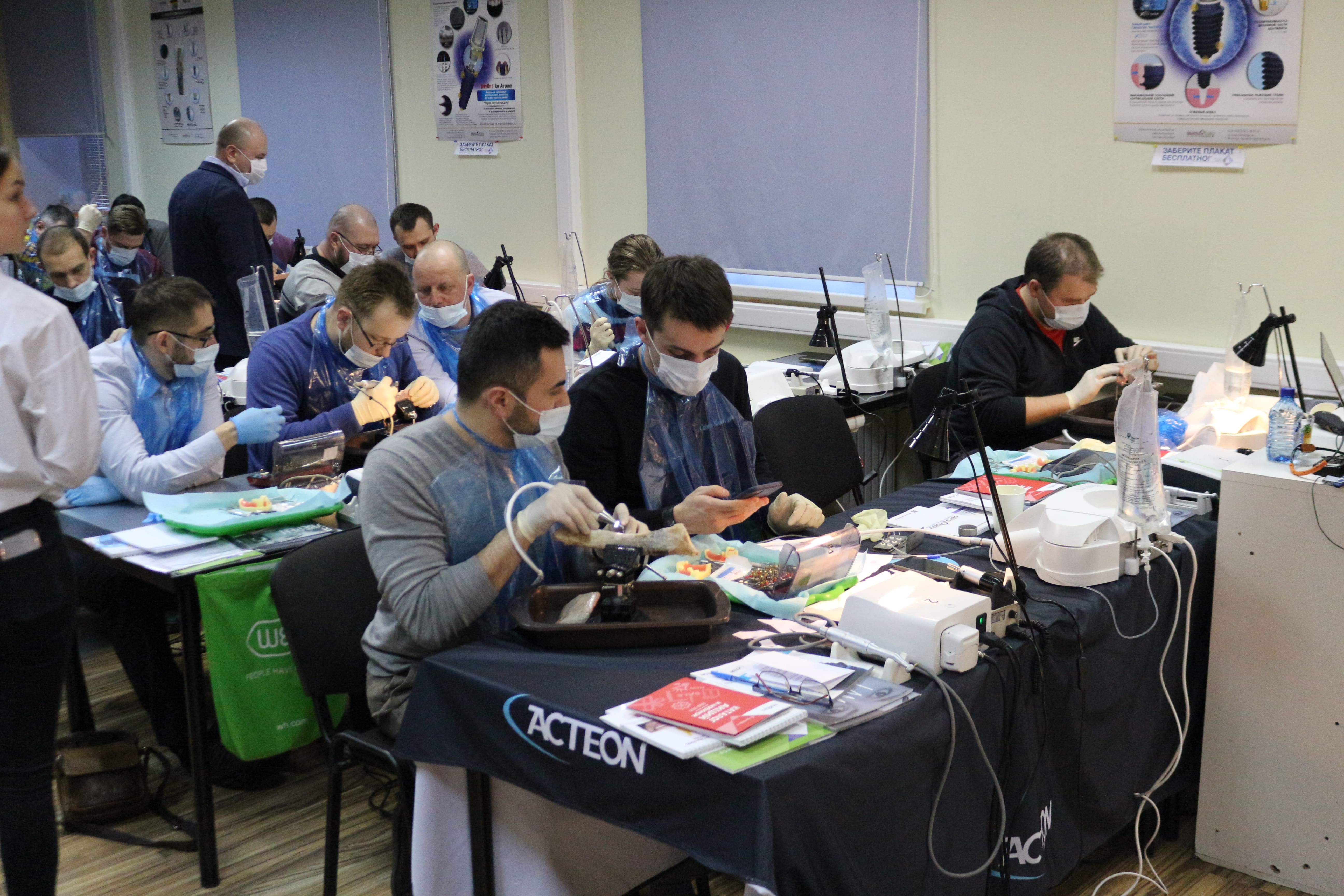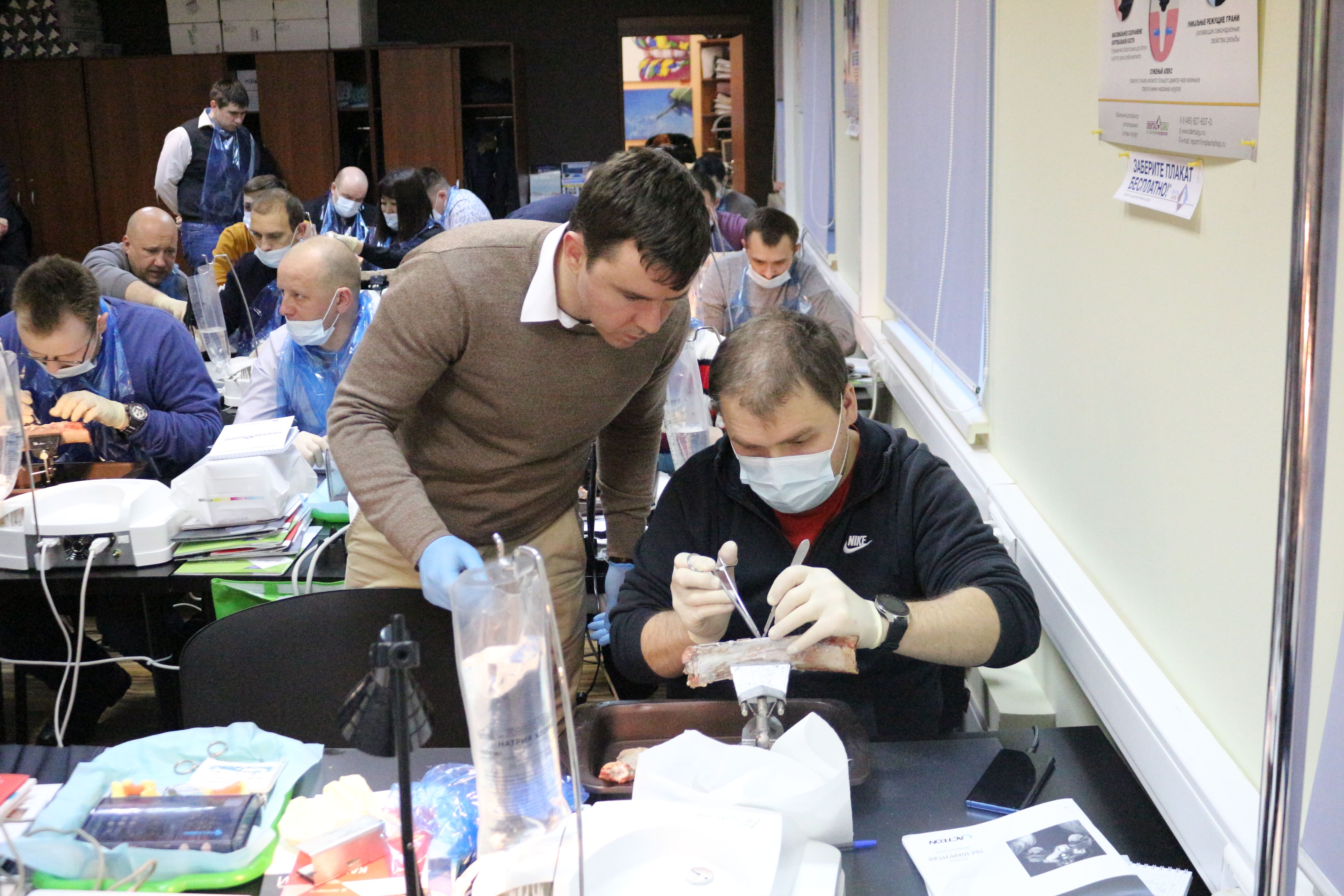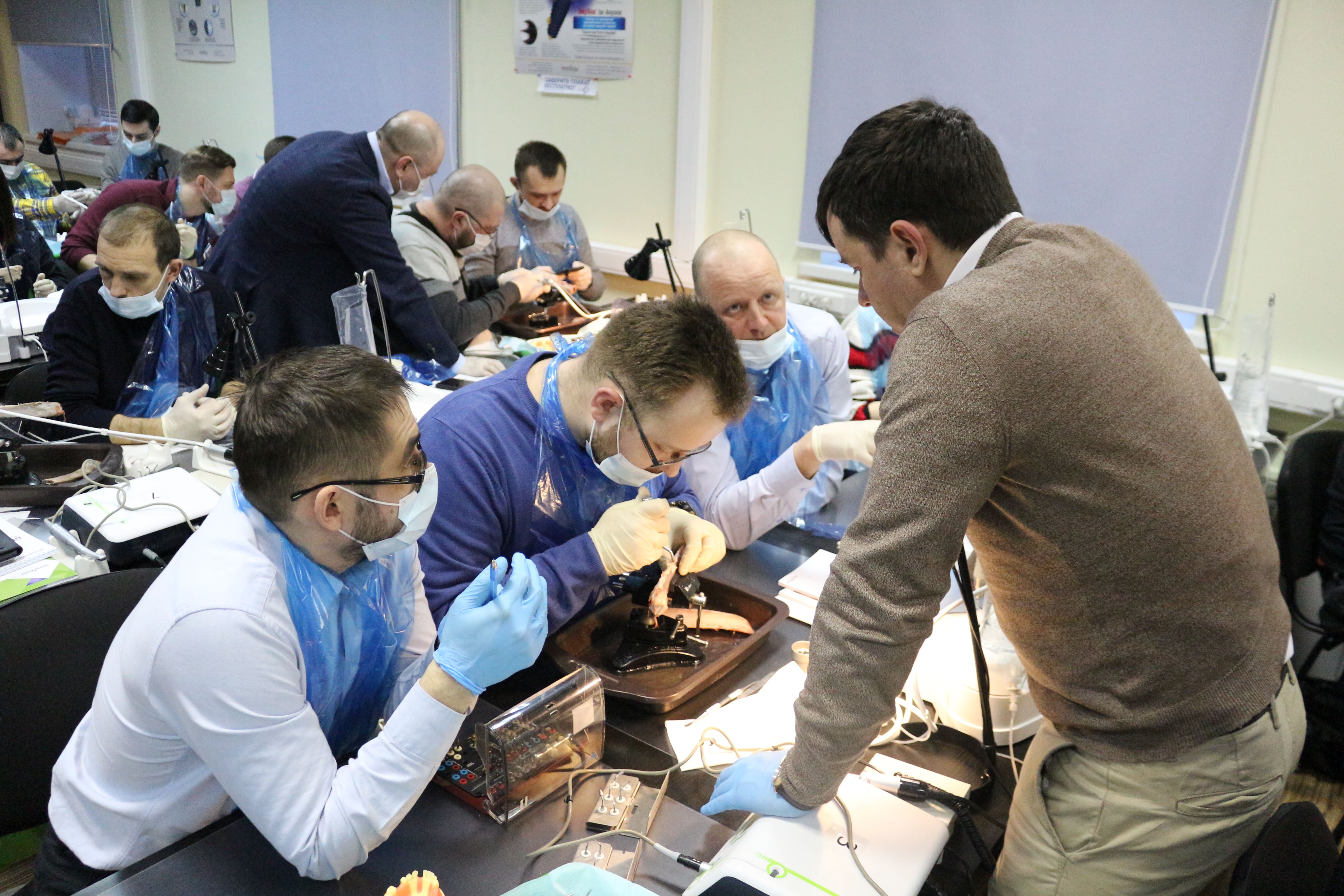 На практическом занятии доктора учились проводить открытый синус-лифтинг с помощью универсального набора Impro и набора Megagen на фантоме верхней челюсти и на говяжьем ребре, отрабатывали трансальвеолярный синус-лифтинг с помощью остеотомов и трепанов, проводили закрытый синус-лифтинг с помощью набора для гребневого синуса MICA на фантоме верхней челюсти, отрабатывали методики формирования латерального окна на куриных яйцах и на уникальных моделях гайморовой пазухи.