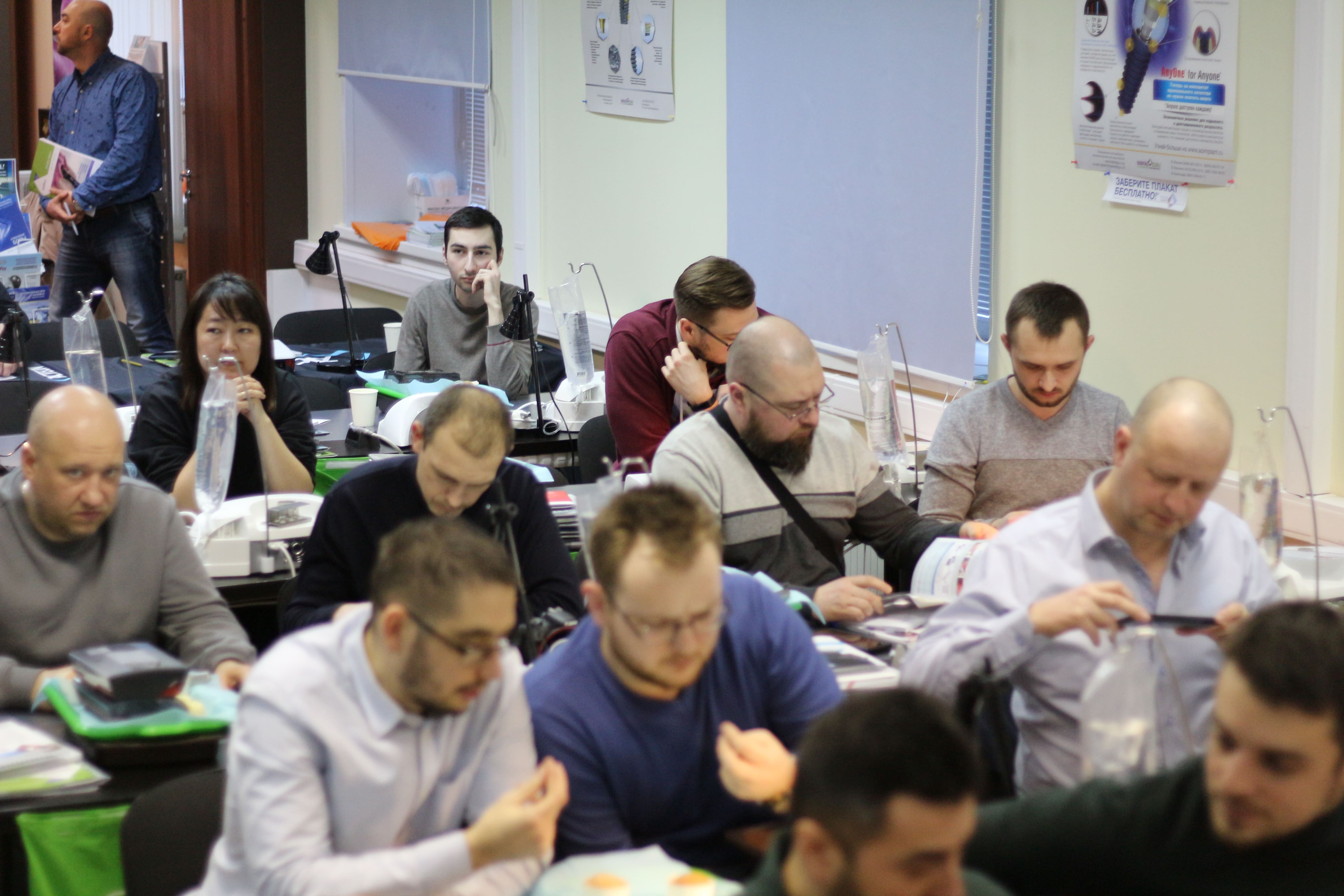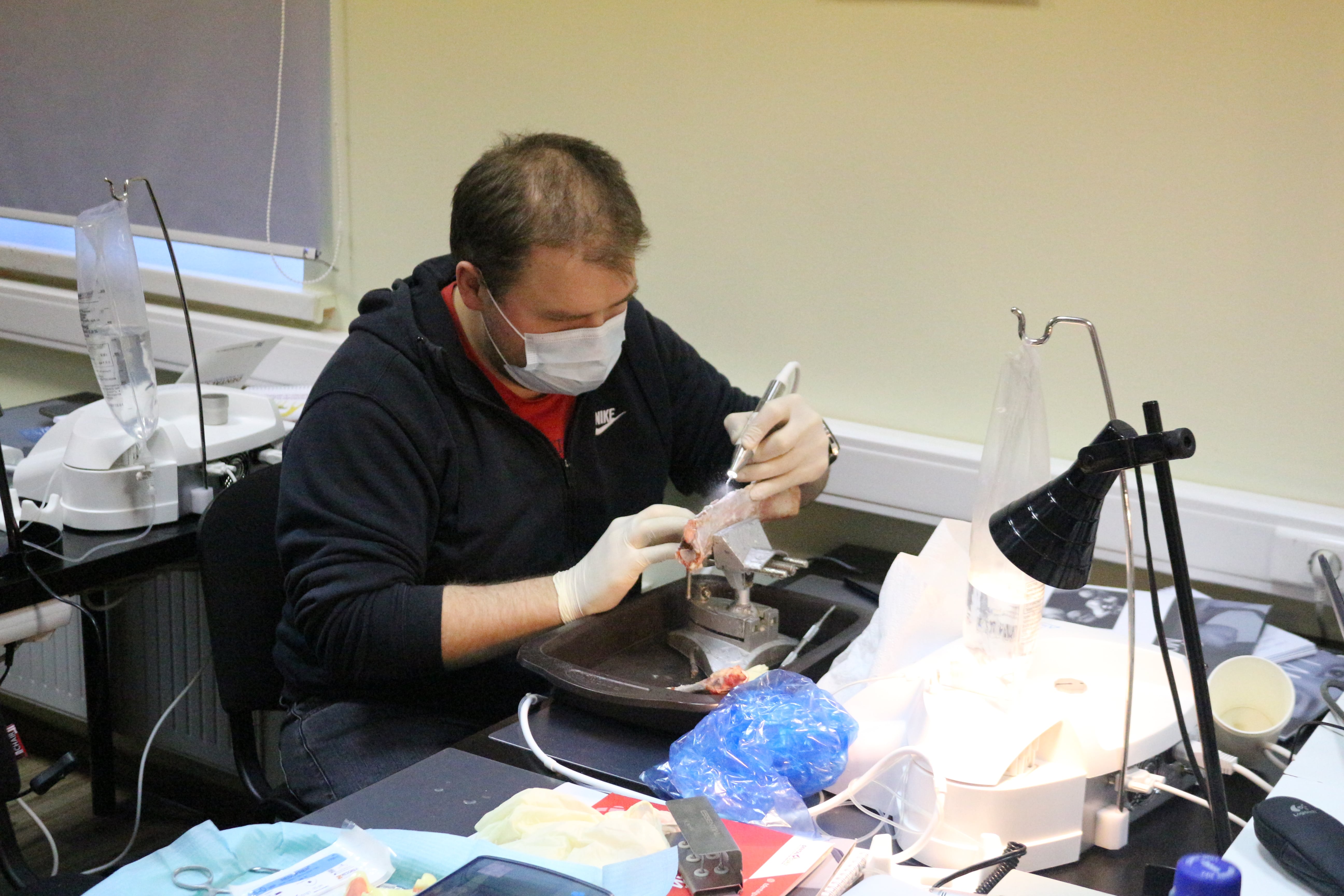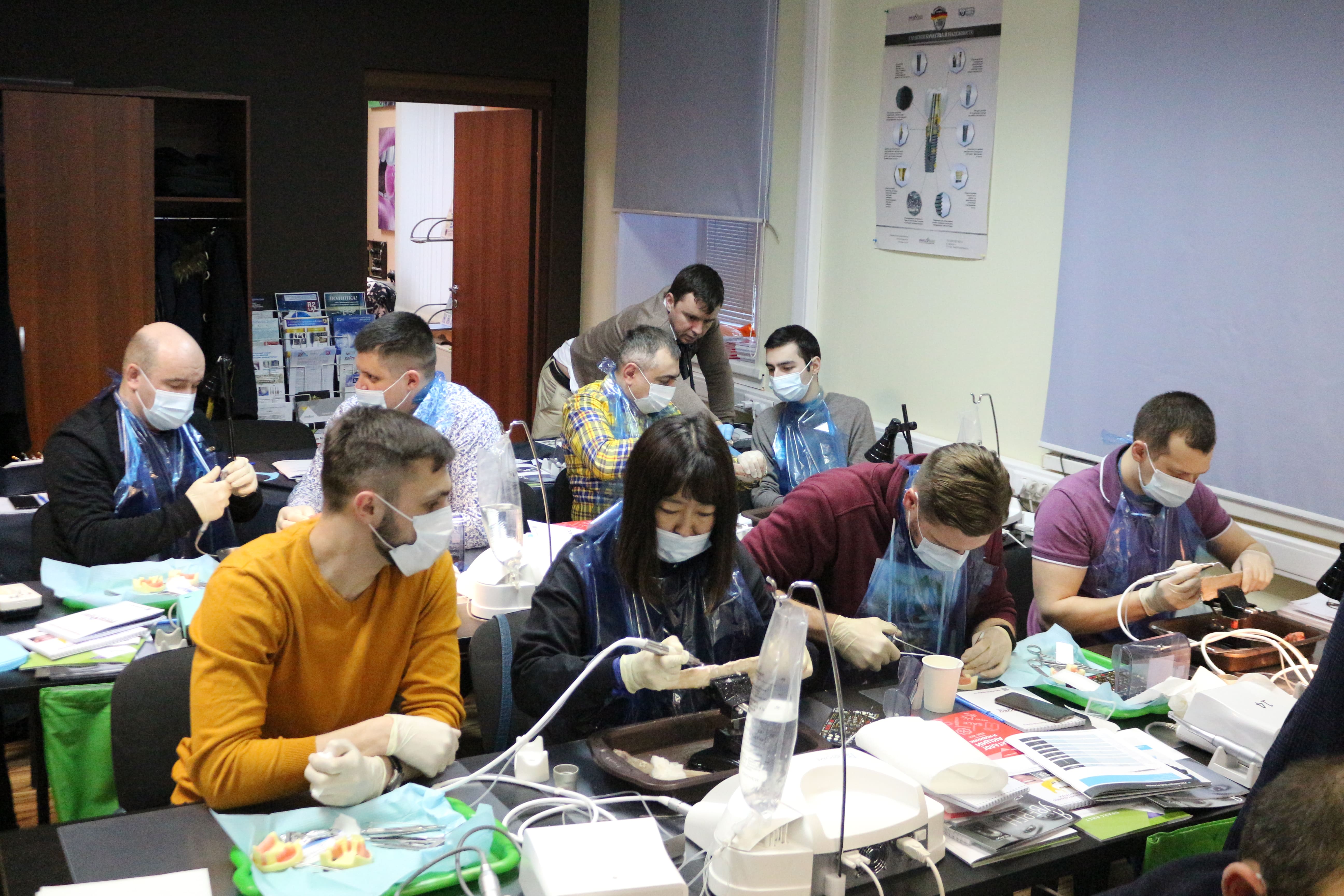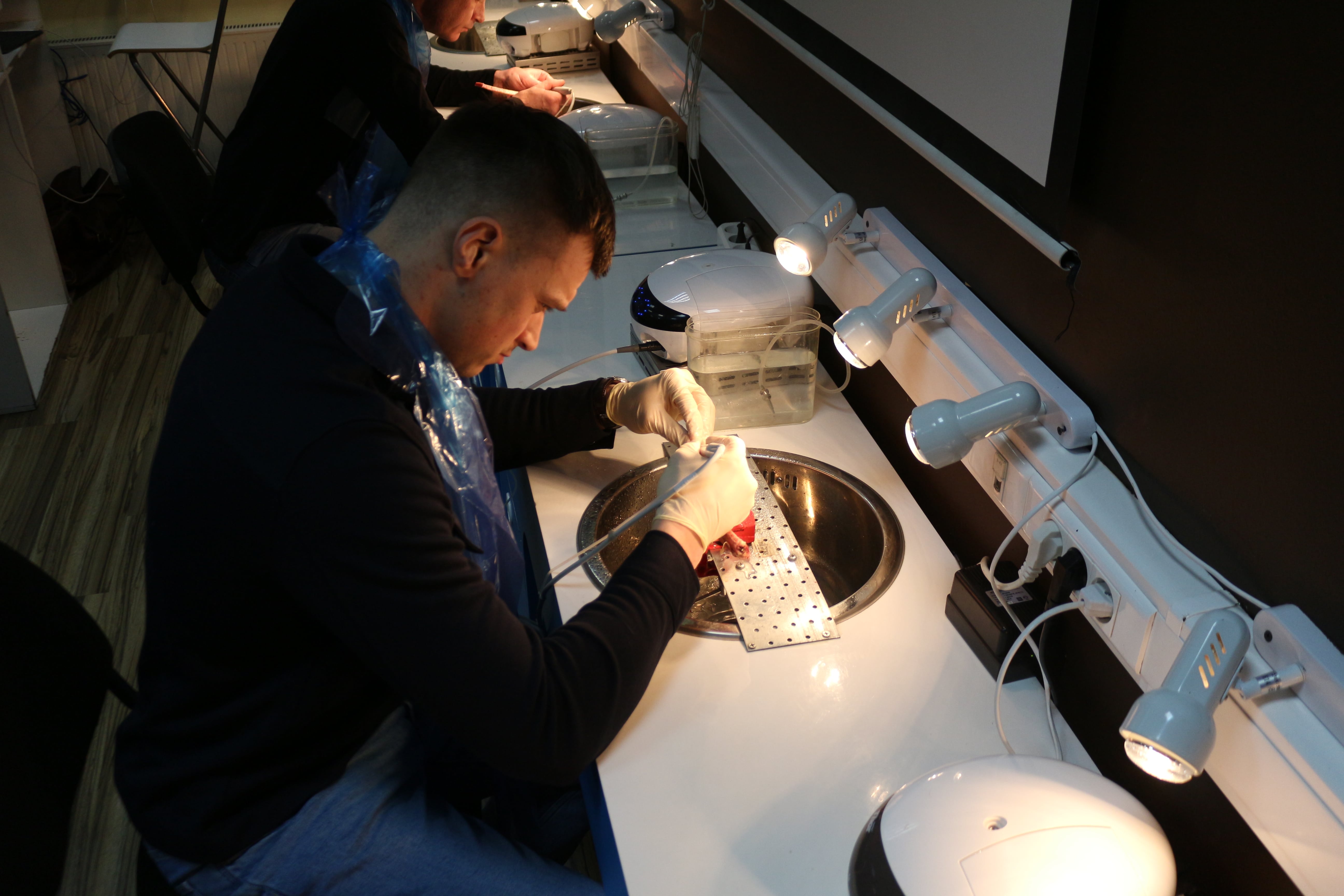 На практическом занятии доктора учились проводить открытый синус-лифтинг с помощью универсального набора Impro и набора Megagen на фантоме верхней челюсти и на говяжьем ребре, отрабатывали трансальвеолярный синус-лифтинг с помощью остеотомов и трепанов, проводили закрытый синус-лифтинг с помощью набора для гребневого синуса MICA на фантоме верхней челюсти, отрабатывали методики формирования латерального окна на куриных яйцах и на уникальных моделях гайморовой пазухи.