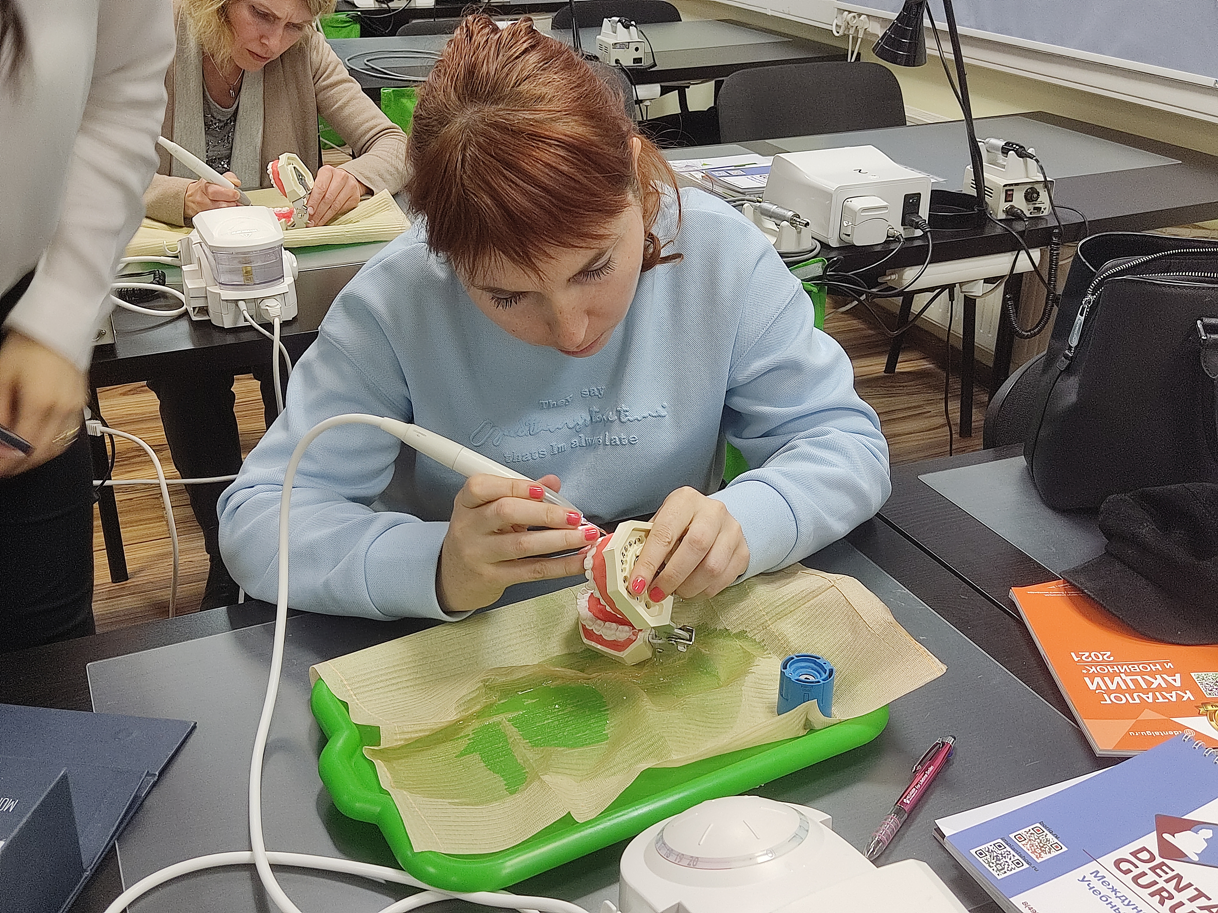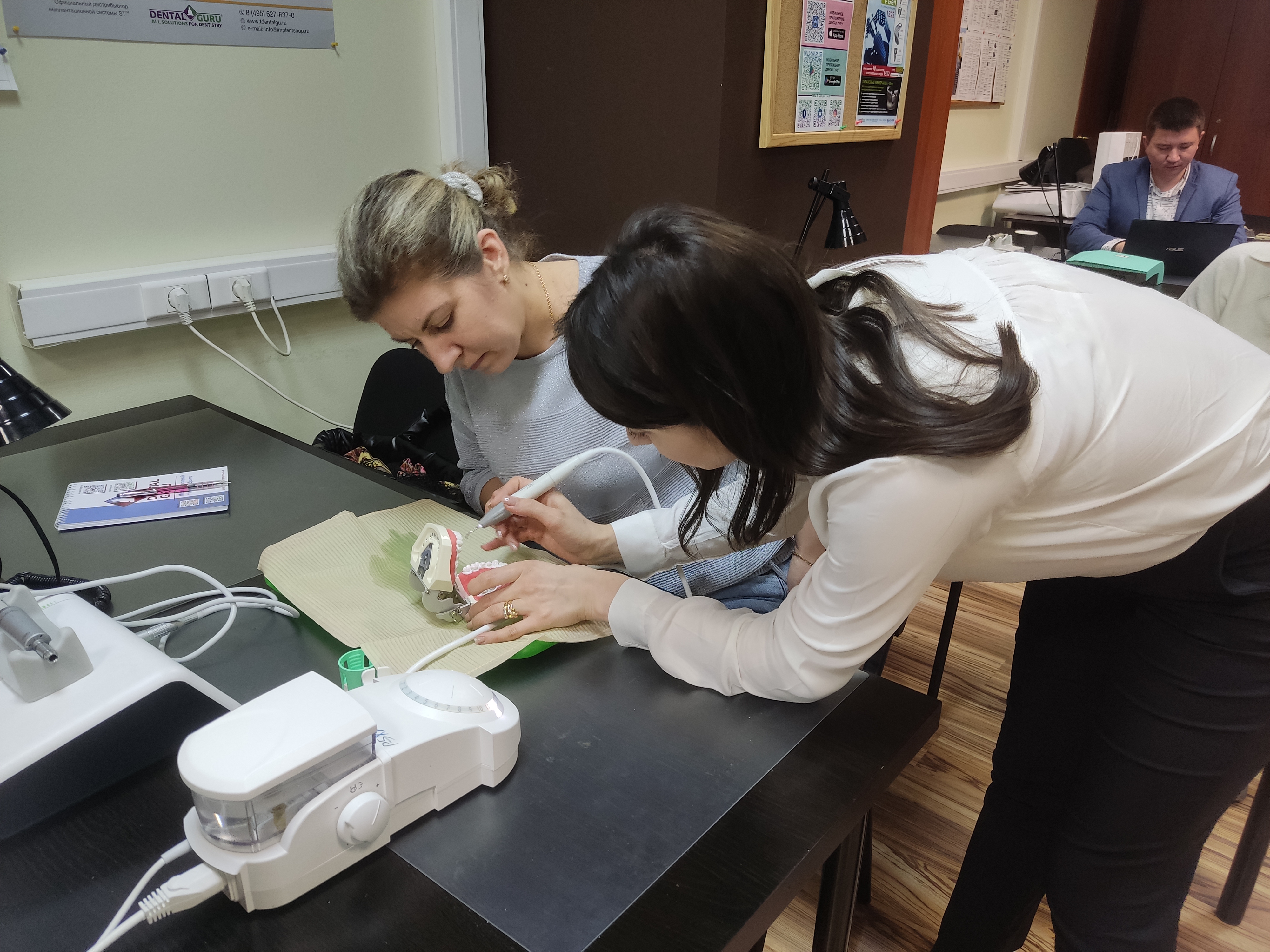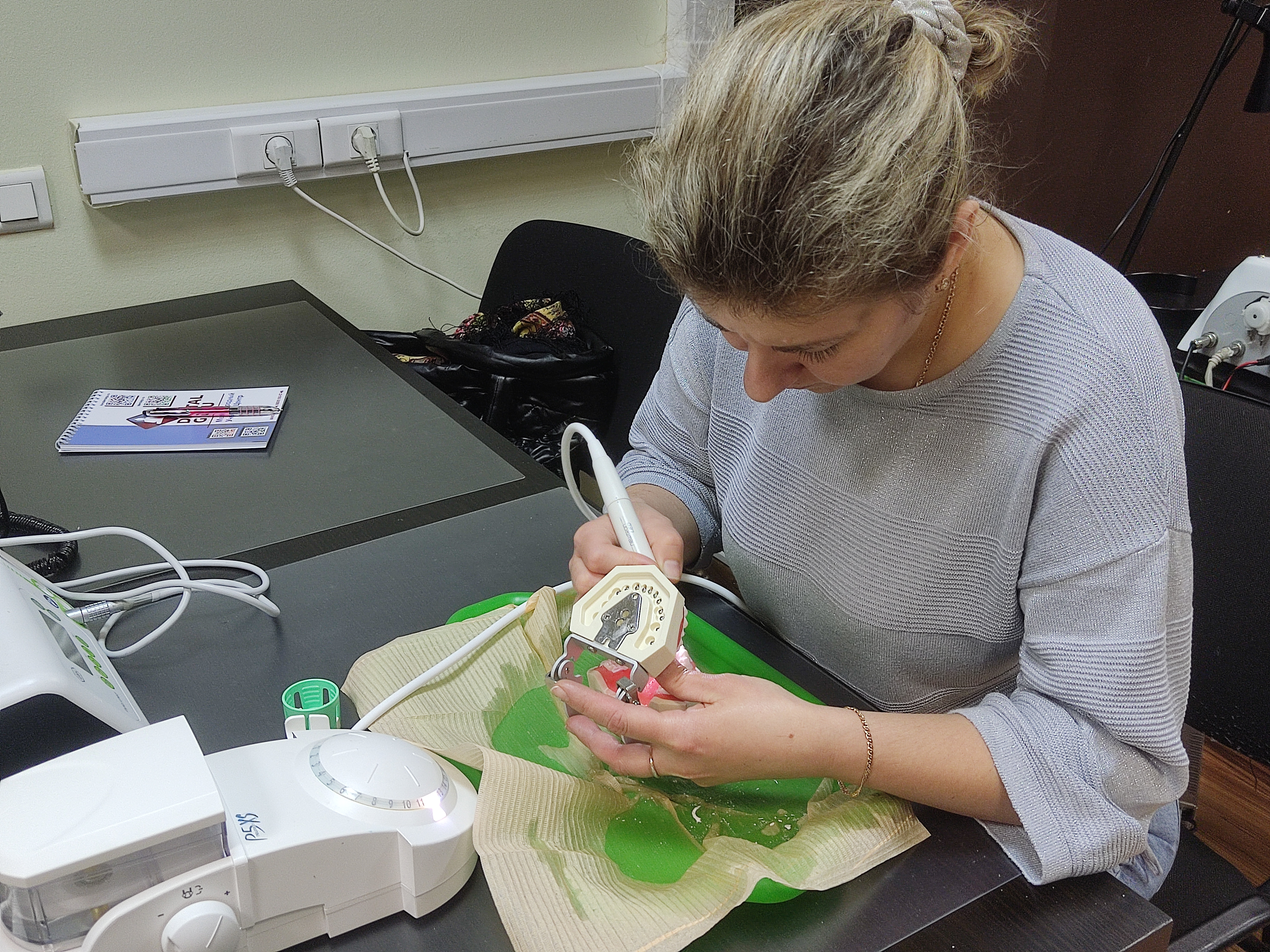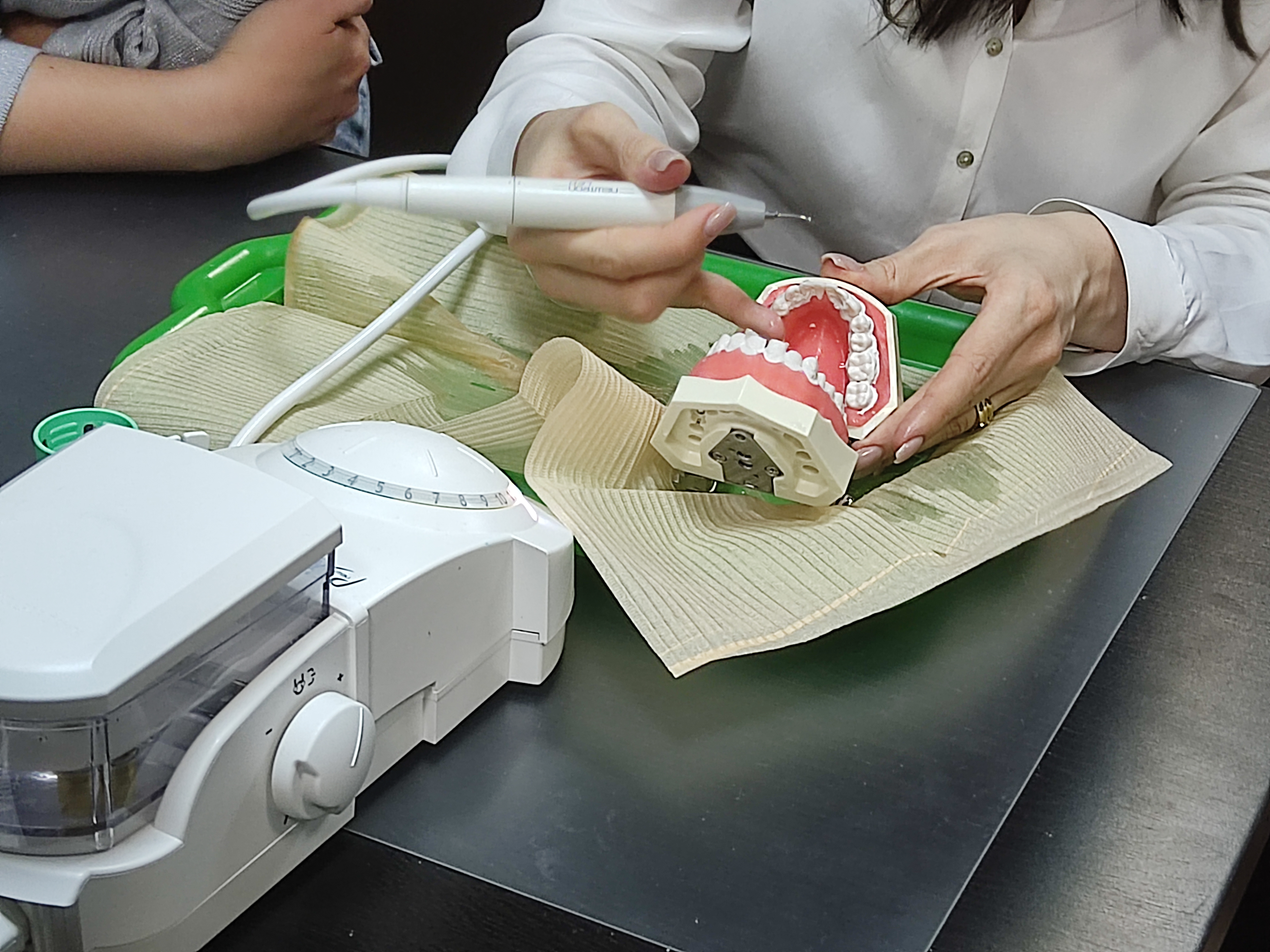 В ходе практического занятия участники курса разобрали последовательность этапов профессиональной гигиены на моделях, научились работать на аппарате airflow и ультразвуковом скеллере с различными насадками для каждой группы и поверхности зубов, составили план проведения профессиональной гигиены на основе клинического случая.
