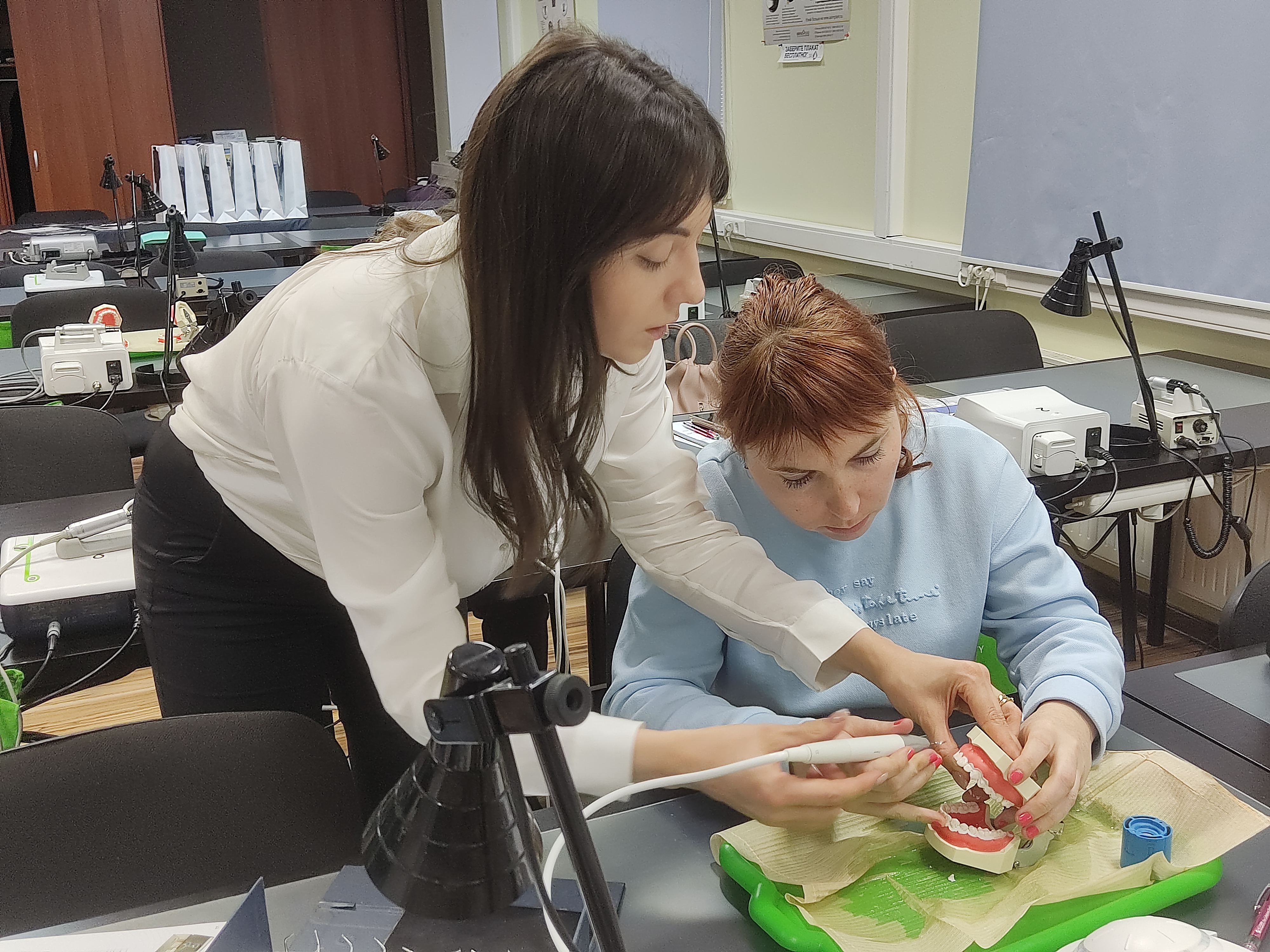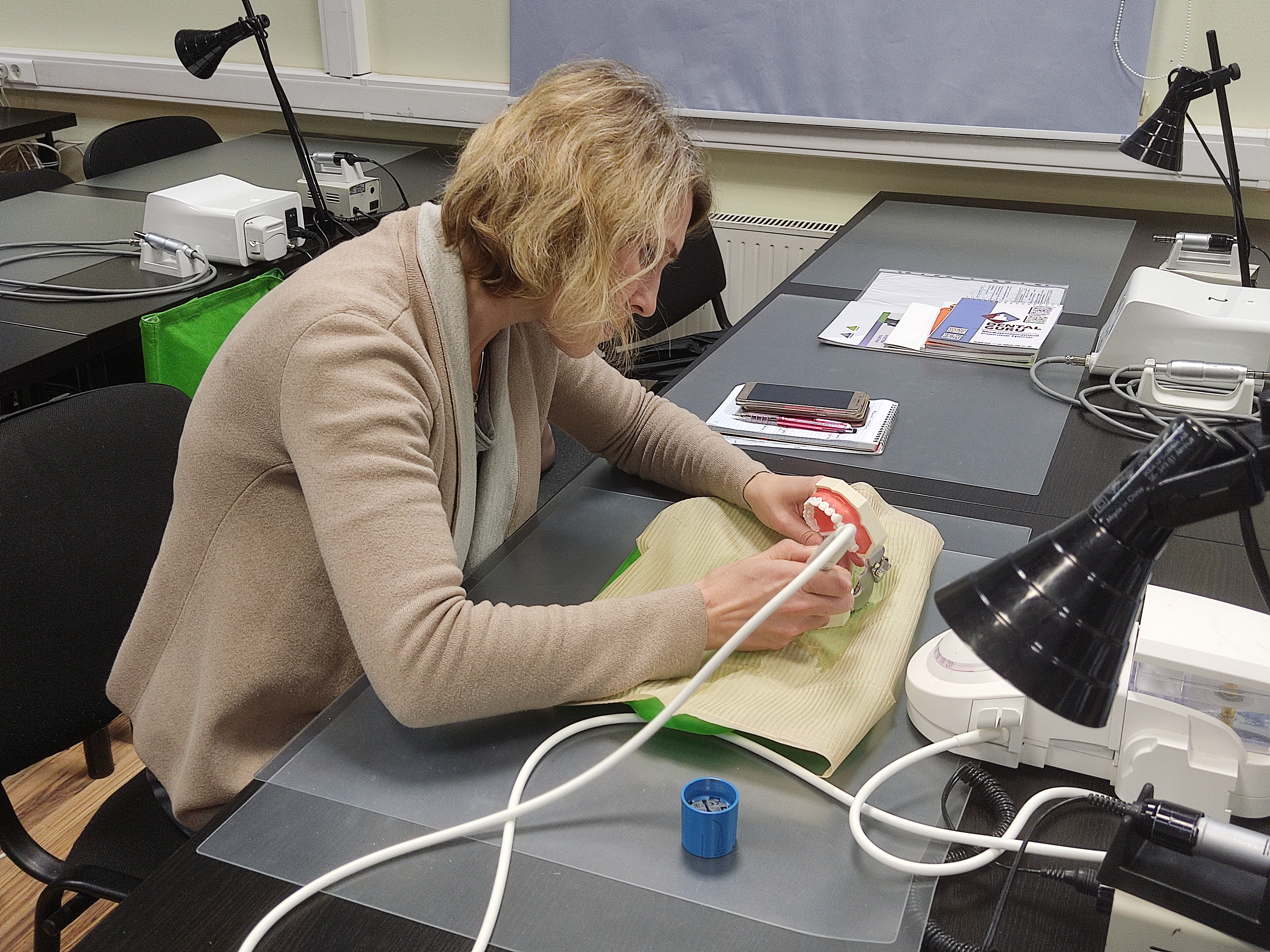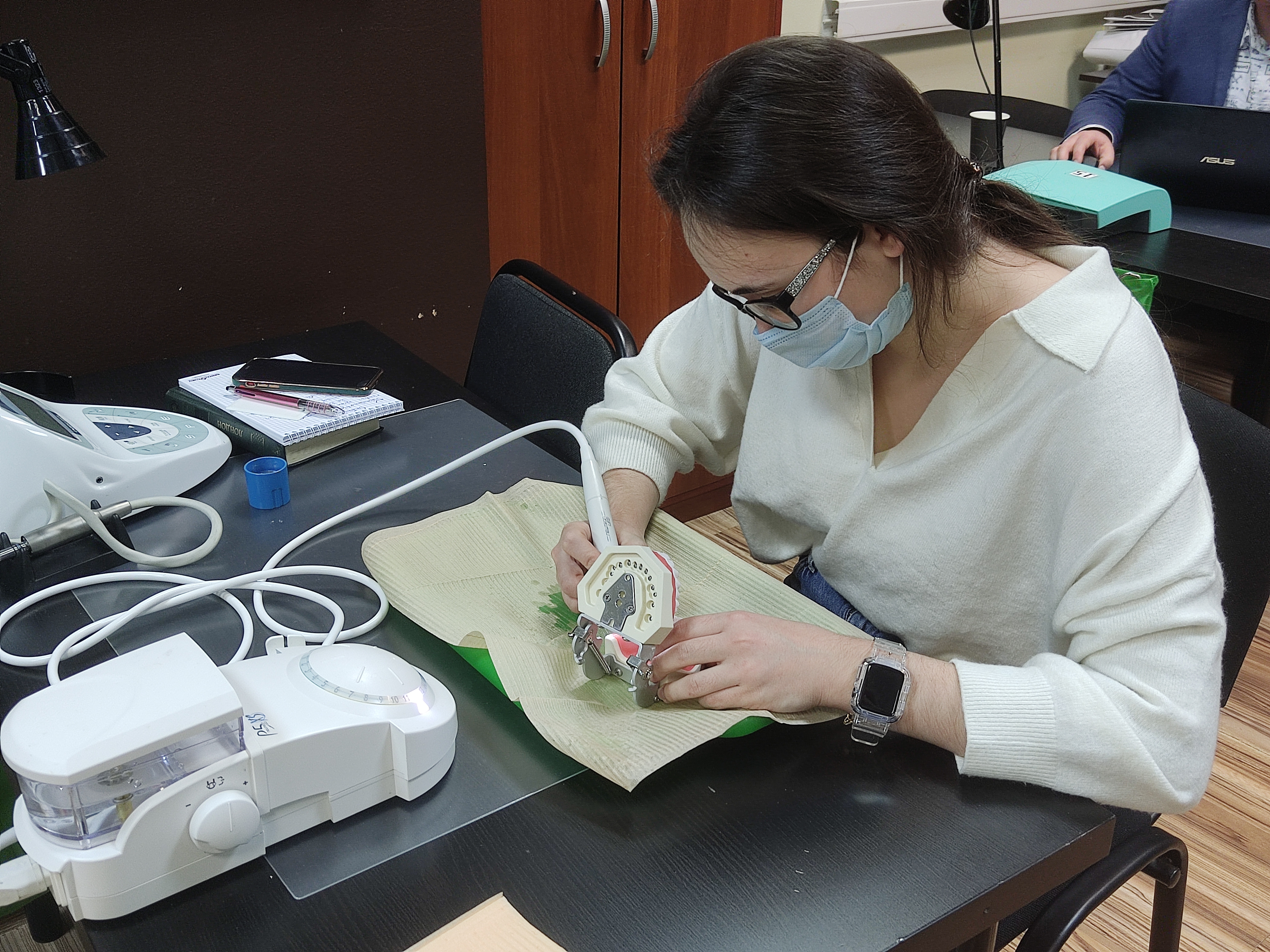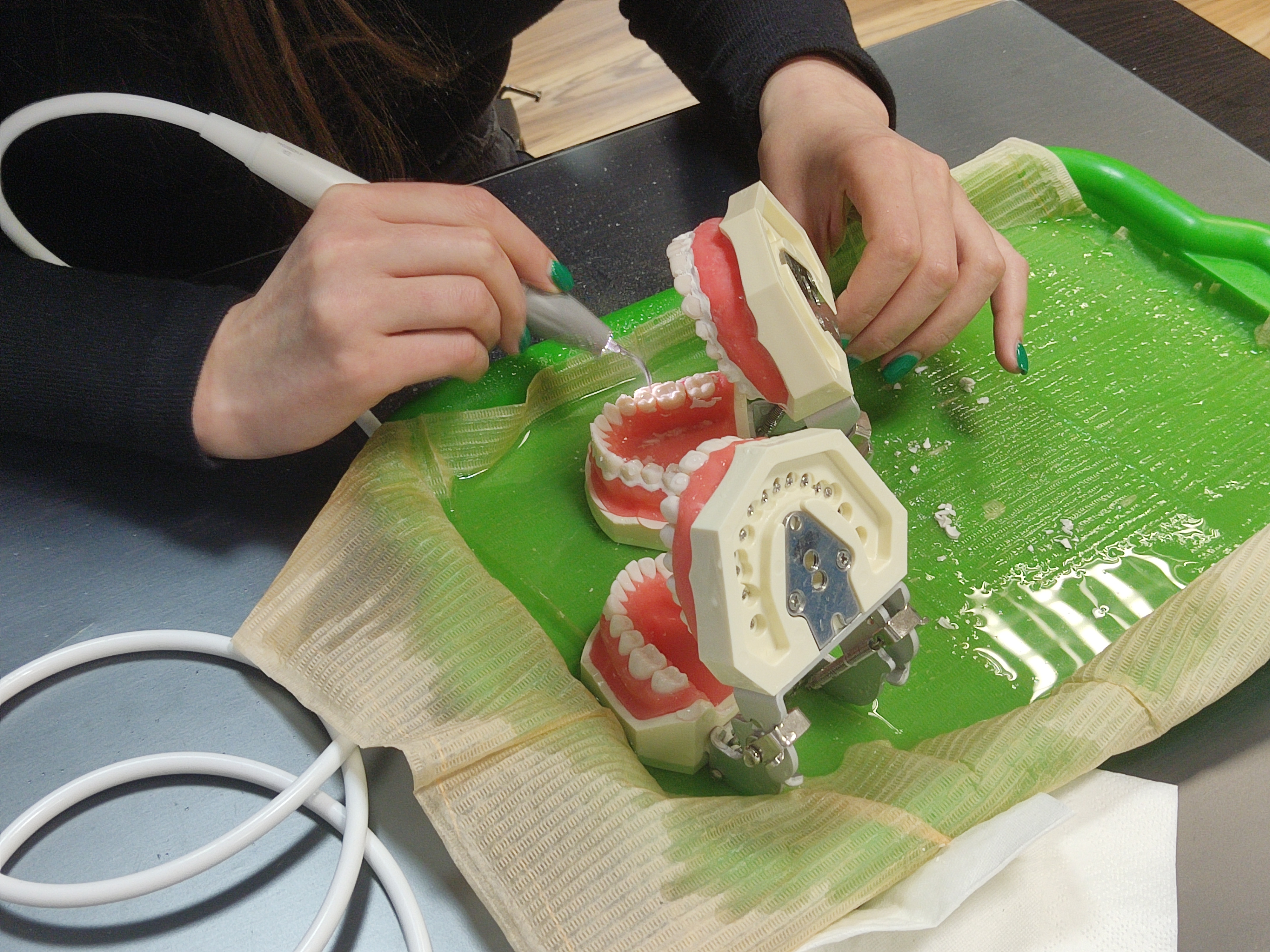 В ходе практического занятия участники курса разобрали последовательность этапов профессиональной гигиены на моделях, научились работать на аппарате airflow и ультразвуковом скеллере с различными насадками для каждой группы и поверхности зубов, составили план проведения профессиональной гигиены на основе клинического случая.