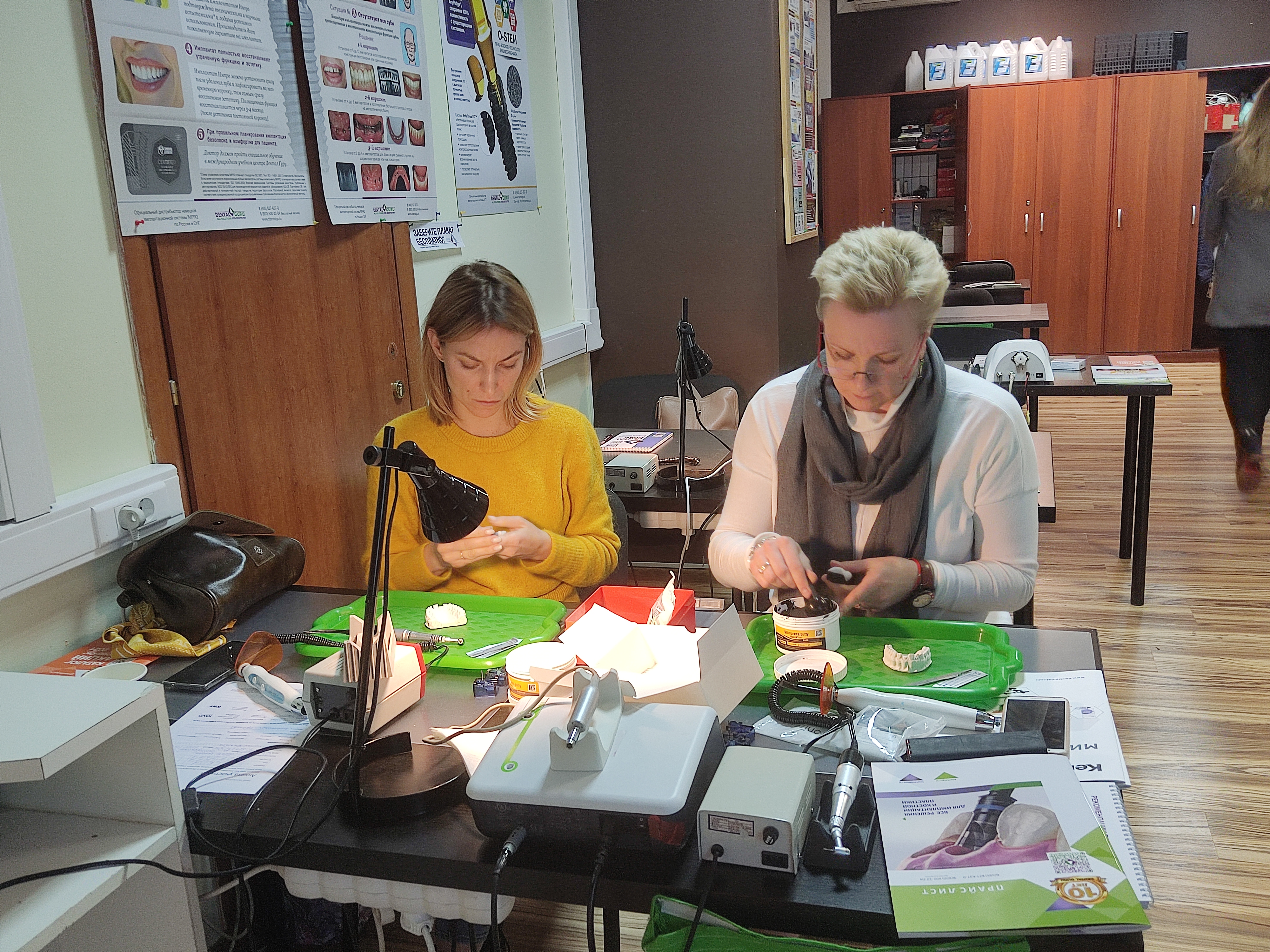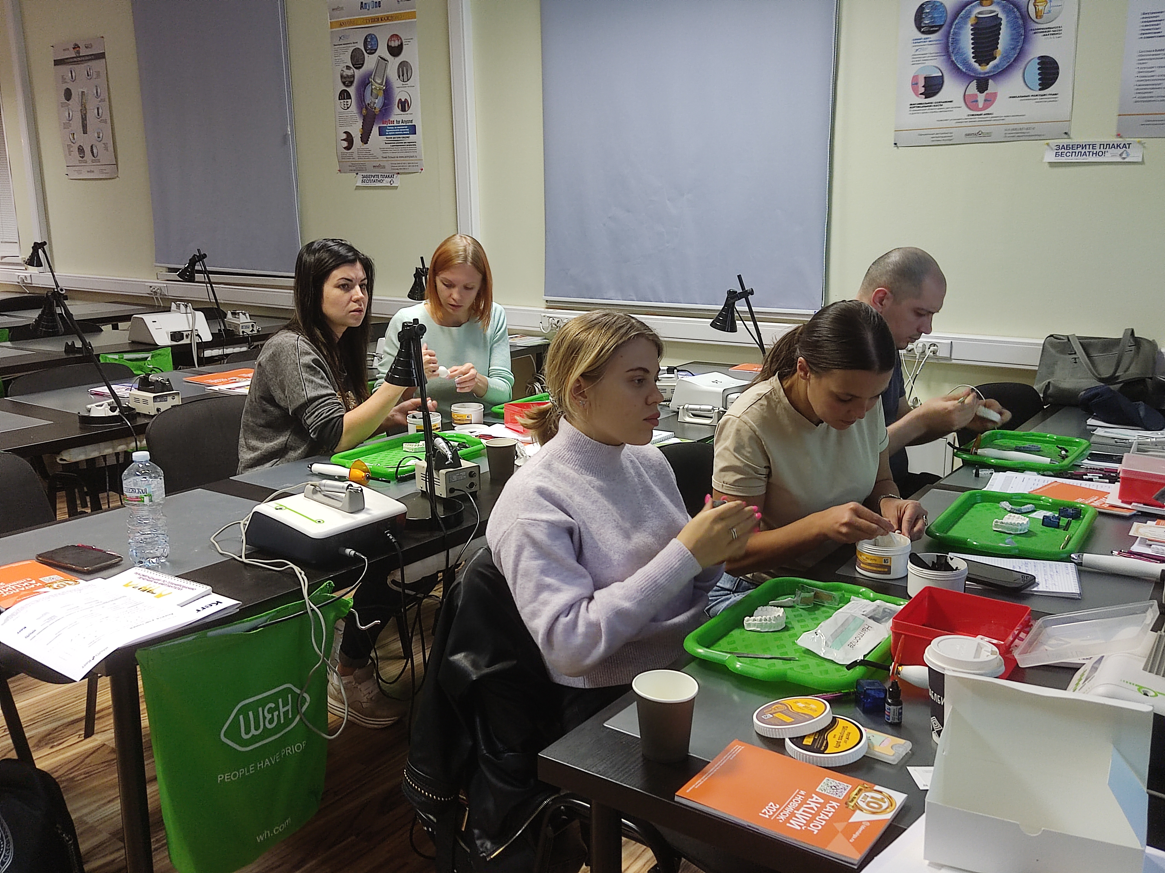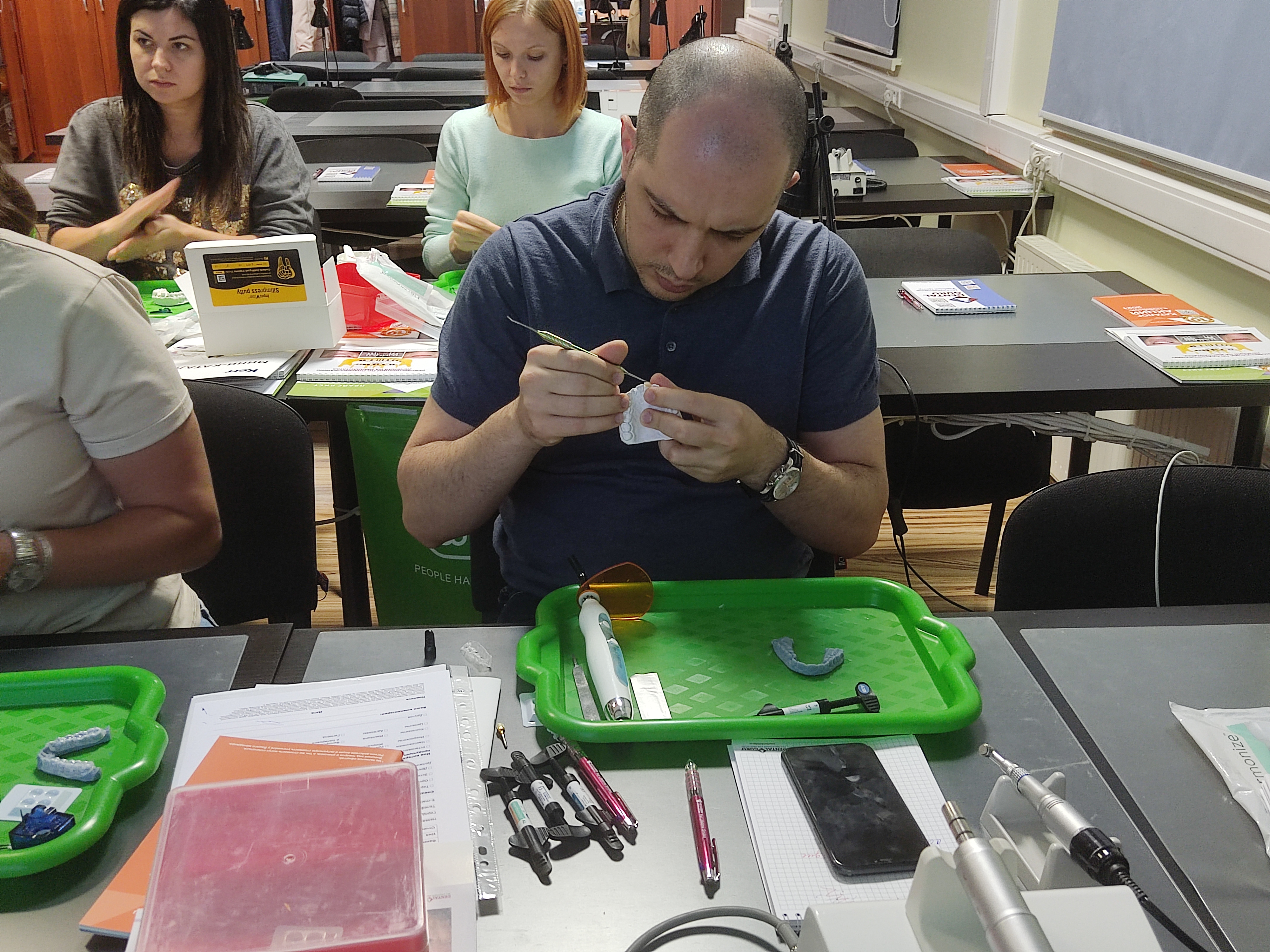 На практическом занятии отрабатывали создание режущего края с различными оптическими характеристиками, послойное заполнение реставрации. Учились делать препарирование по 4 классу и нон-преп реставрацию.