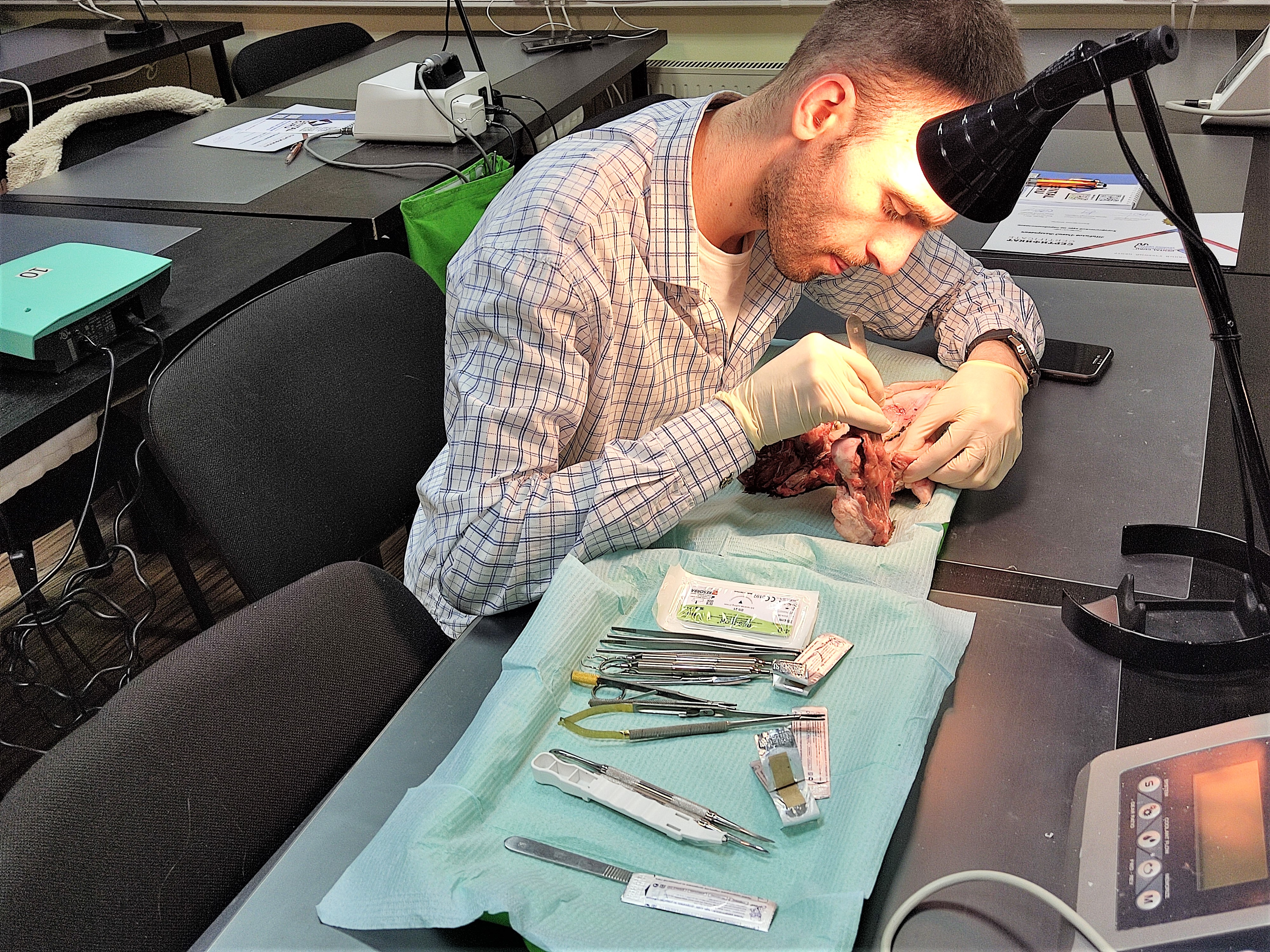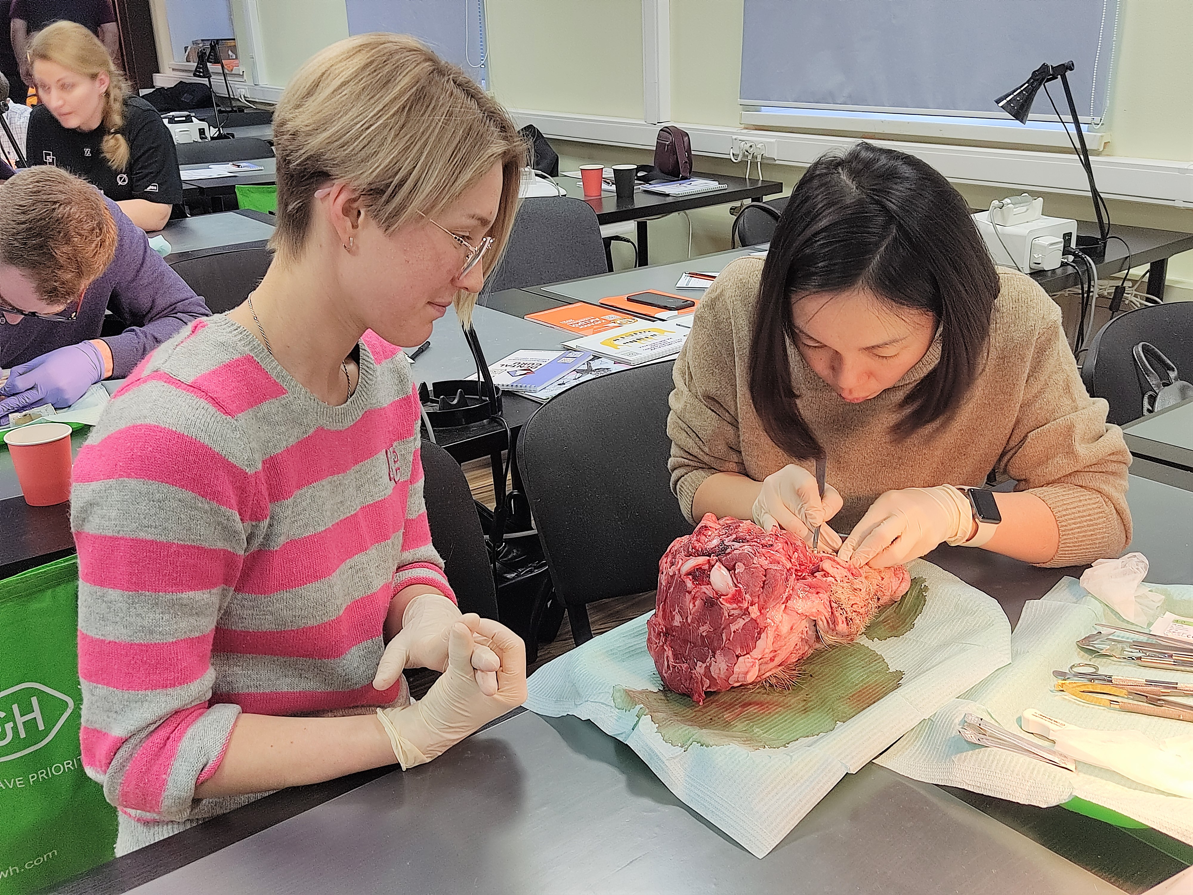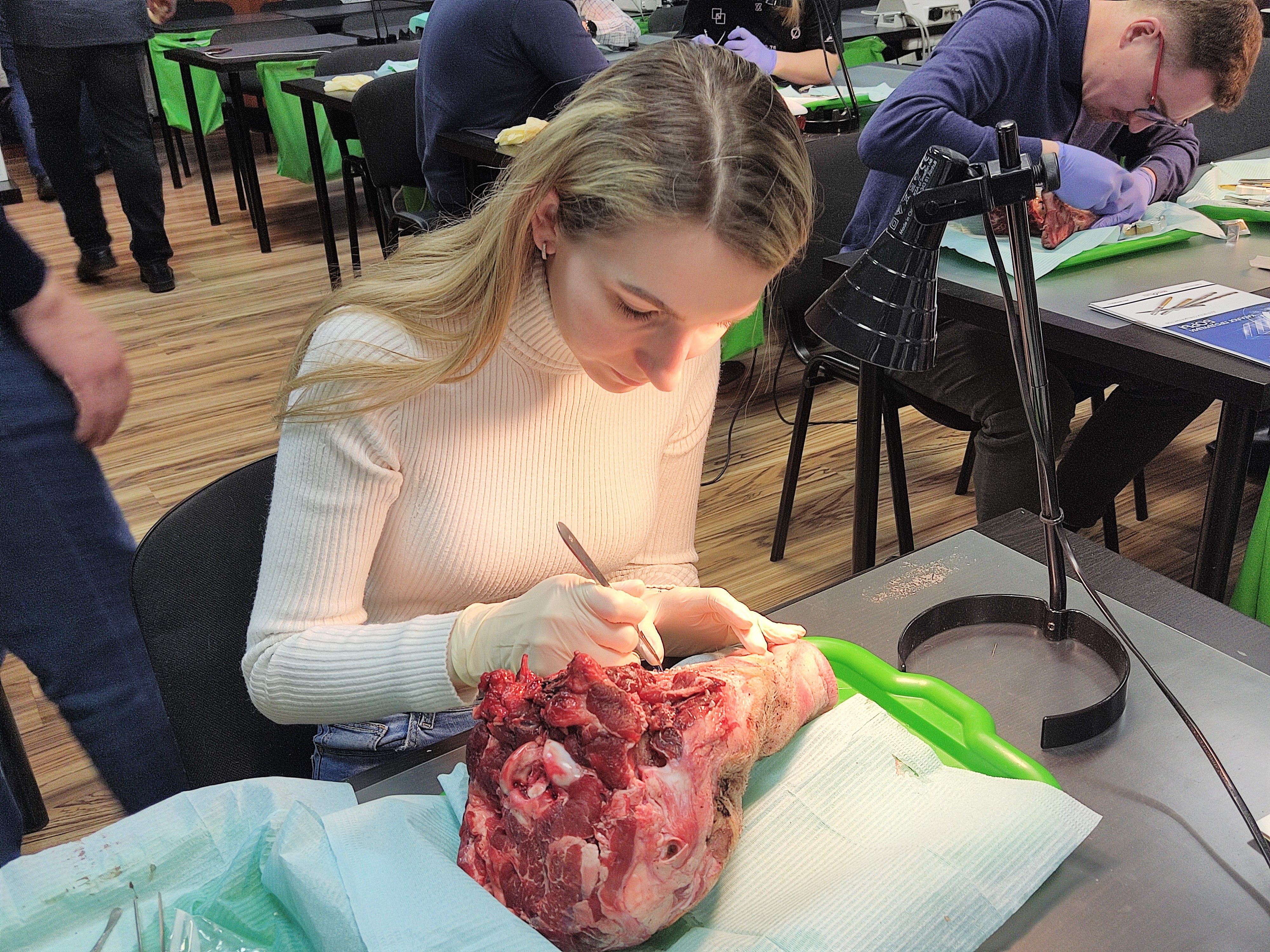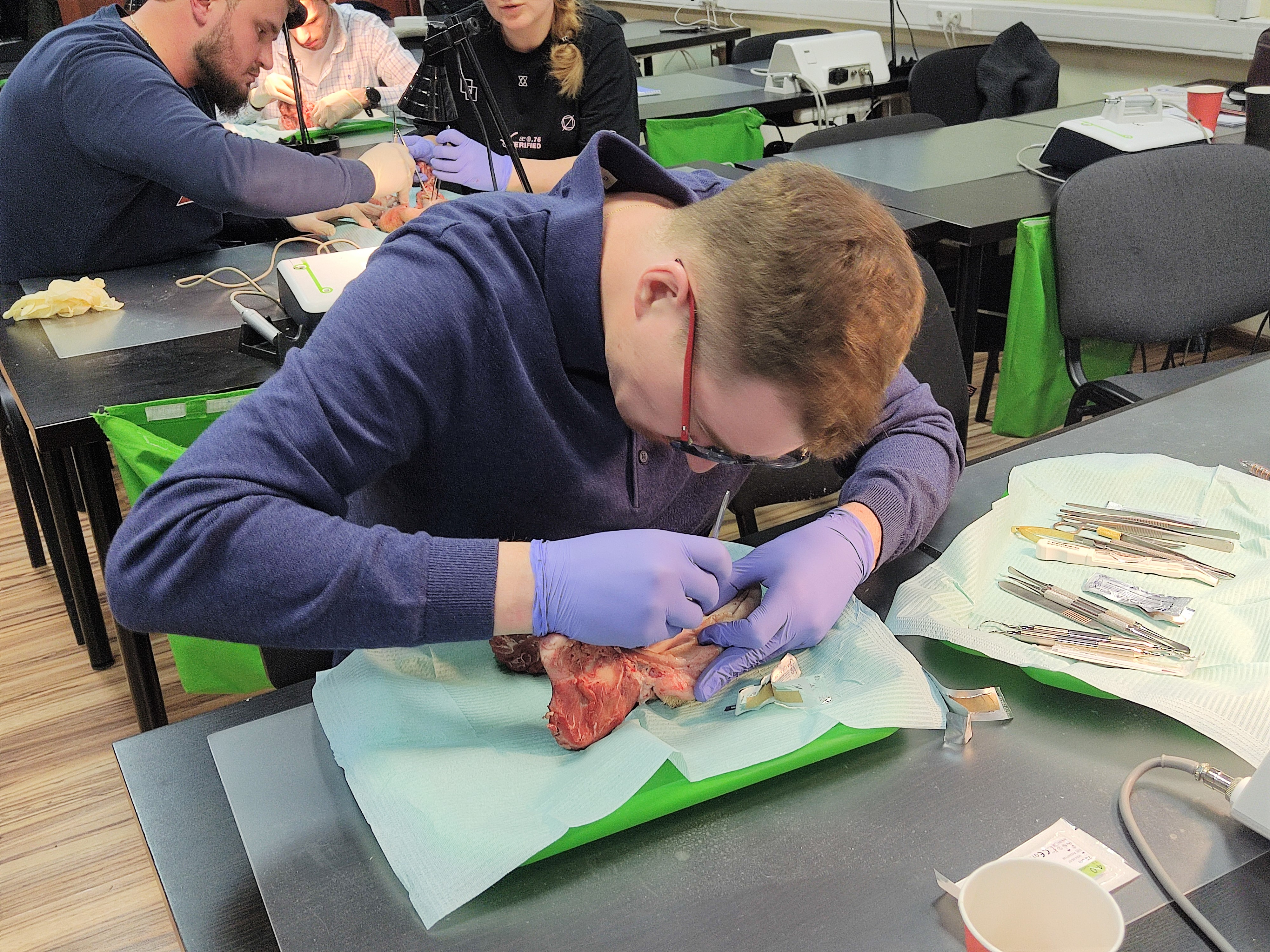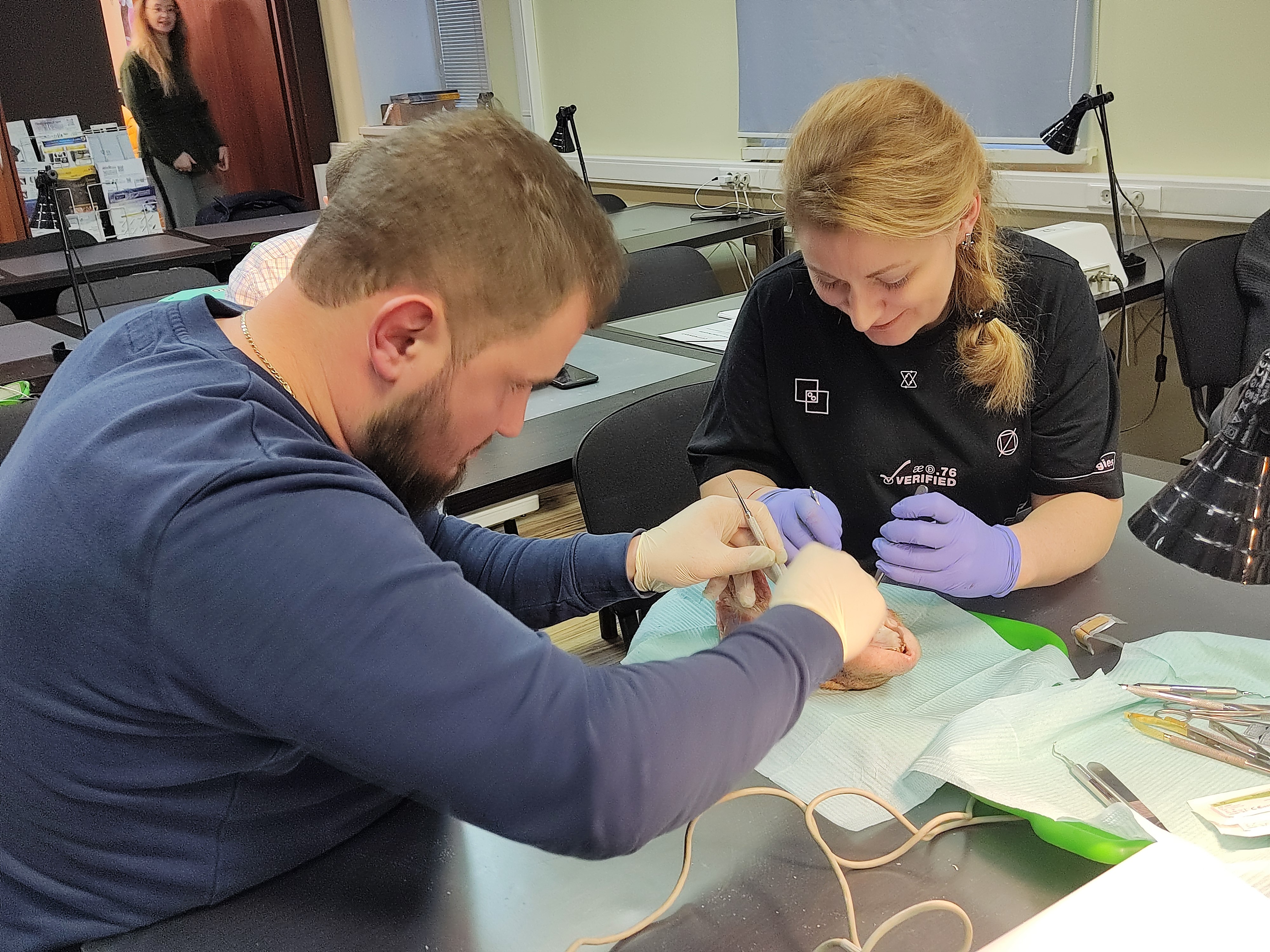 На практическом занятии под руководством эксперта, доктора на биологических моделях отрабатывали хирургические вмешательства на пародонтальном кармане и на мягких тканях, учились проводить различные шовные методики.