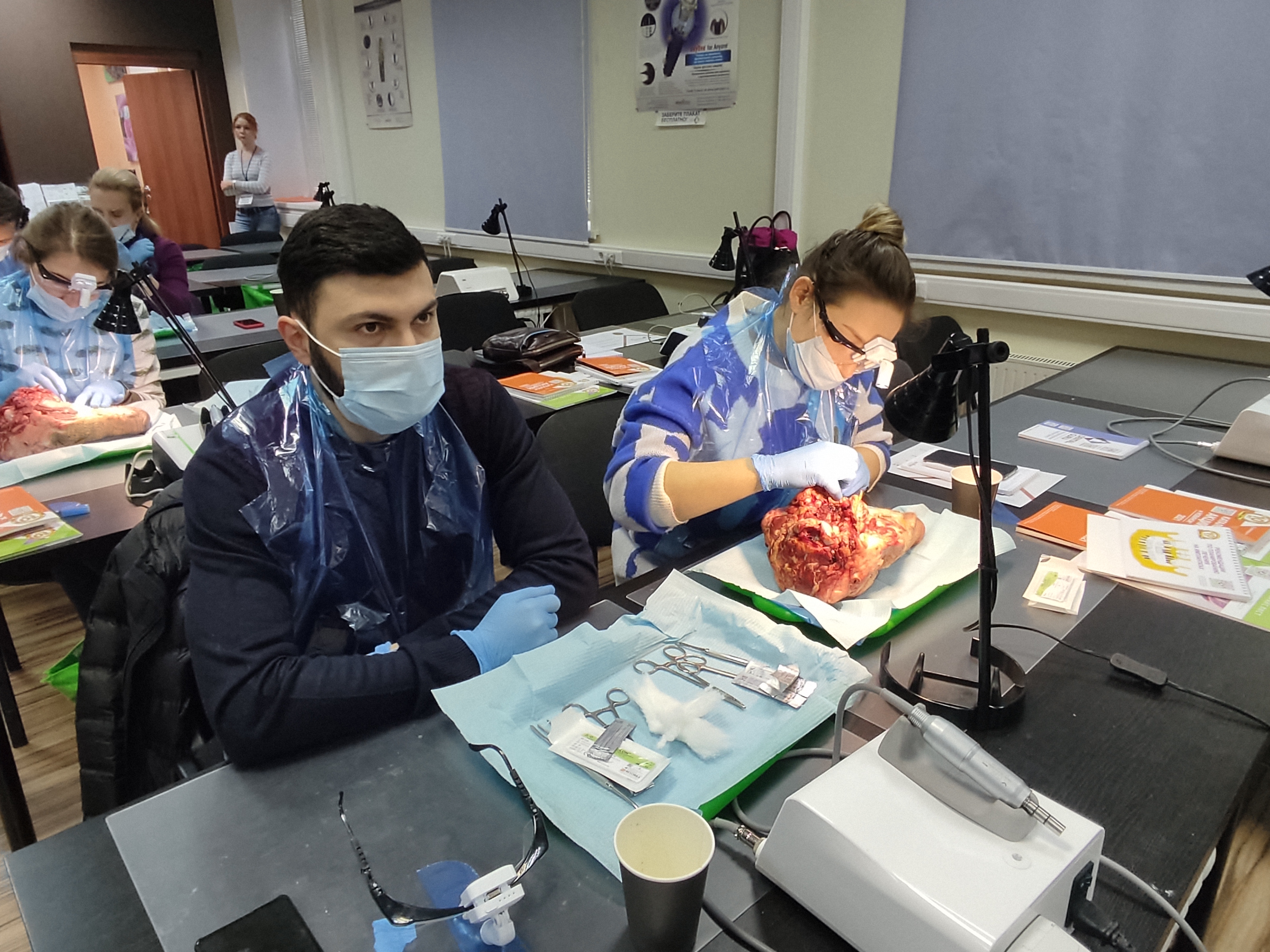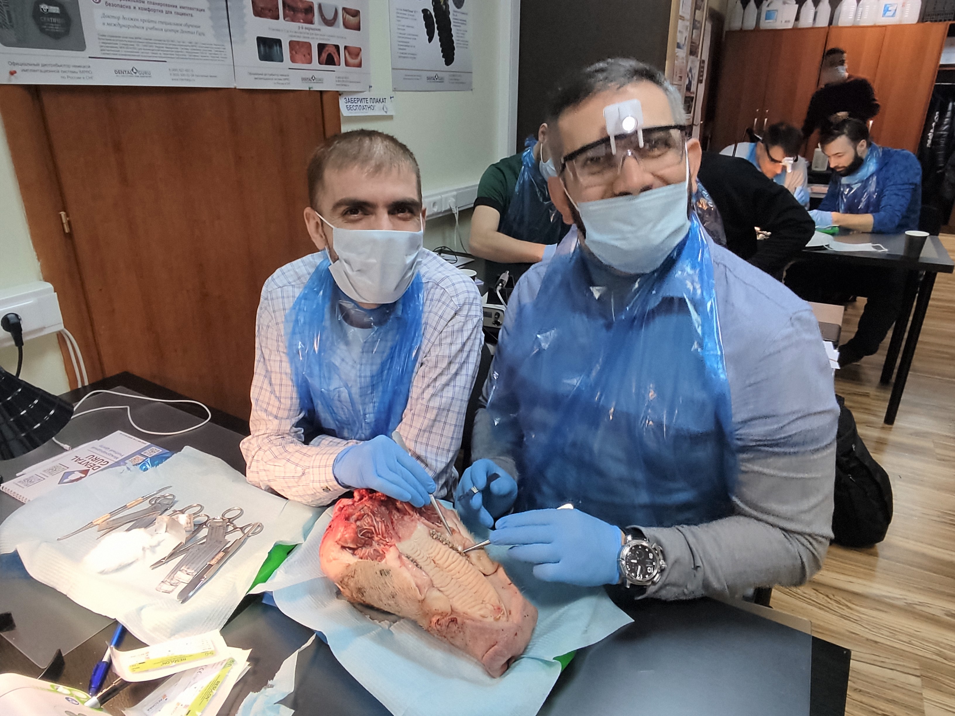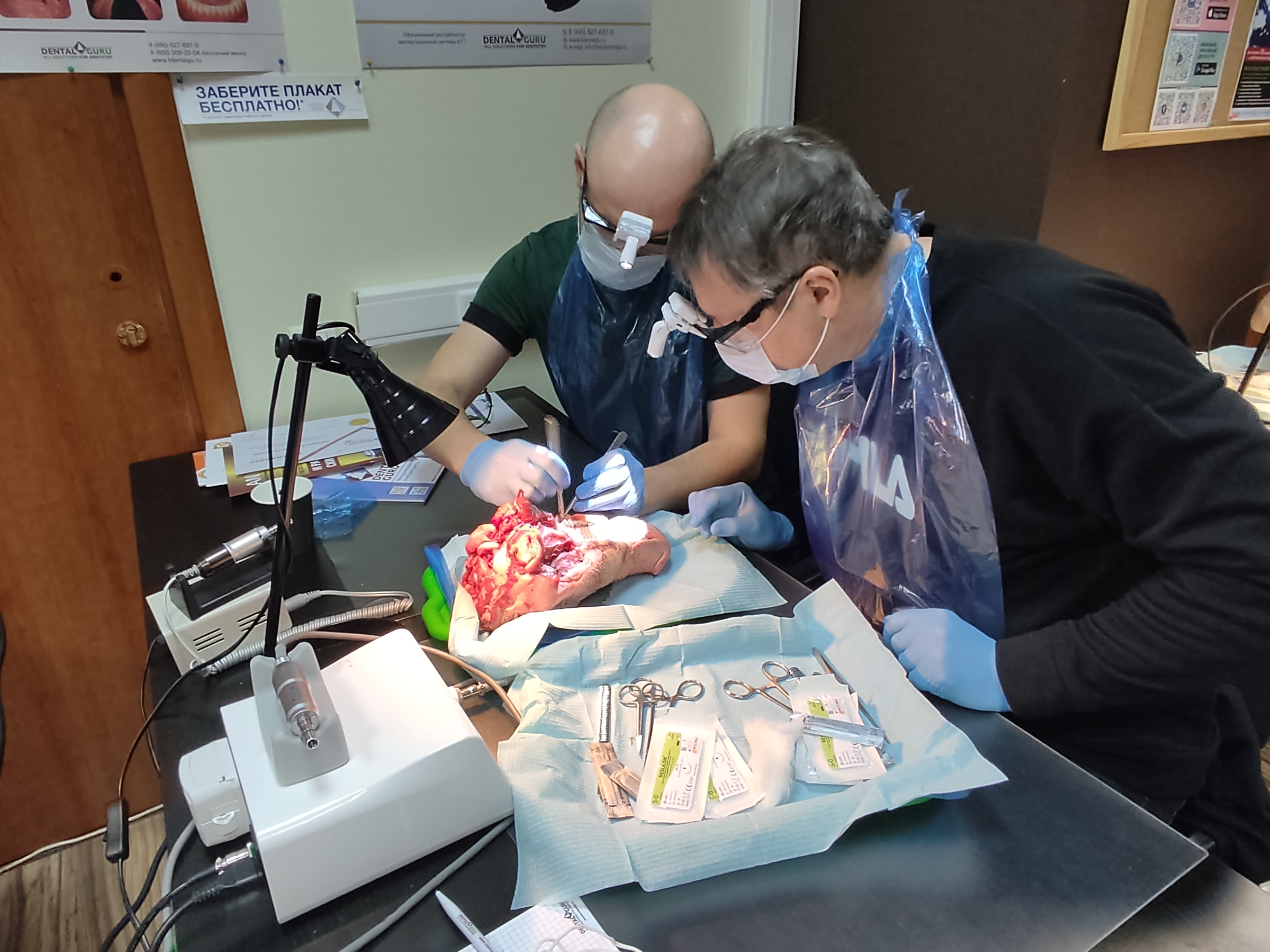 На практической части курса доктора на биологических моделях научились получать десневой трансплантат, СТТ с неба и бугра, штрипсы и ротационный лоскут с неба. Учились выполнять вестибулопластику по Казанджану и по Кларку, изучили на практике методику Палаччи и технику апикально-смещенного лоскута.