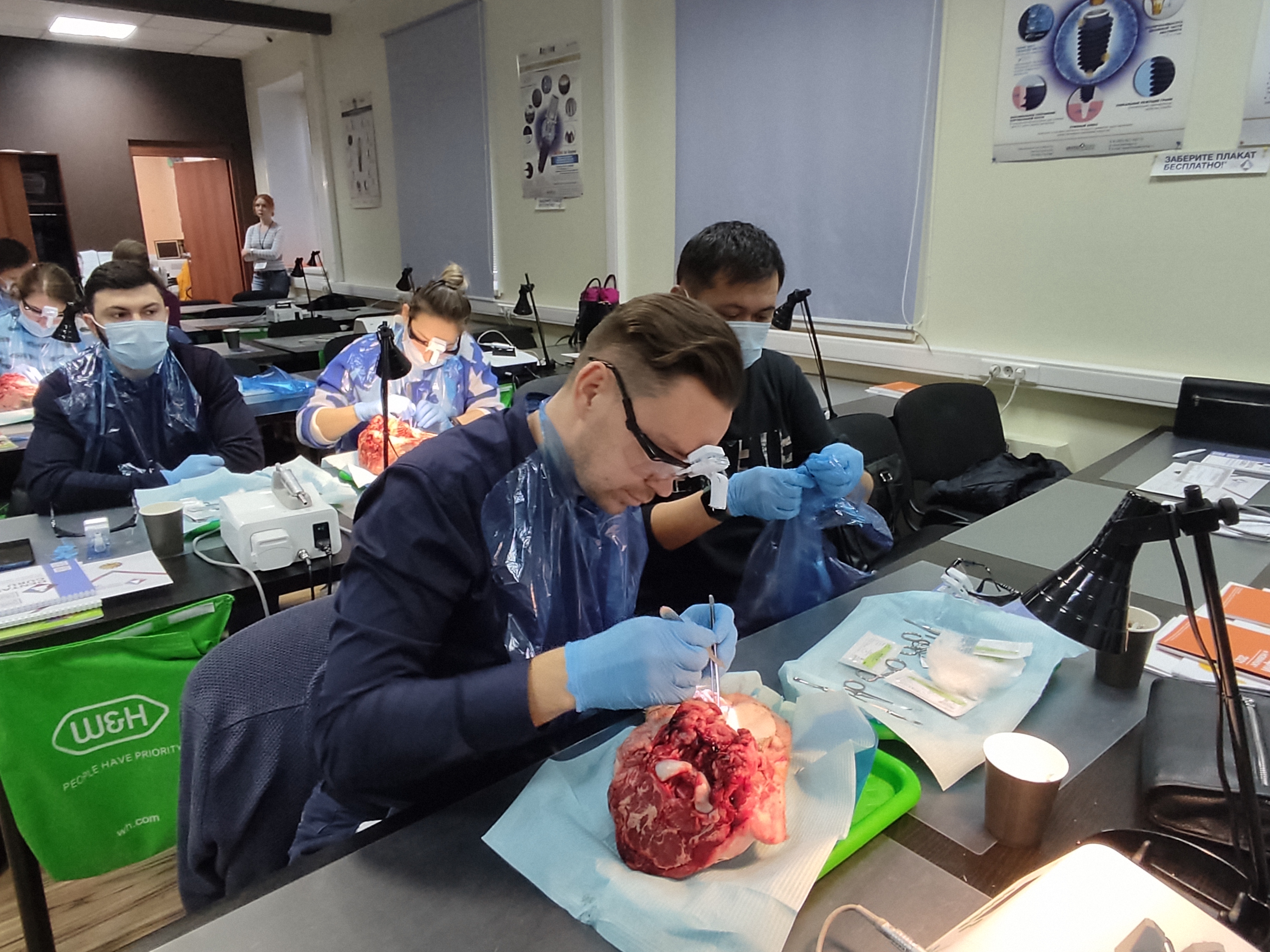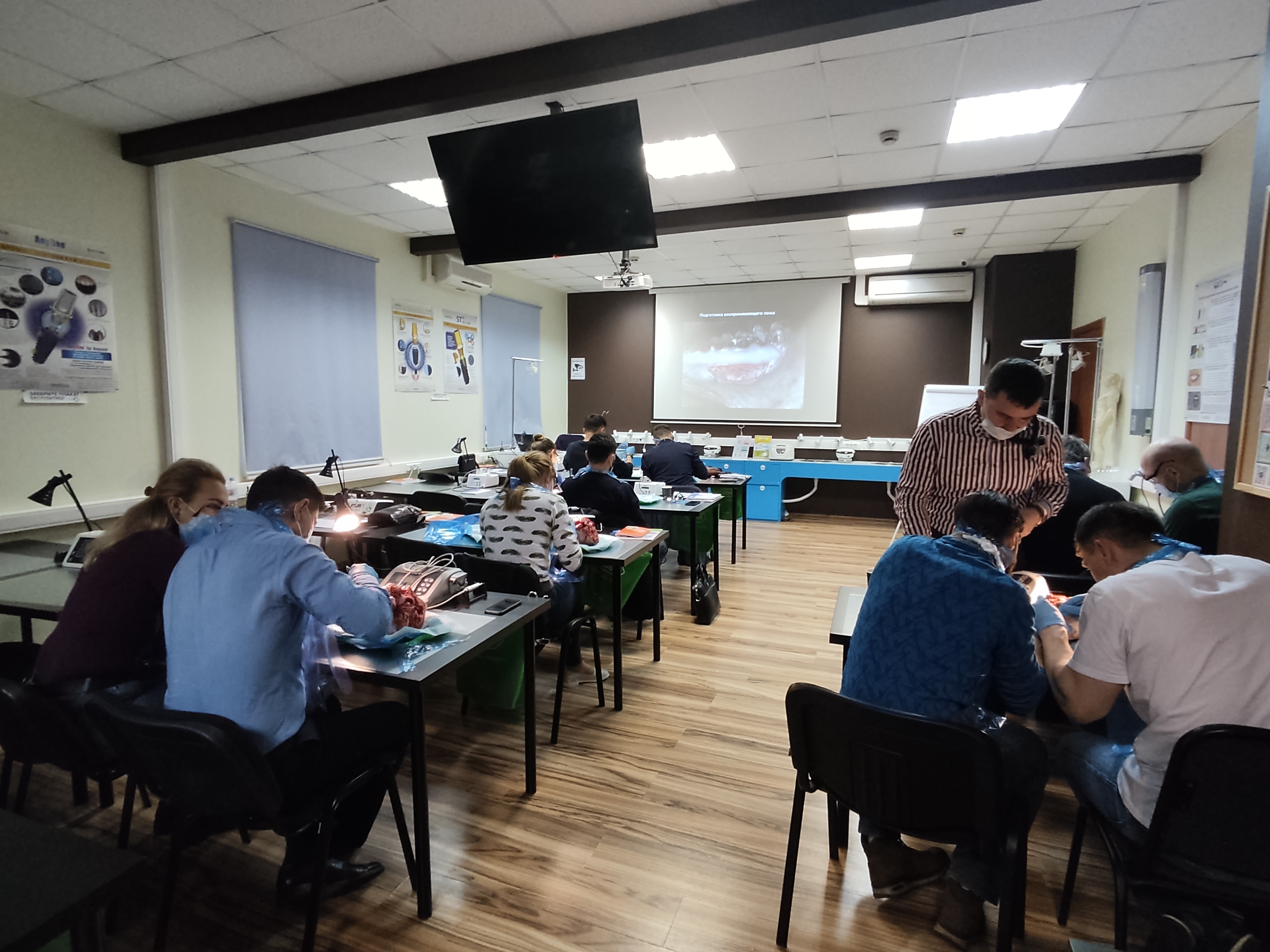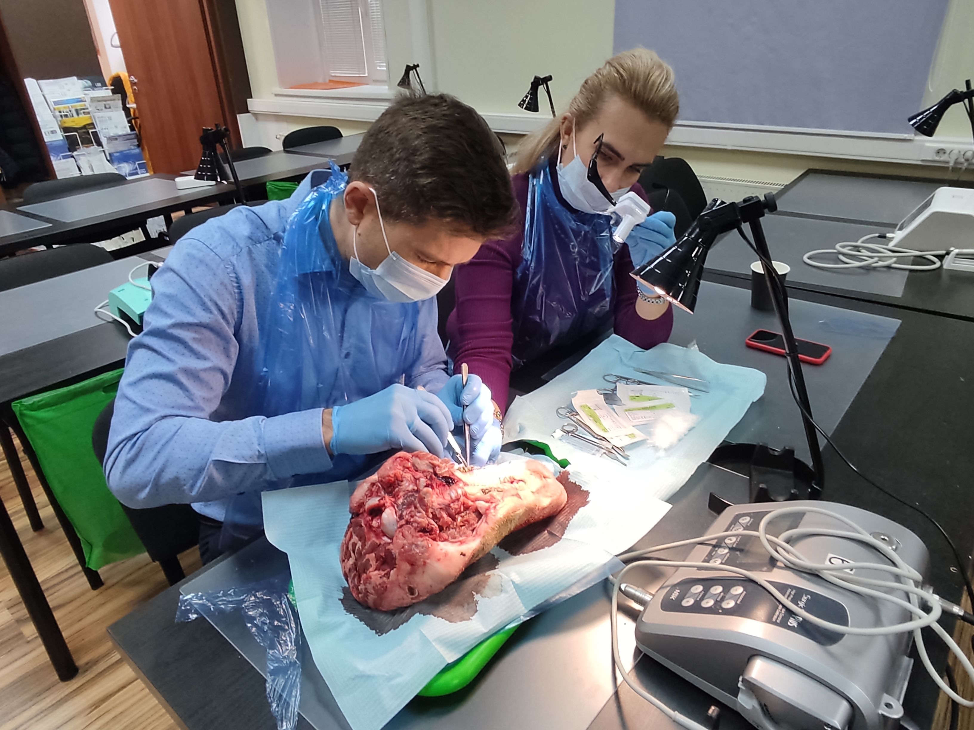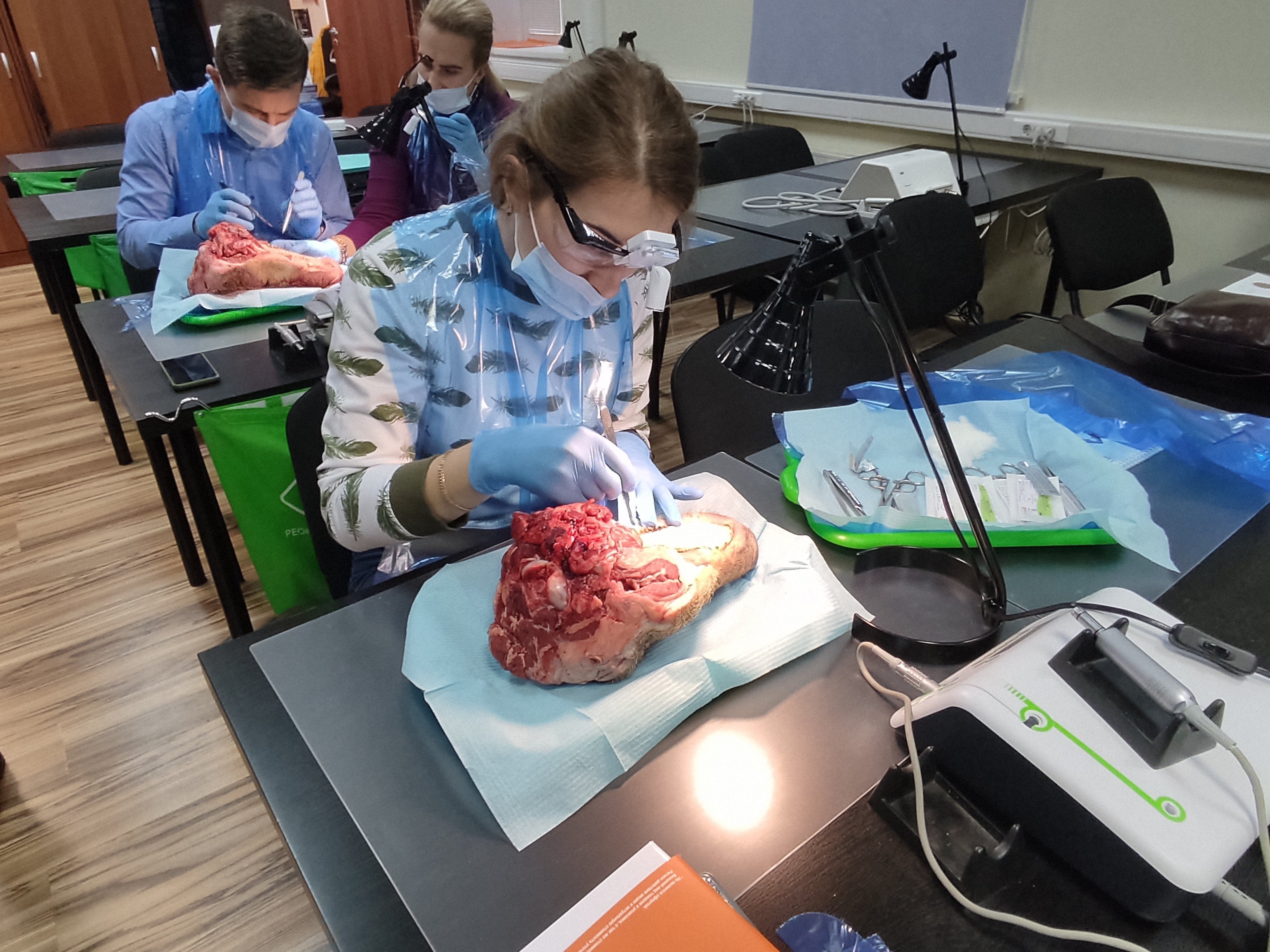 На практической части курса доктора на биологических моделях научились получать десневой трансплантат, СТТ с неба и бугра, штрипсы и ротационный лоскут с неба. Учились выполнять вестибулопластику по Казанджану и по Кларку, изучили на практике методику Палаччи и технику апикально-смещенного лоскута.