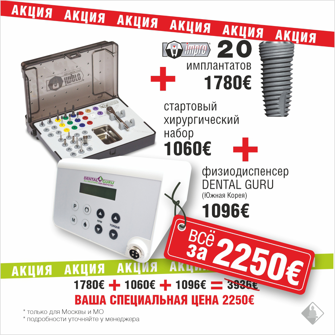 Одна из самых популярных акций из пакетного предложения "Легкий старт" стала еще выгоднее: при покупке 20 имплантатов Impro, стартового хирургического набора Impro и физиодиспенсера Dental Guru Вы экономите 1686€