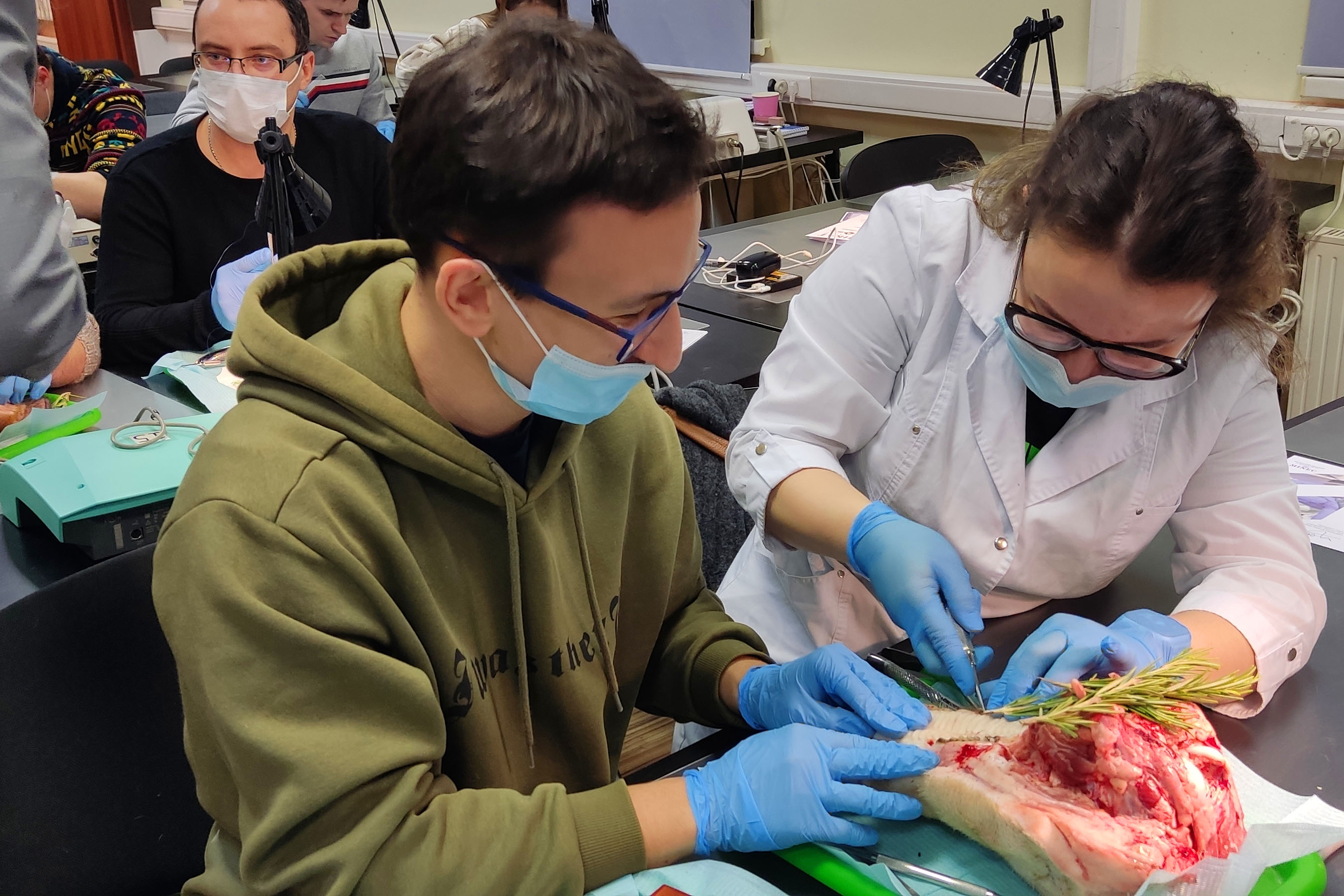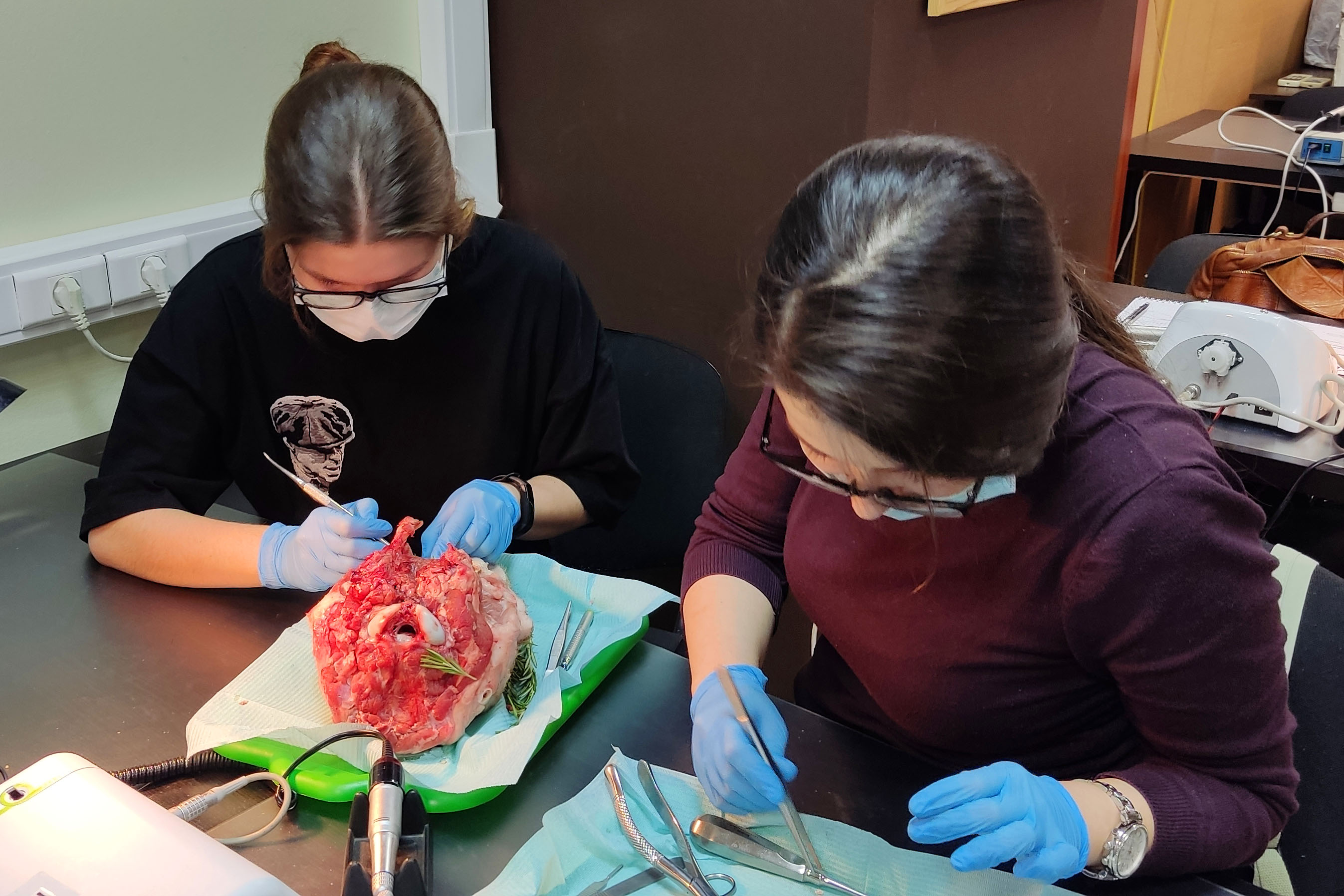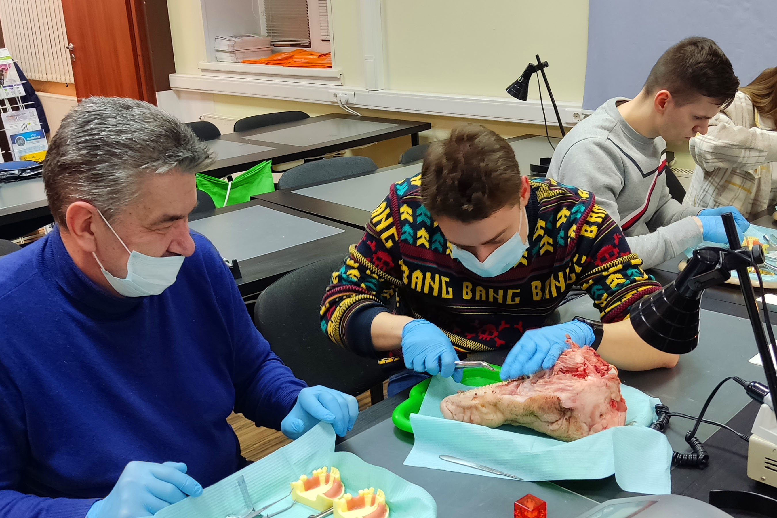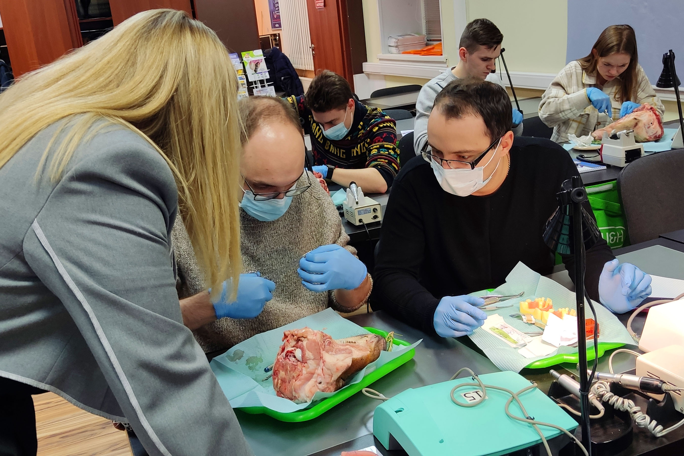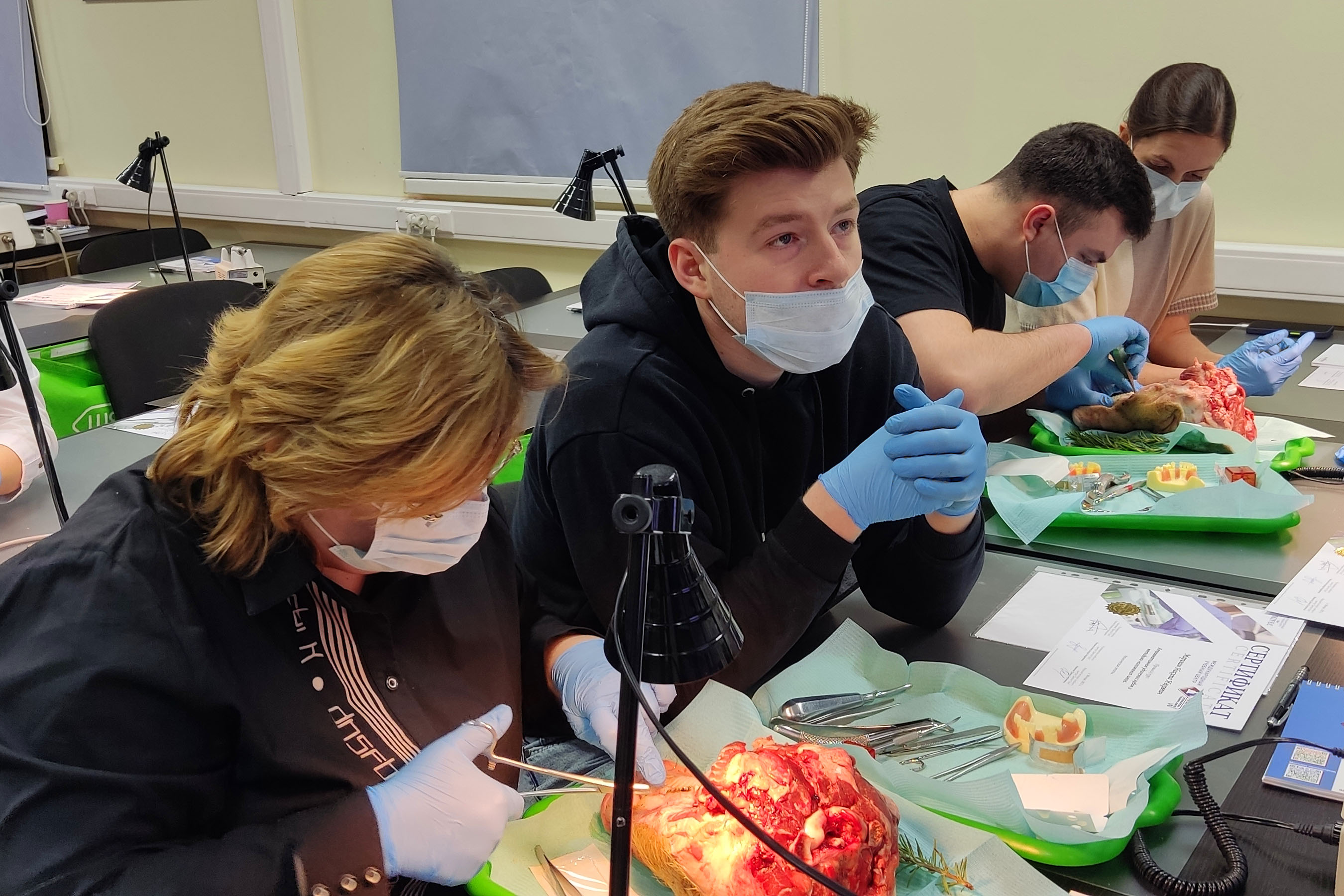 Курсанты овладели щадящим методом удаления зубов, который позволяет докторам предложить пациенту не только удаление, но и установку имплантата сразу же, не вставая с кресла. На практическом занятии курса доктора отрабатывают технику наложения швов на учебных моделях и проводят атравматичное удаление на бараньих челюстях.
