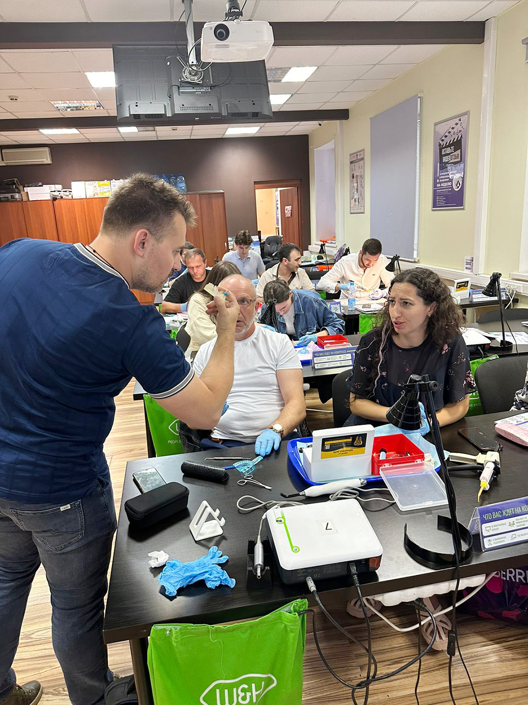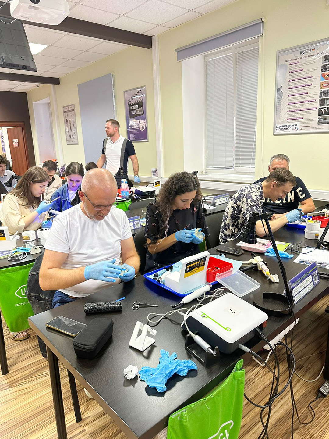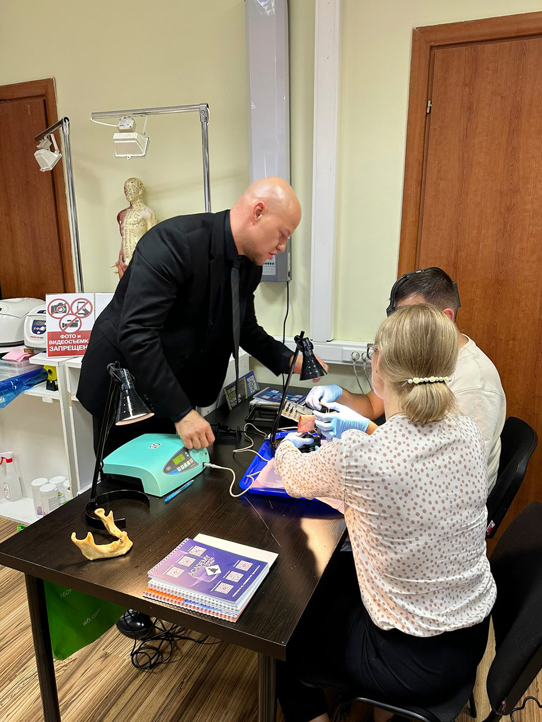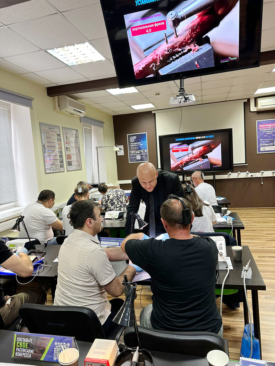 В первый день курса Митюшин Артем Анатольевич рассказал о хирургическом протоколе – о подготовке к операции, оправданности выбора определенного имплантата в зависимости от клинического случая, доктора учились правильно читать рентгеновские снимки и результаты томографических исследований, получать БоФП, накладывать швы различными методиками. Все участники получили практическую возможность отработать полученные знания и установить имплантат на биофантоме.