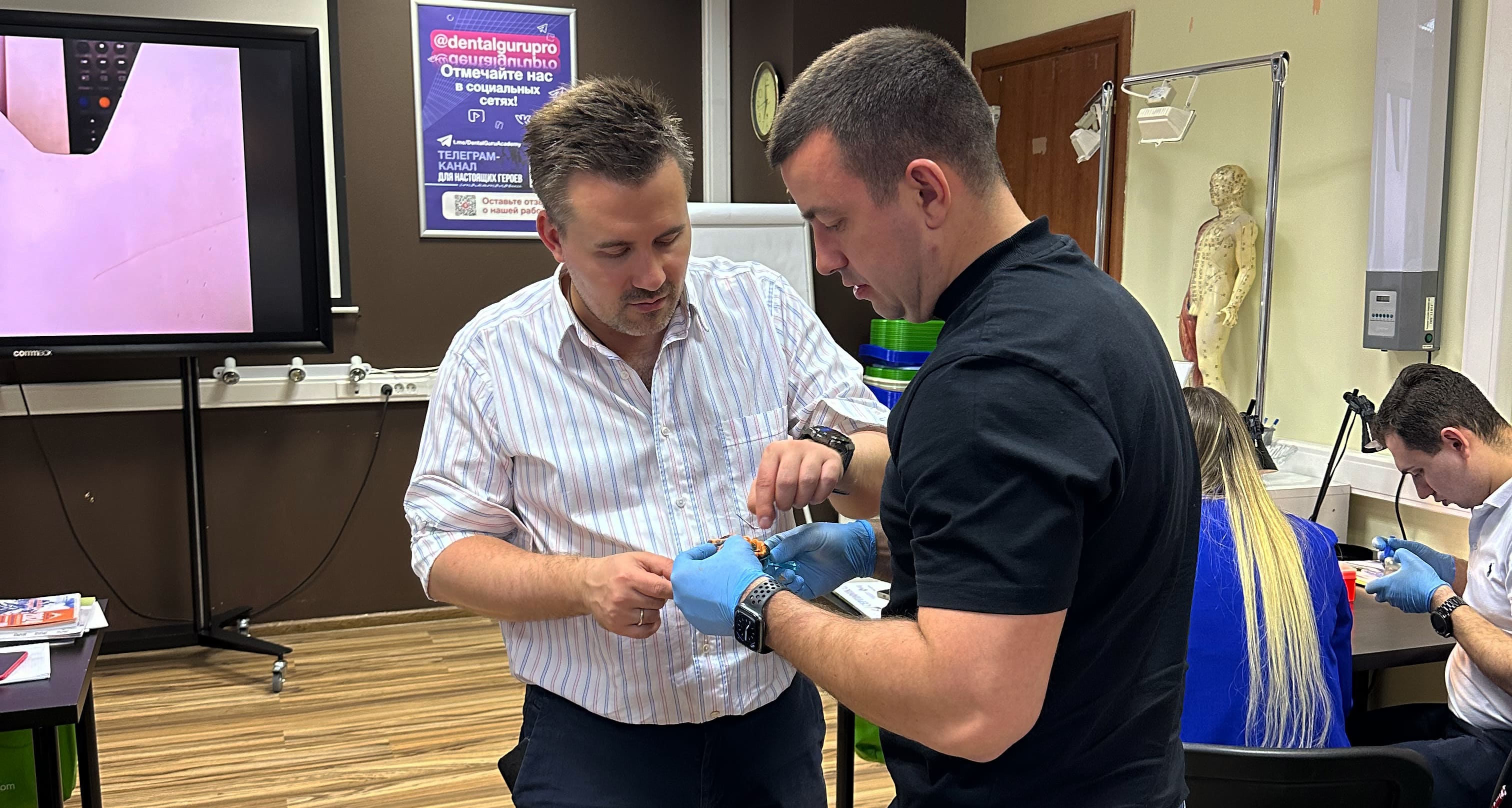 В первый день курса Артем Митюшин рассказал о хирургическом протоколе – о подготовке к операции, оправданности выбора определенного имплантата в зависимости от клинического случая, доктора учились правильно читать рентгеновские снимки и результаты томографических исследований, проводить забор крови, получать БоФП, биомембраны, накладывать швы различными методиками. Все участники получили практическую возможность отработать полученные знания и установить имплантат на говяжьем ребре.