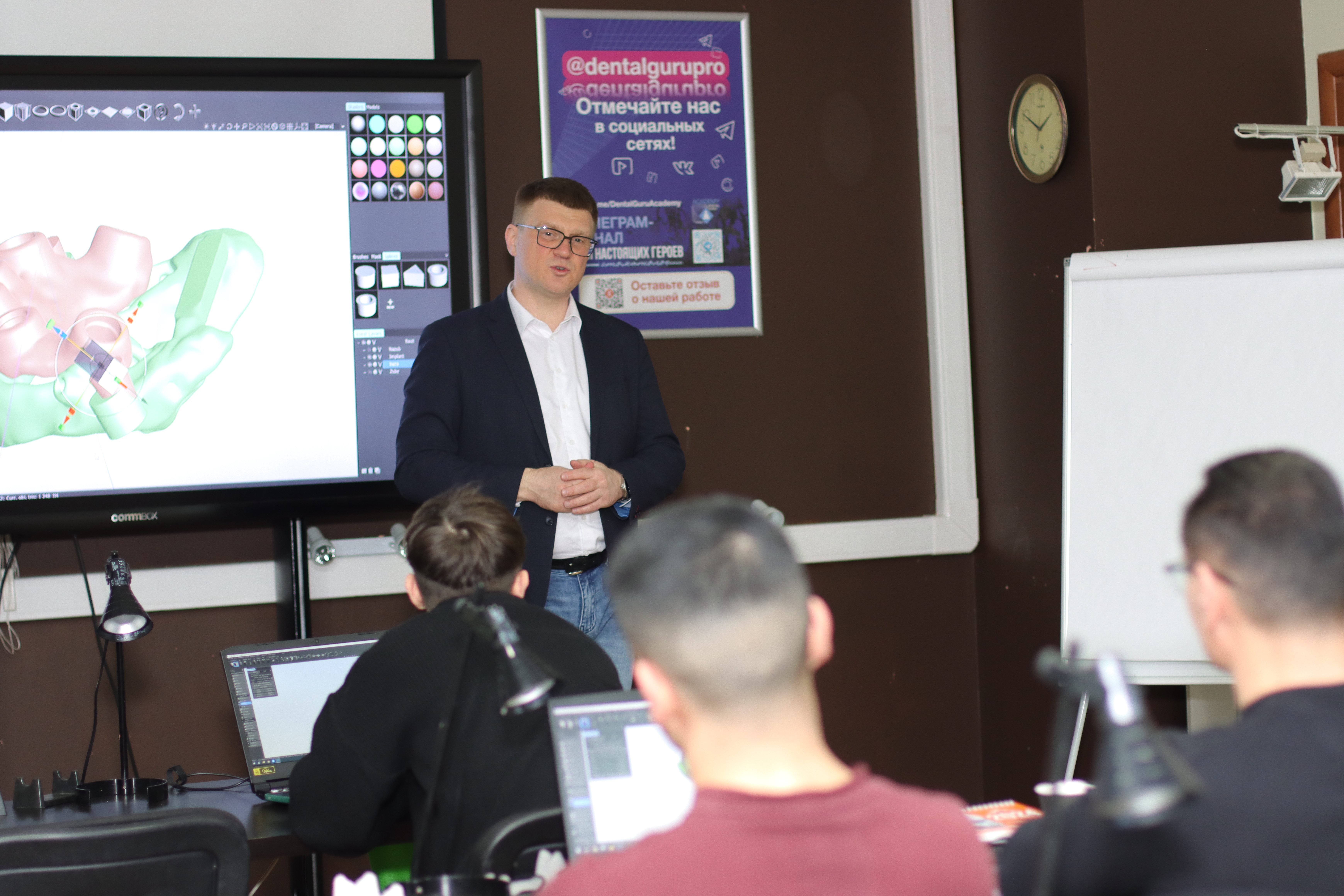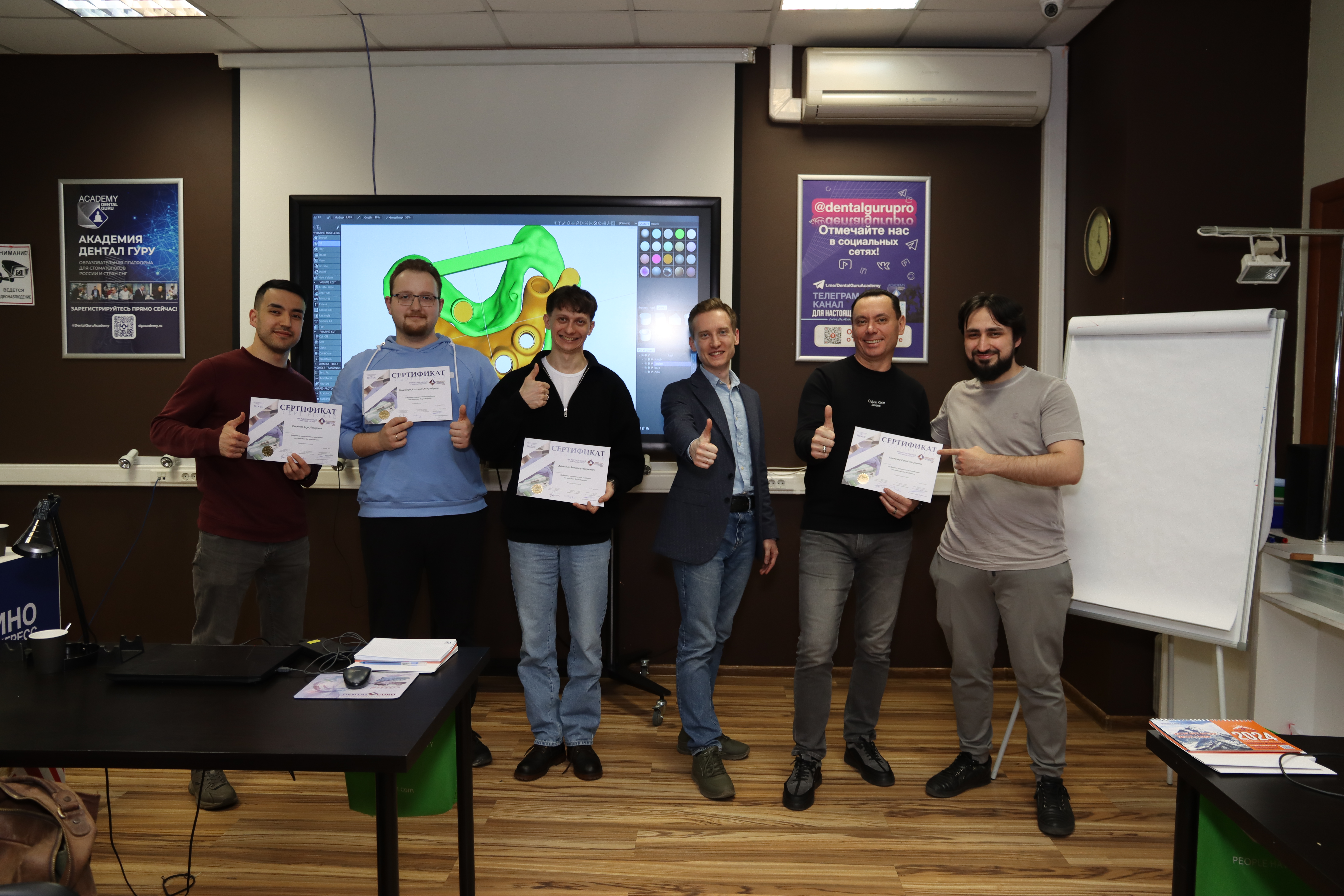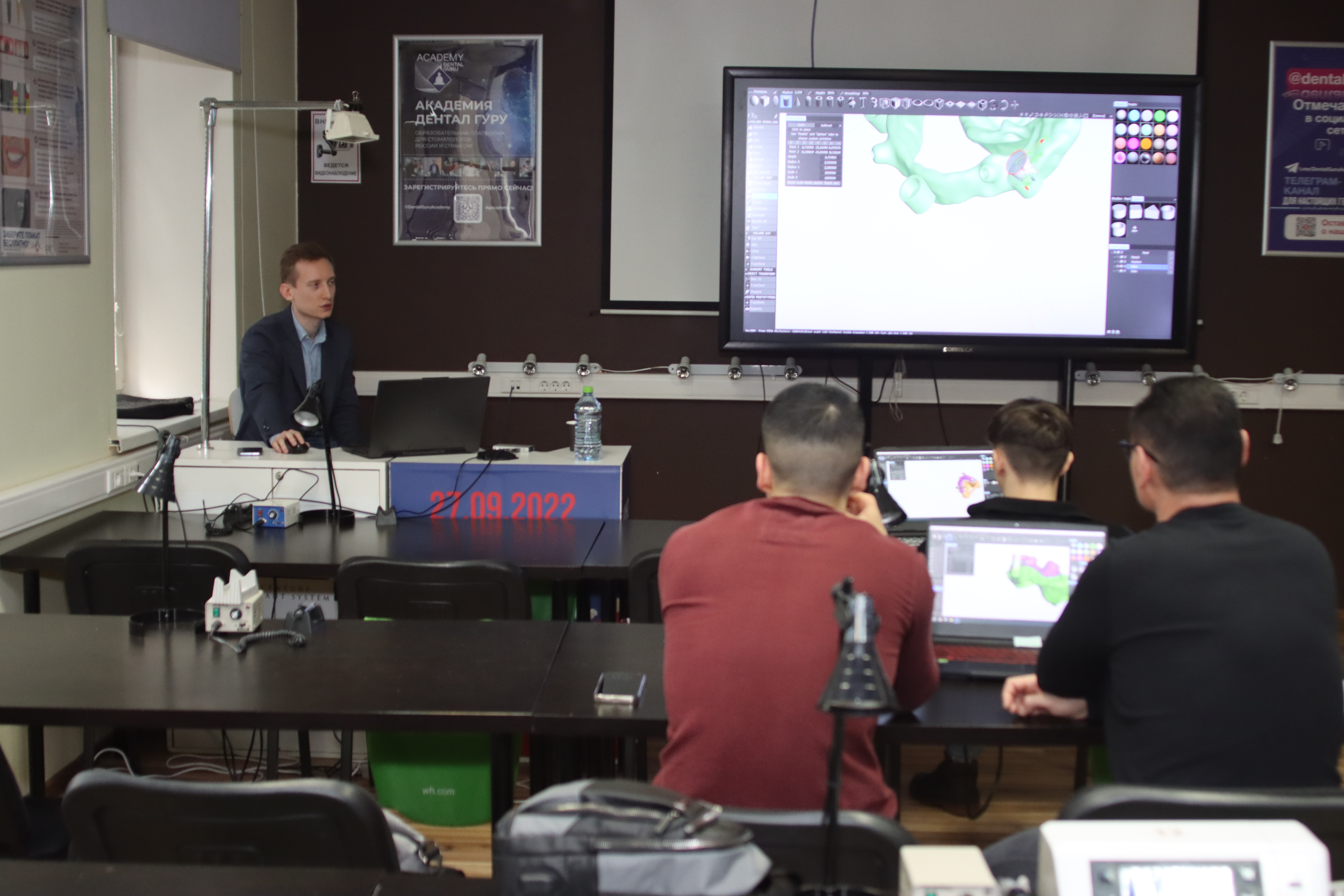 На практической части доктора овладели практическими навыками моделировки хирургического шаблона с назубной фиксацией и под полный протокол в программе 3Shape Implant Studio и 3Shape Dental Design, а также научились моделировать хирургический шаблон с удалением зуба и немедленной нагрузкой одиночной реставрацией, при полной адентии с пиновой фиксацией, при тотальной имплантации c немедленной нагрузкой и провизорной реставрацией.