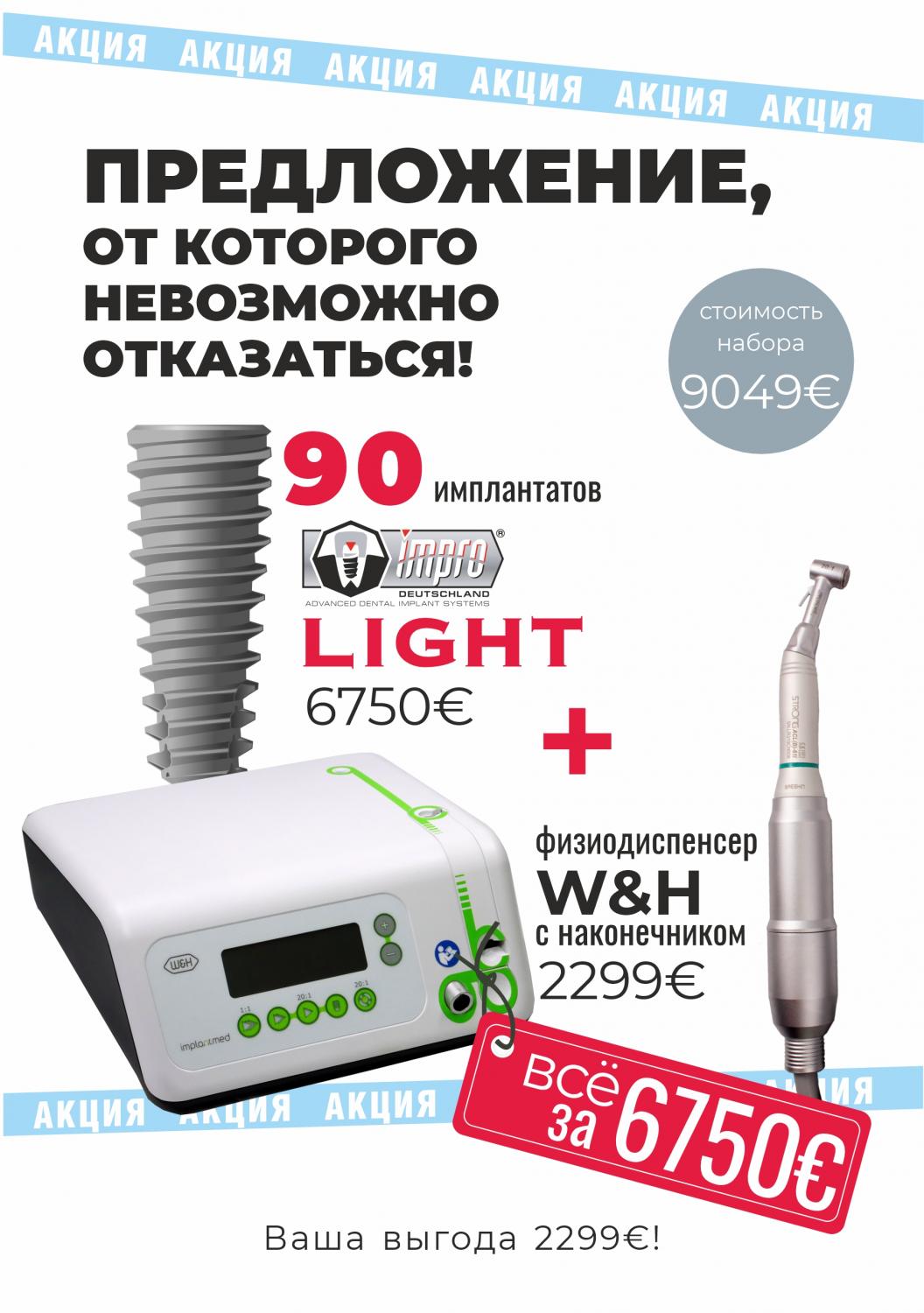 При покупке 90 имплантатов Impro light Вы получаете физиодиспенсер W&H с наконечником в подарок. Ваша выгода €2299!