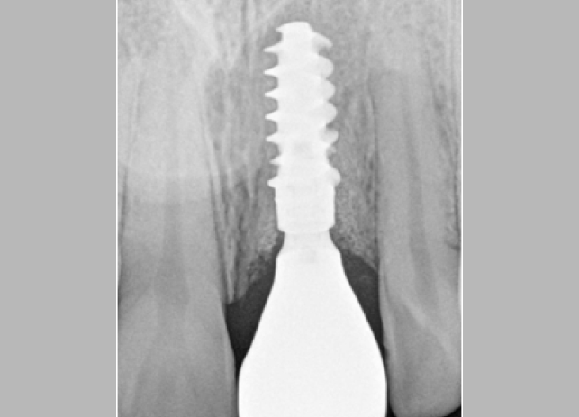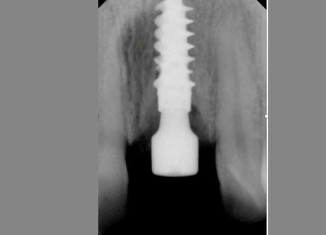 Коронка была установлена со значительным сопротивлением для достижения необходимого значения торка. Ущемление твердых и мягких тканей из-за очень острого профиля выступа вызывает давление на кость, что приводит к некрозу и, в конечном итоге, к потере маргинальной кости в этой области. Чтобы избежать подобных осложнений, необходимо выбирать правильный абатмент.
