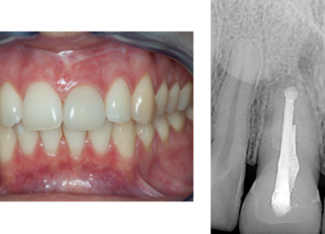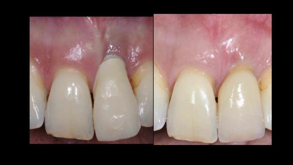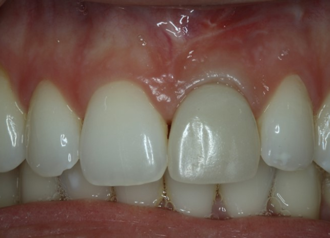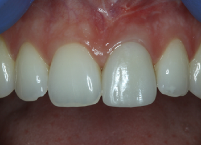 Рис. 9 и 10 после начального заживления временная коронка была адаптирована с помощью композита для тренировки и формирования мягких тканей, аналогично прилегающему правому центральному резцу. Нашей целью также было добиться одинаковой длины 11 и 21 зубов или выровнять высоту десны