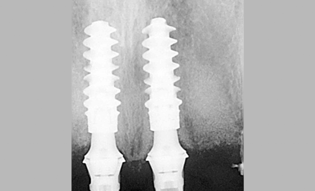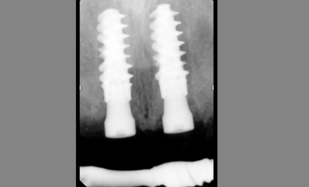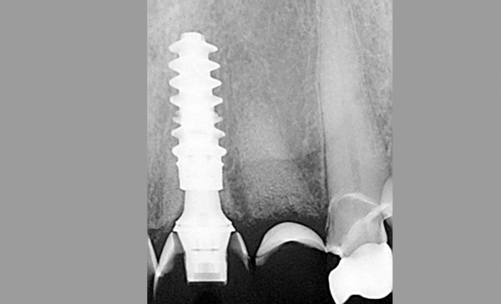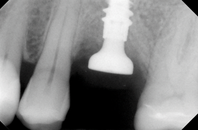 Этот пациент обратился ко мне с жалобами на сильную боль, покраснение и отек вокруг только что установленной коронки на имплантате. В анамнезе было следующее: был снят аналоговый оттиск с уровня имплантата и отправлен в лабораторию для изготовления коронки. У лаборанта не было указаний относительно расположения шейки имплантата по отношению к мягким тканям и кости.