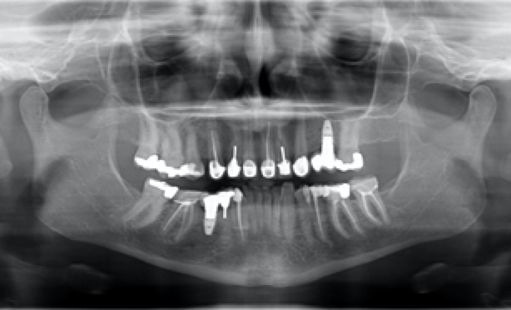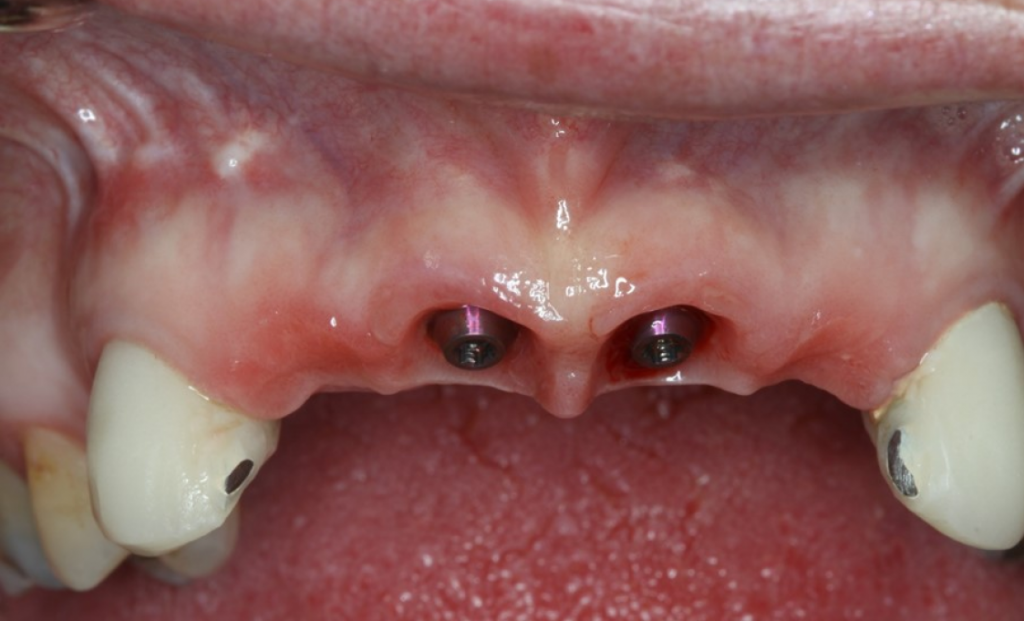 Клинический пример: пациент сломал левый центральный резец и решил удалить все четыре передних зуба и заменить их коронками с опорой на имплантаты.