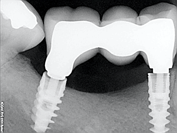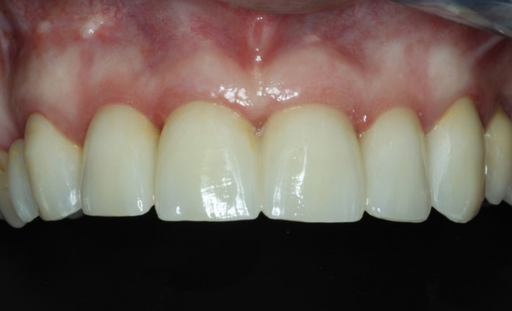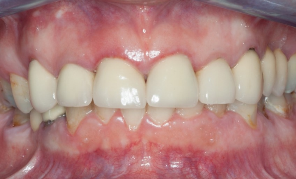 Рис. 23 Итоговый результат лечения с установленным мостовидным протезом 12-22 на имплантатах. Обратите внимание на естественный профиль ткани после извлечения 12, 11, 21 и 21